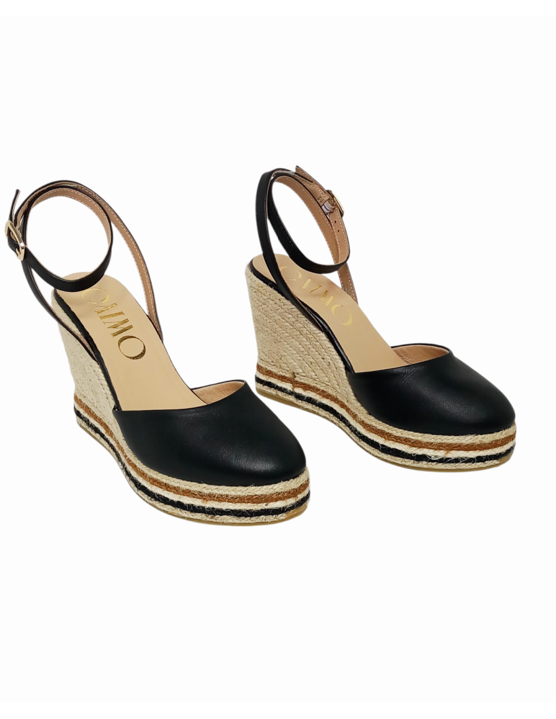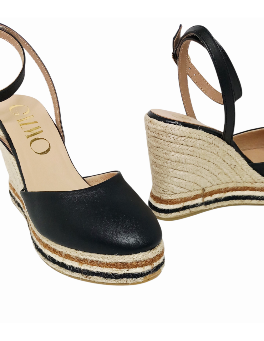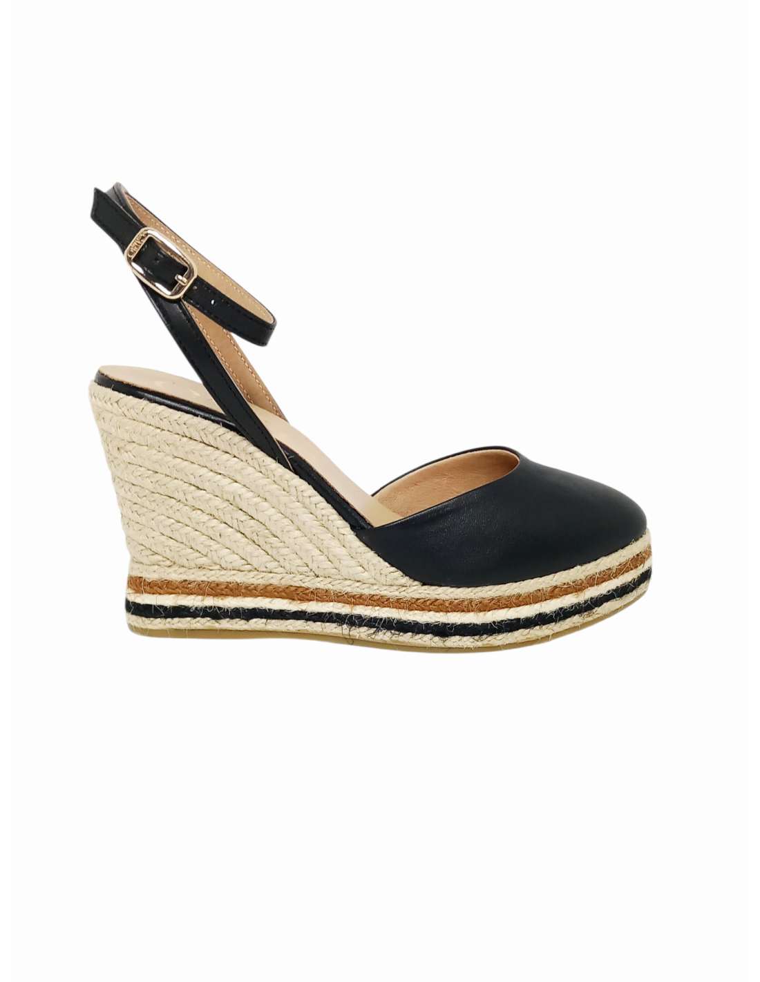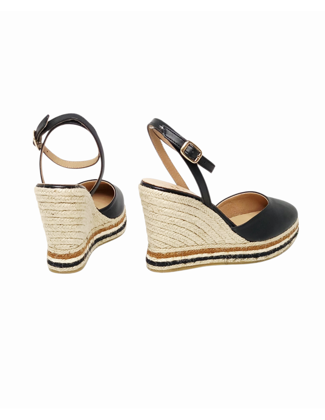 Alpargata de cuña alta fabricada en una suave piel de color negro con detalle de líneas de color en la plataforma.