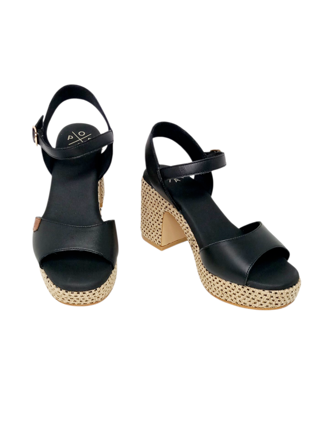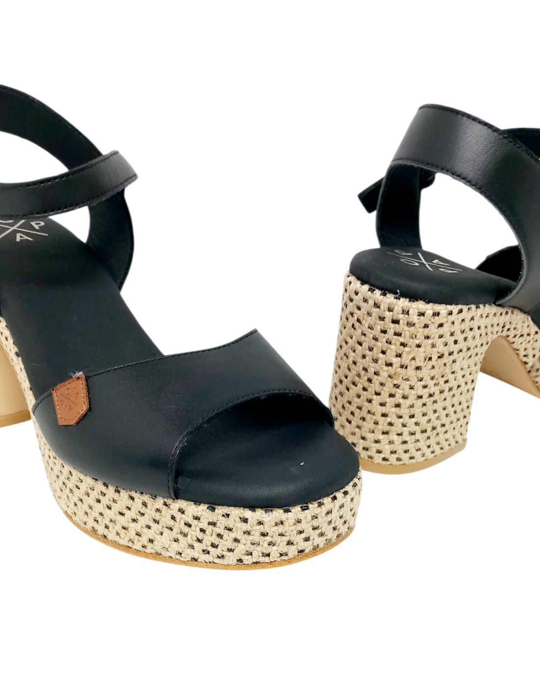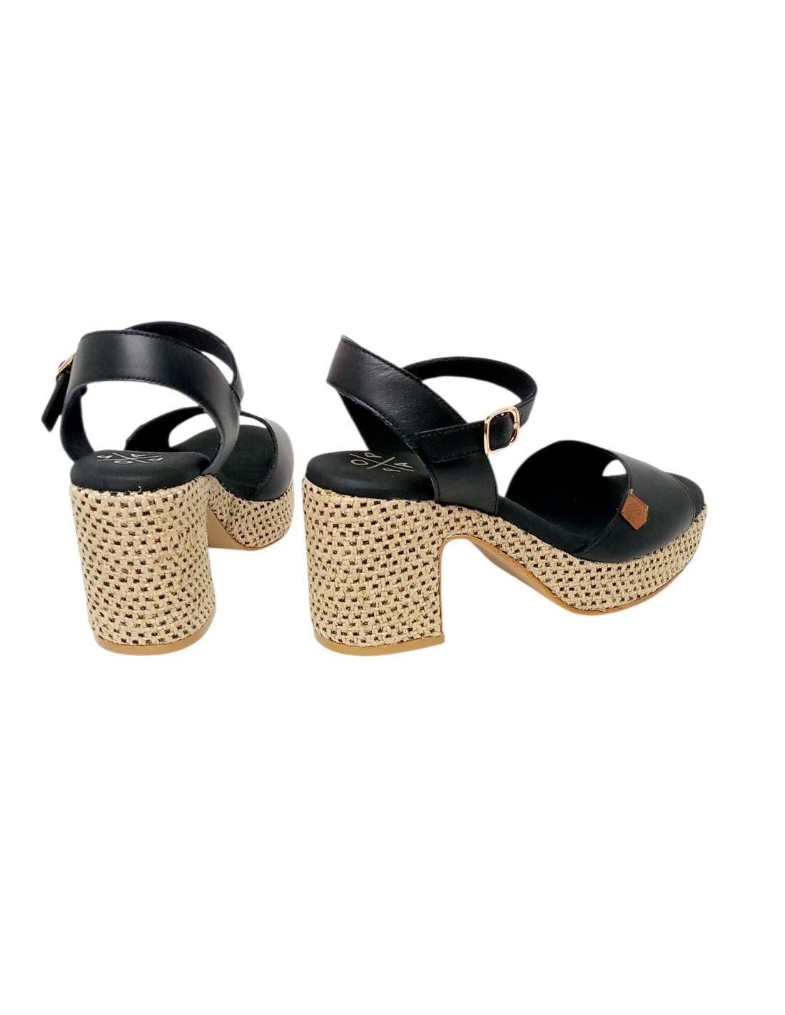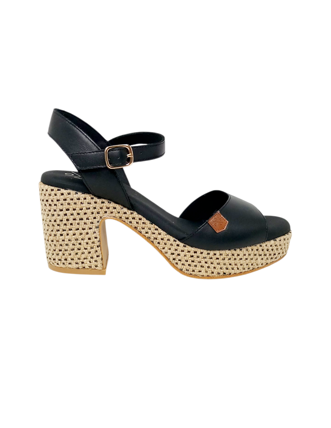 Sandalia fabricada en piel de color negro y yute bicolor. Cuenta con cierre mediante hebilla al tobillo.