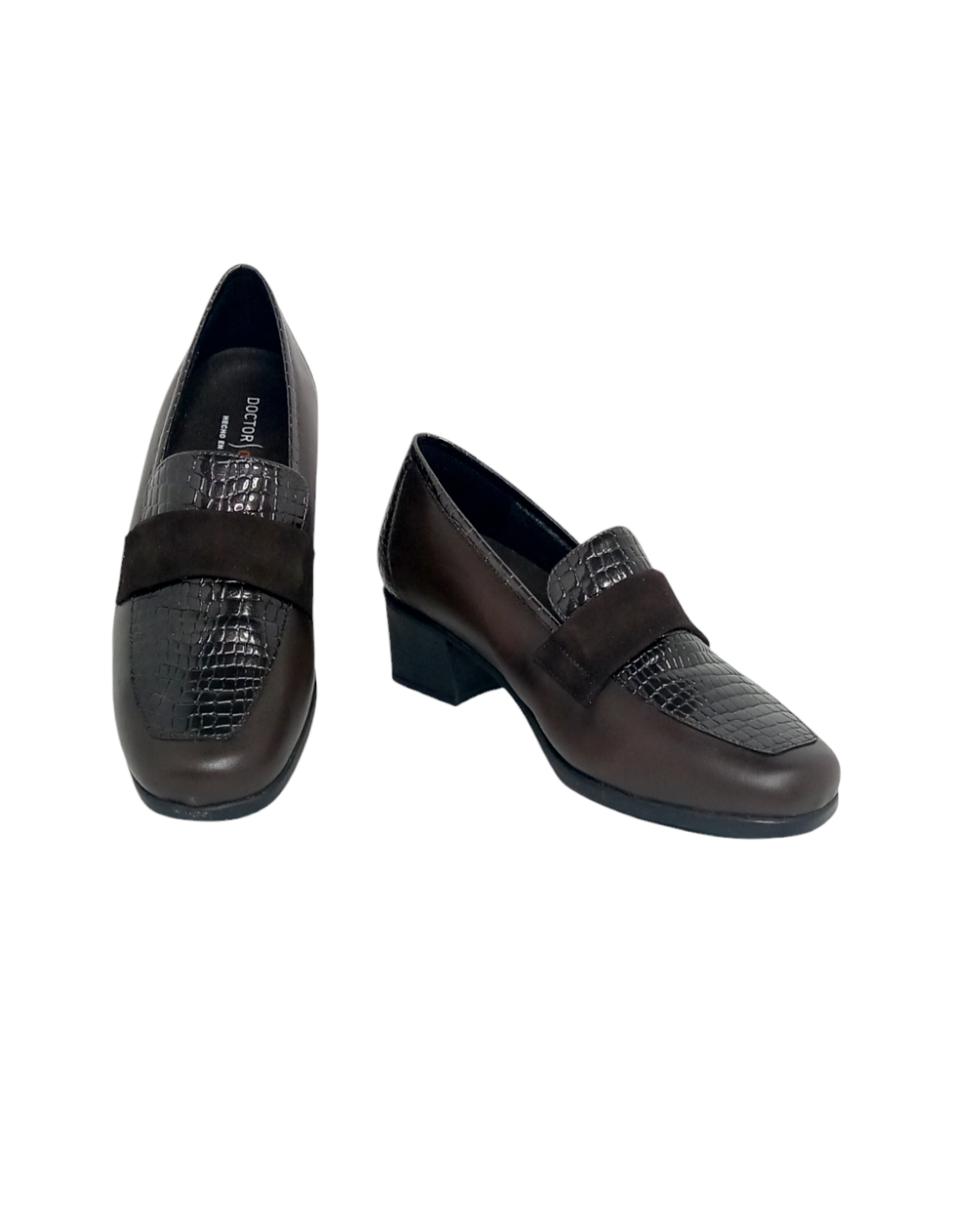 Mocasín subido tipo copete, de ancho especial, en colores marrón y negro. Está fabricado con una combinación de piel lisa y grabada con acabado charol en el empeine, además de una tira de serraje.