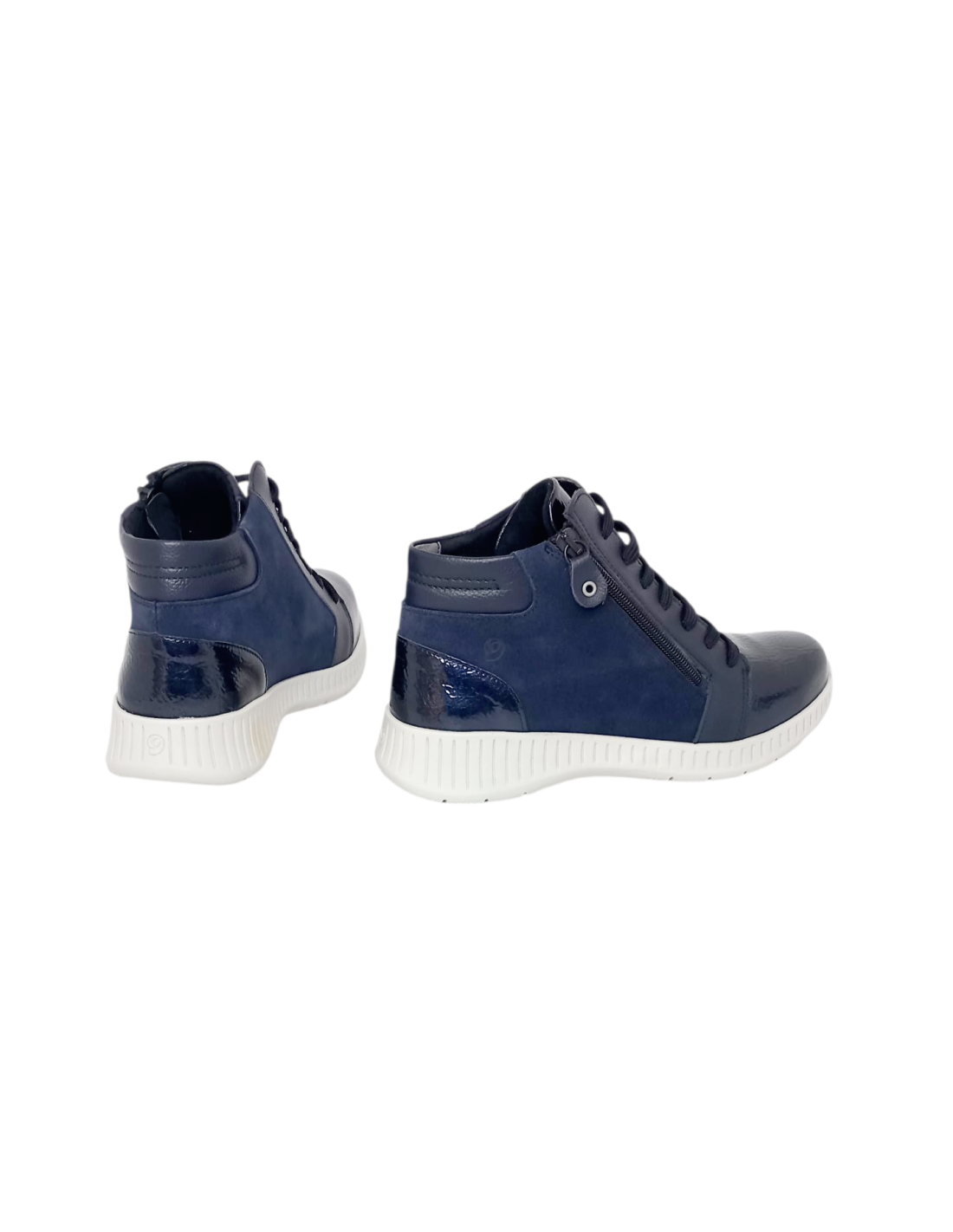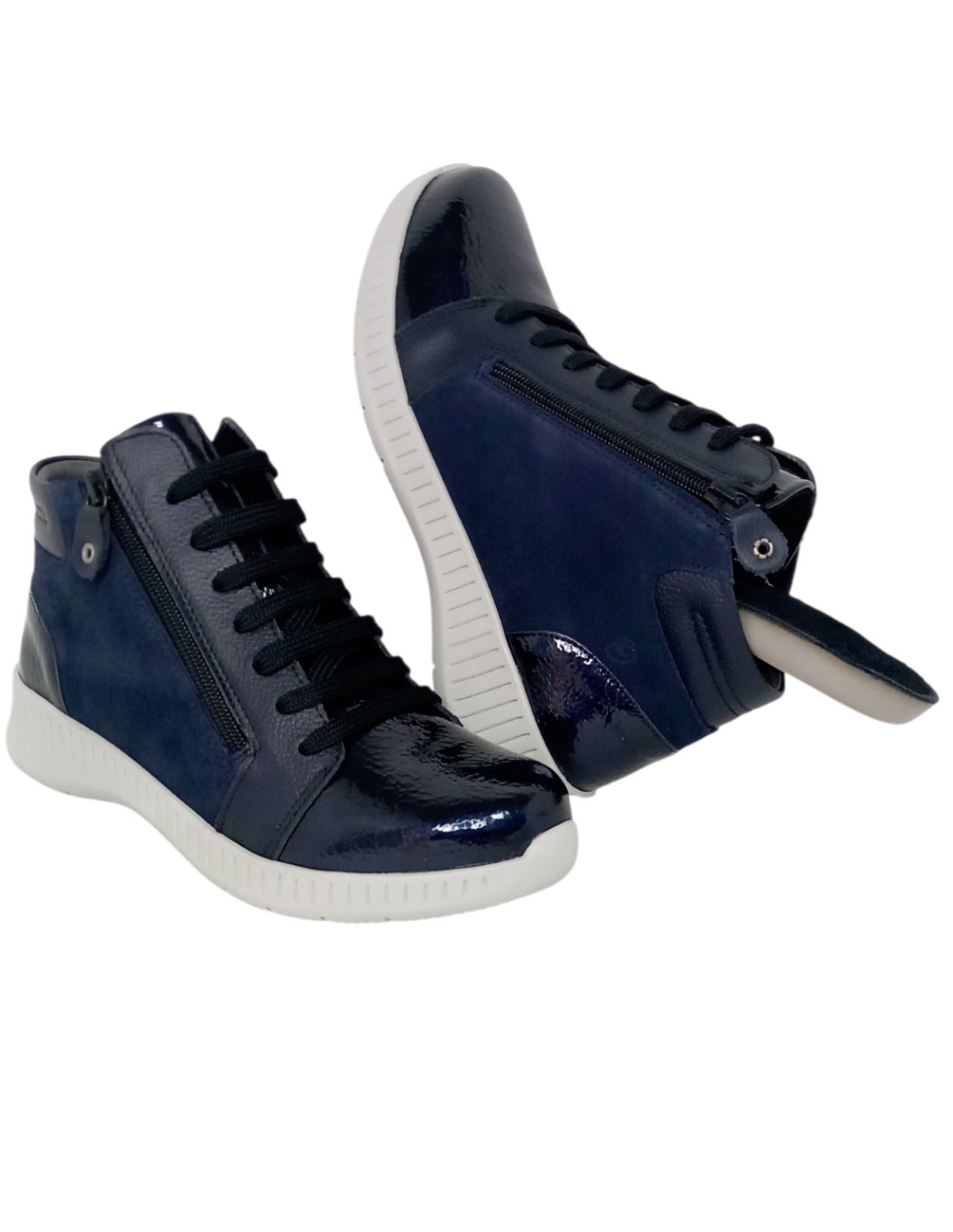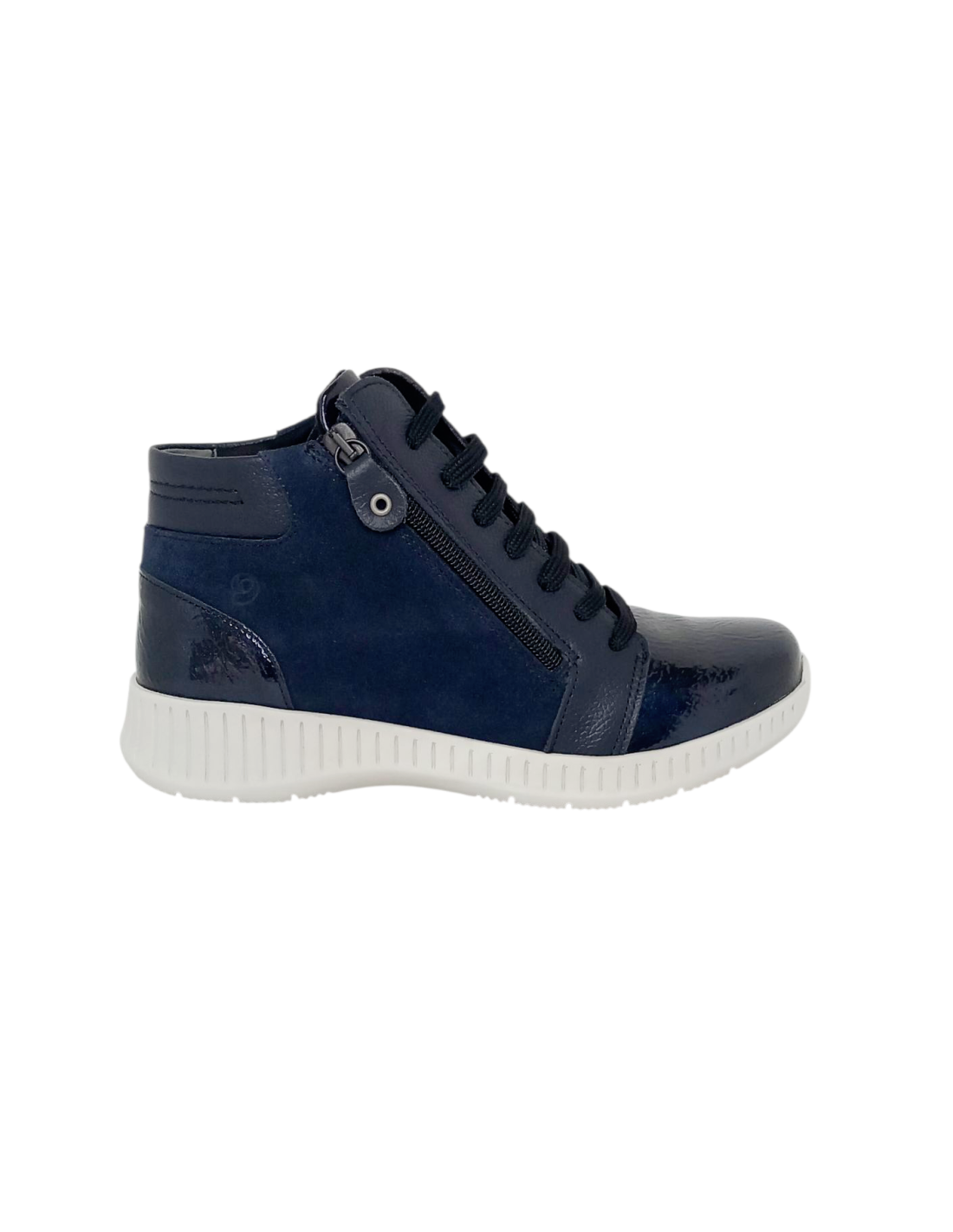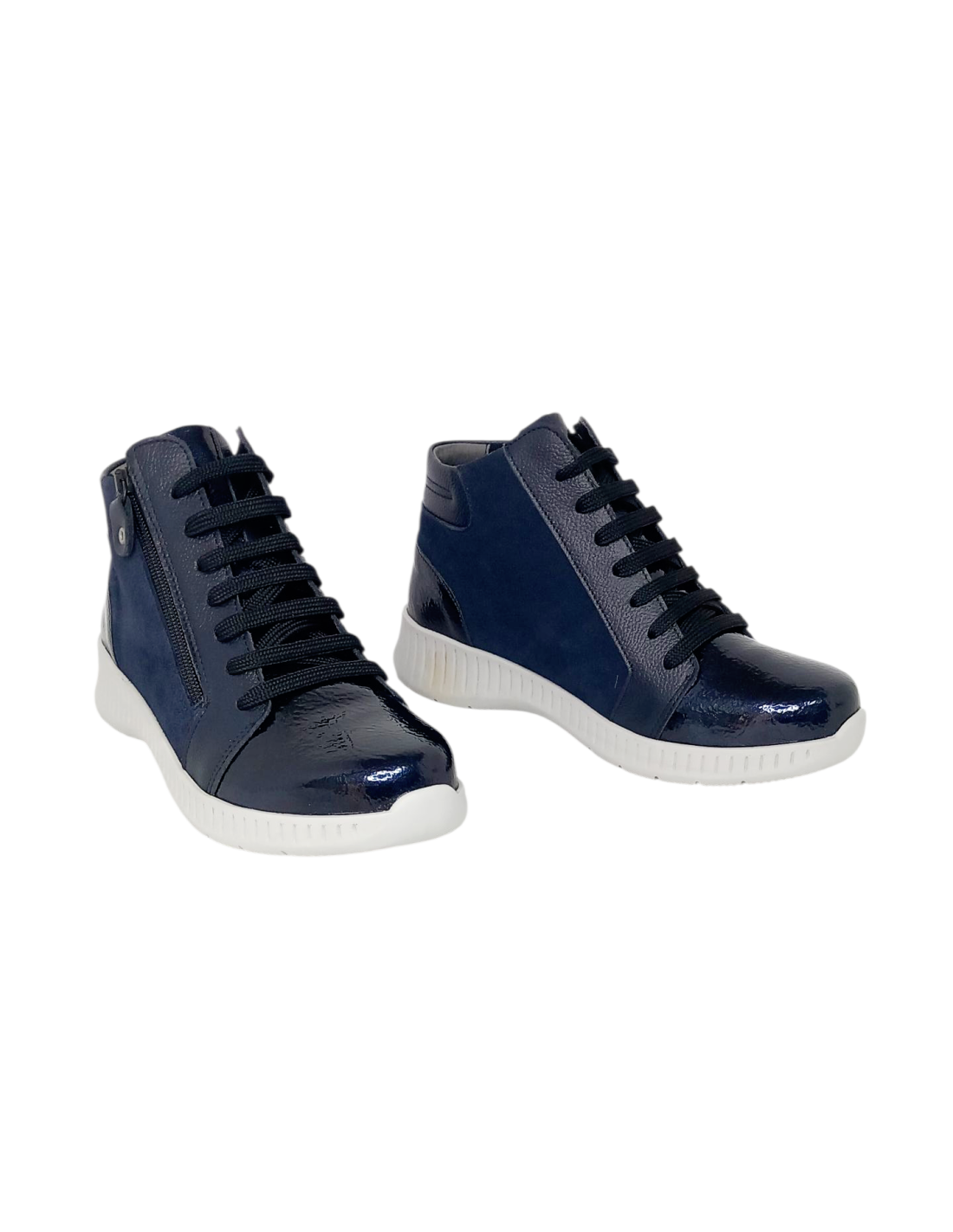 Botín fabricado en piel, con combinación de ante y charol de primera calidad en color azul marino. Horma ANCHO ESPECIAL.