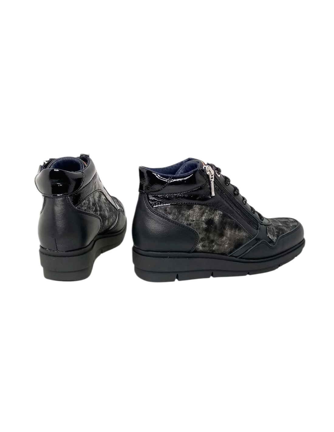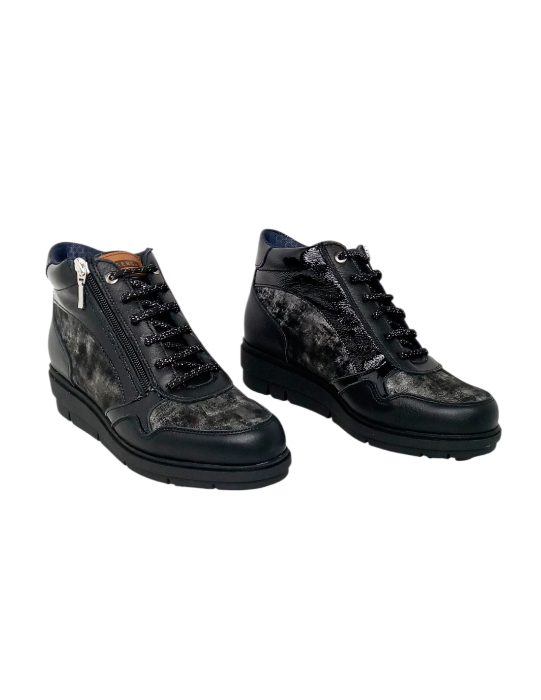 Fabricado en pieles de vacuno de primera calidad en tono negro y gradado con toques en gris plomo. Cierre mediante cordonera central y cremallera lateral exterior, para un mejor calce.