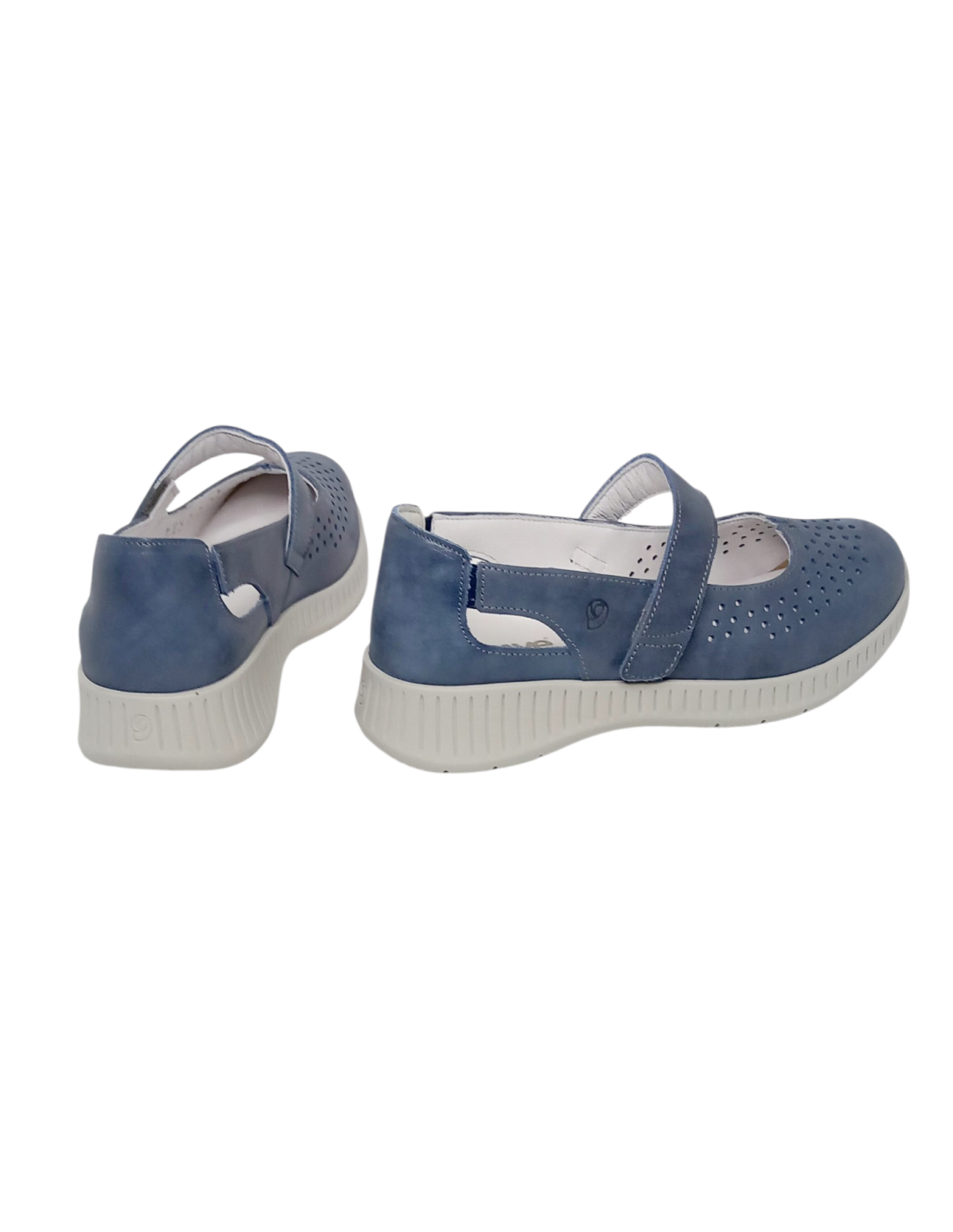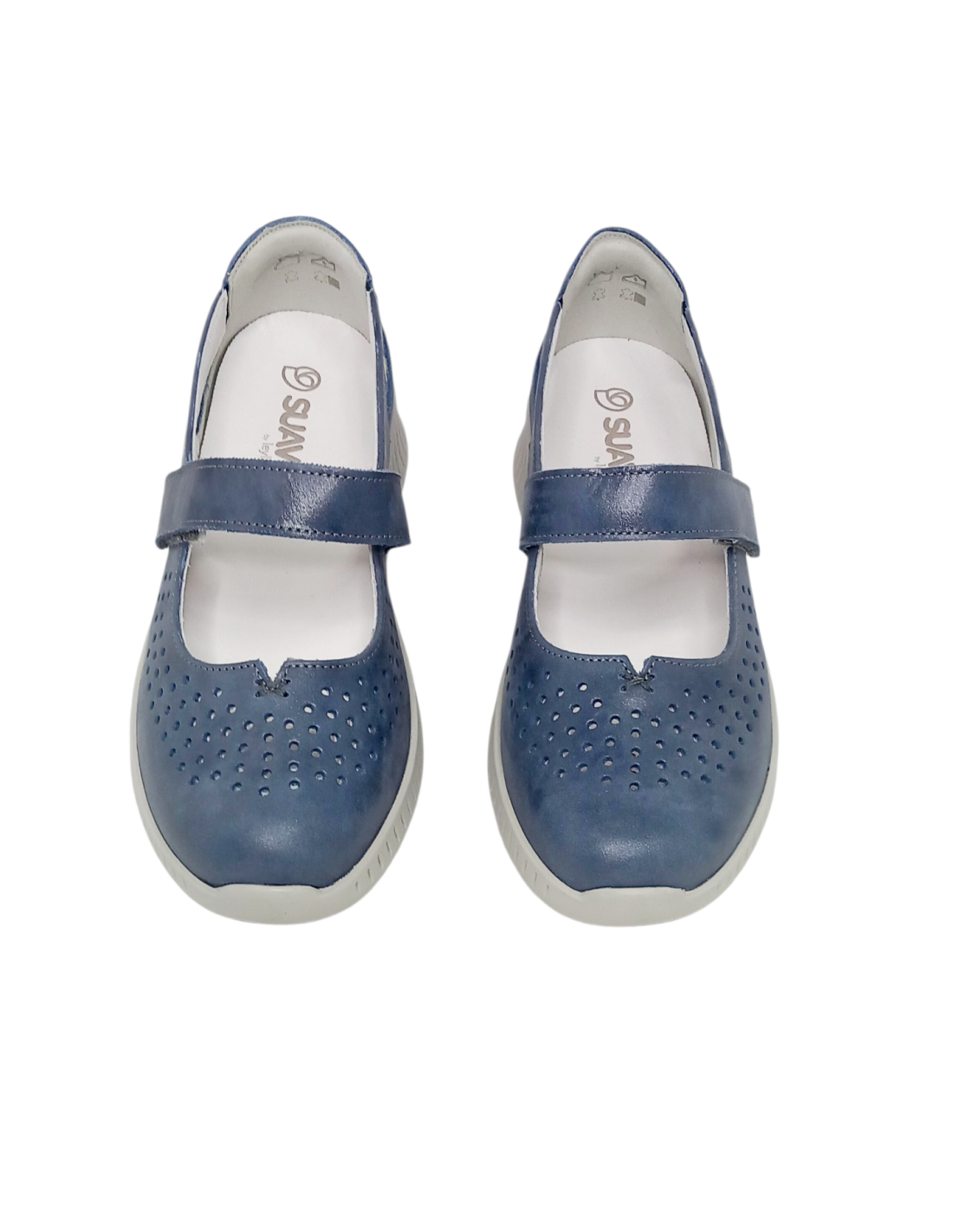 Zapato estilo bailarina de ANCHO ESPECIAL, fabricado en una combinación de piel natural de color azul con acabado ligeramente brillante. La parte delantera está troquelada, lo que lo convierte en un zapato fresco para el verano, y además lleva una pequeña abertura en la zona del escote que evita que si los pies se hinchan el zapato se clave en esa zona del pie.