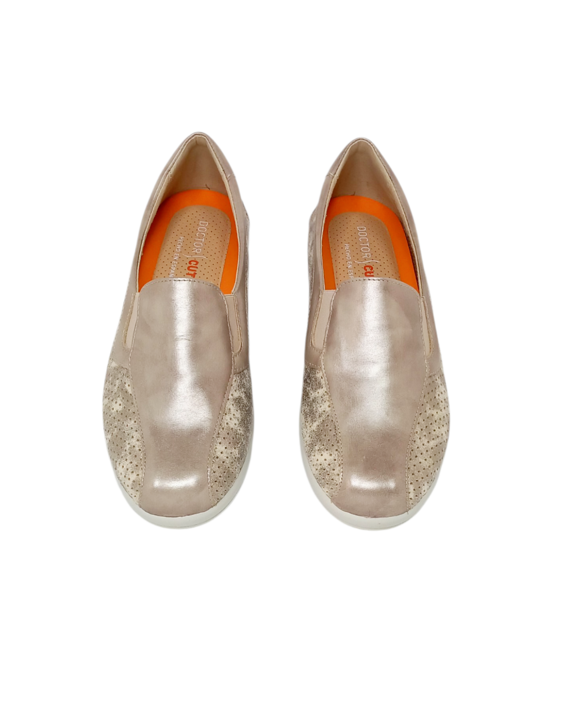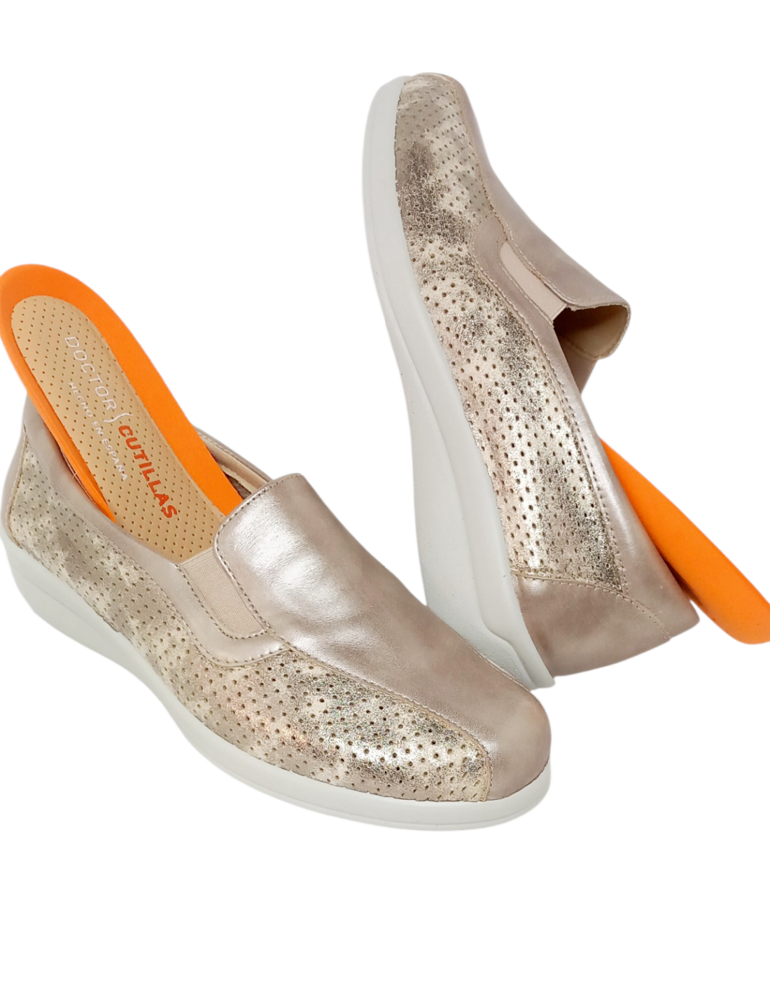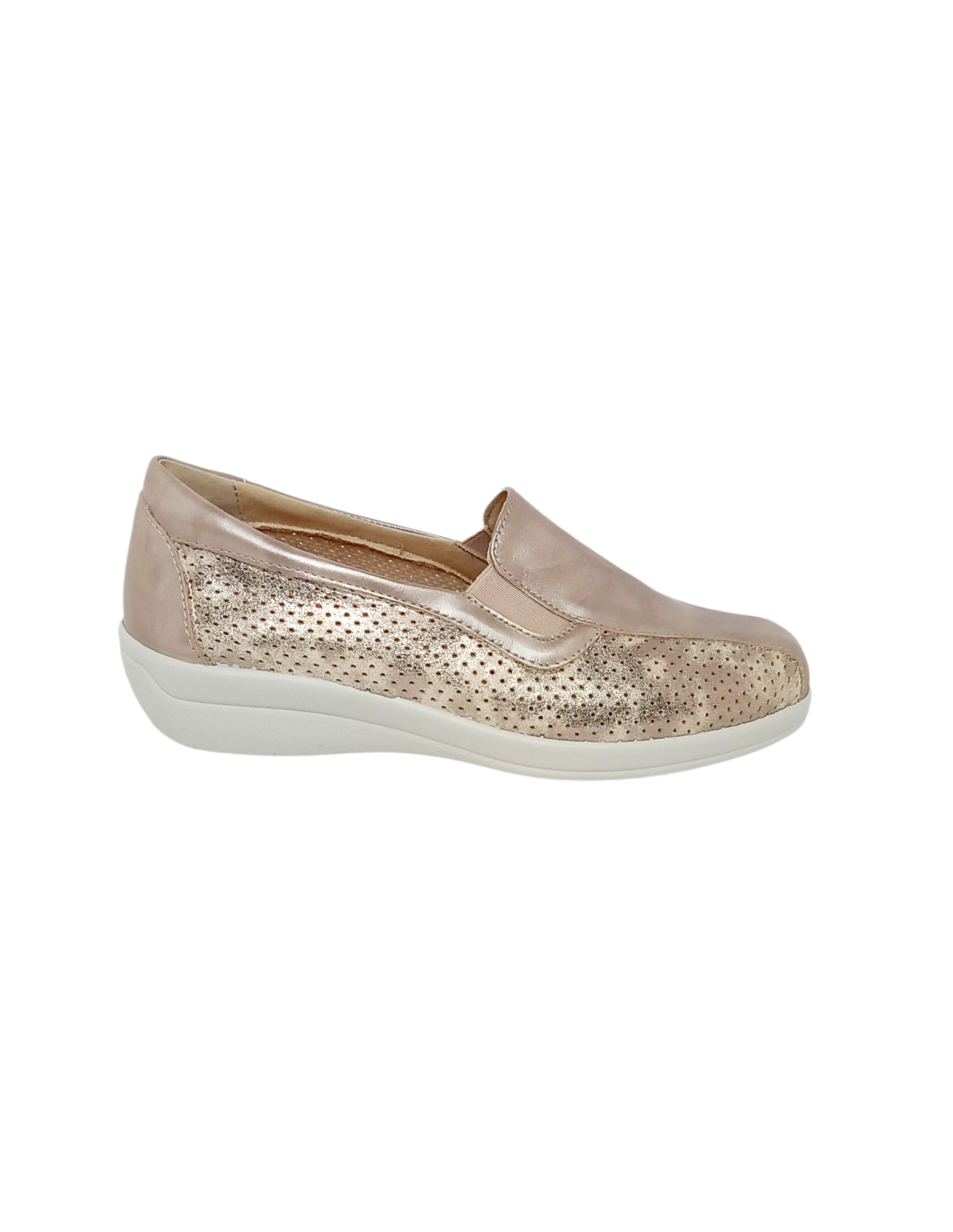 Mocasín de horma ancha en color dorado champán, fabricado en piel vegana suave y microperforada en los laterales, que favorece al máximo la transpiración, por lo que es el aliado perfecto para los días de calor.