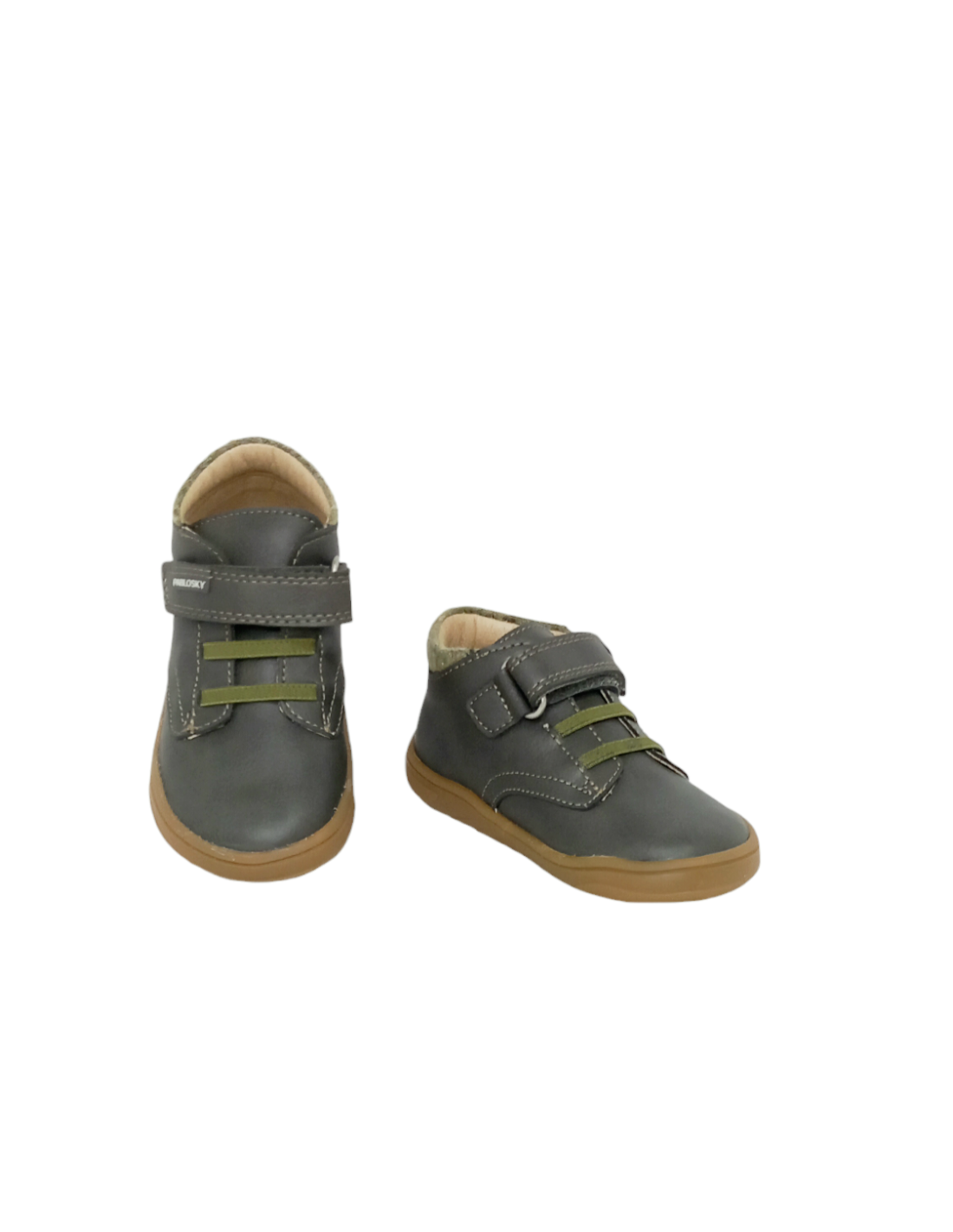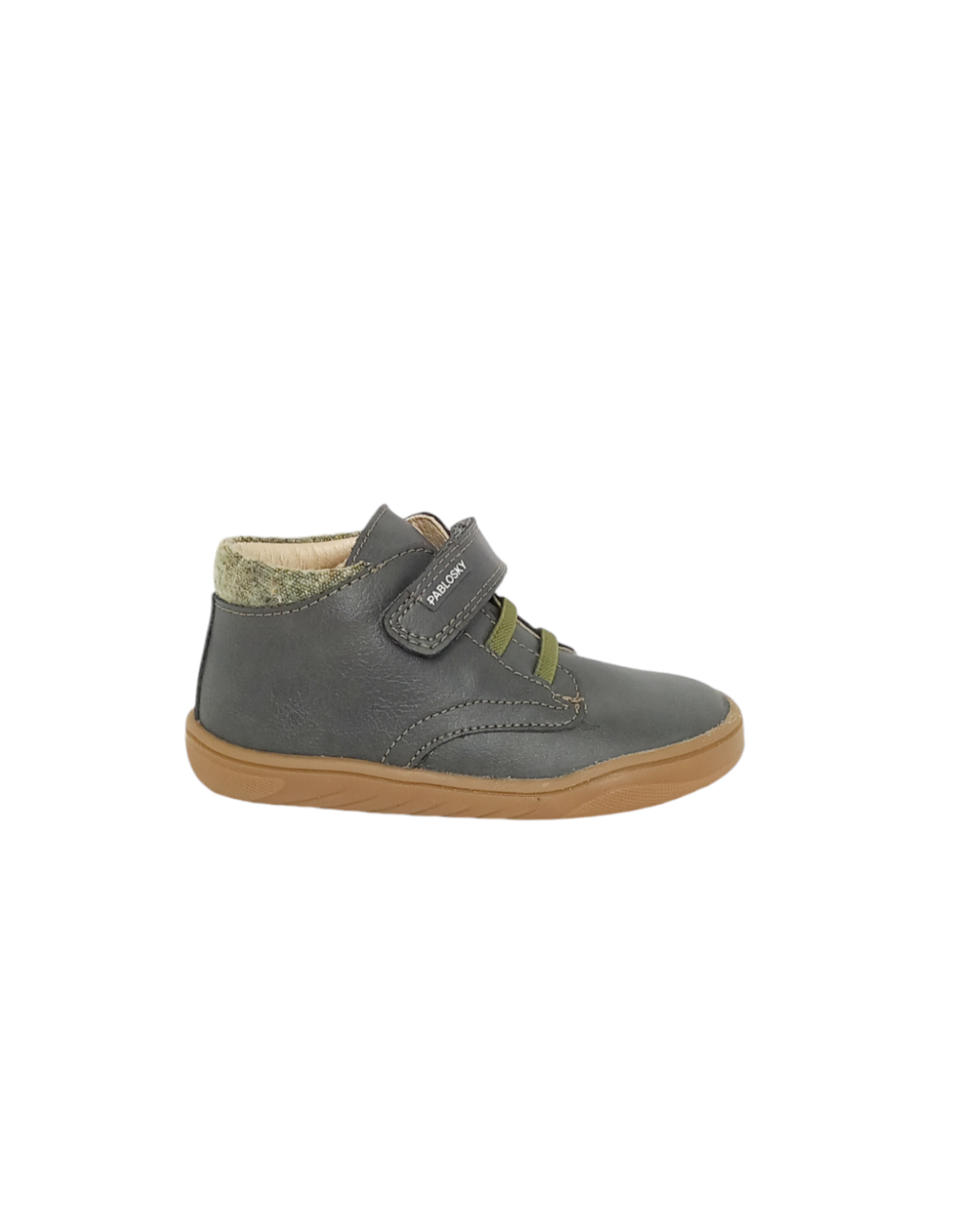Botita de color gris con detalles en color verde kakhi. Es un modelo súpero blandito para proporcionar el máximo confort a los pequeños de la casa durante este etapa tan importante de su crecimiento, pero lo suficientemente resistente para aguantarles el ritmo. Calzado respetuoso, también llamado "Barefoot".