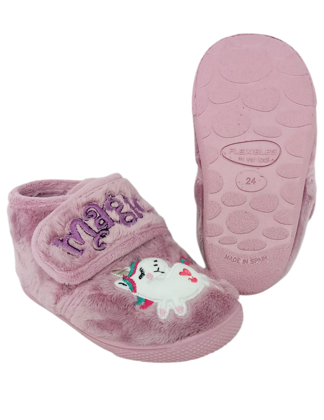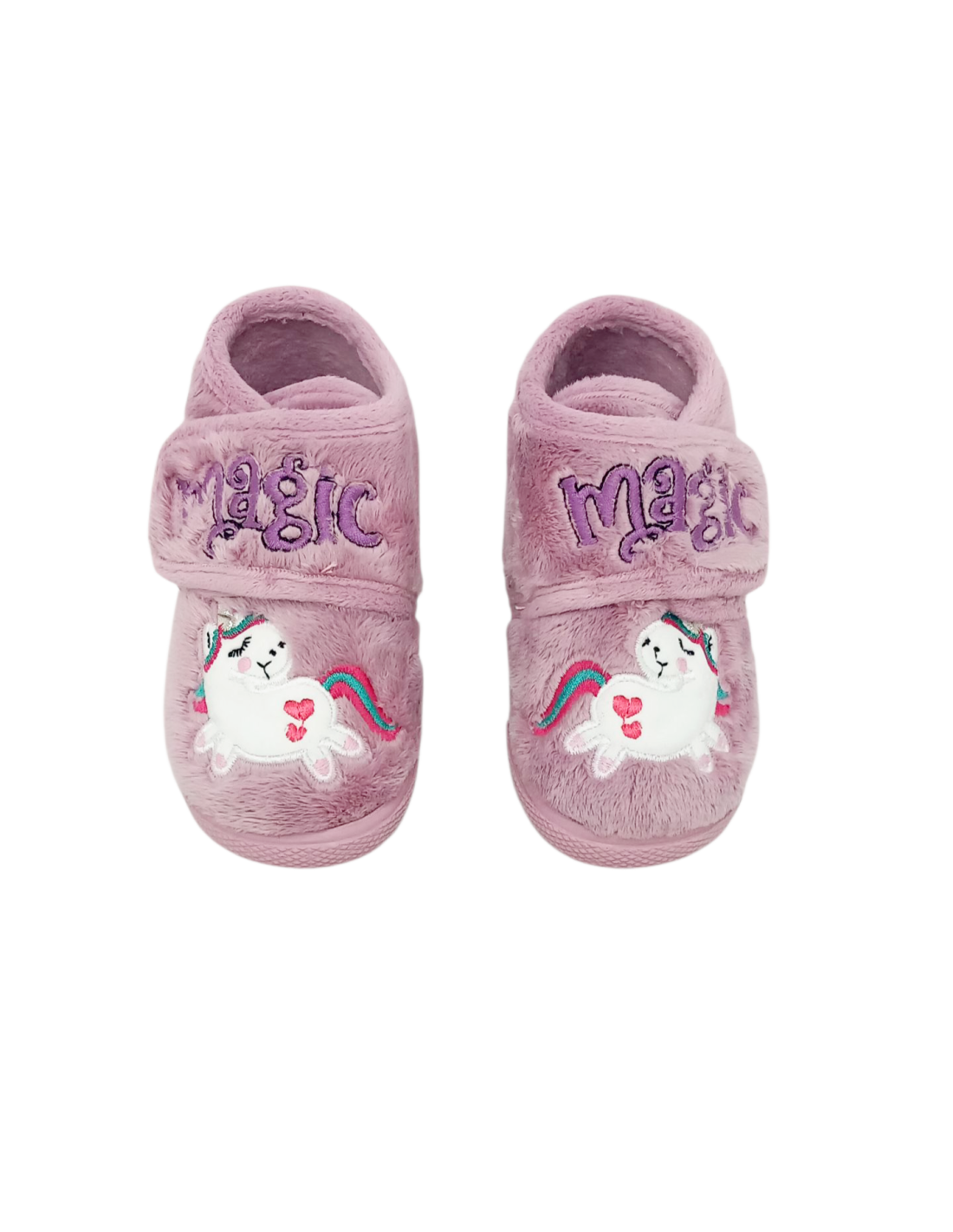 Zapatilla de casa abotinada y calentita para niñ@ en color rosa con cierre de velcro y divertido dibujo estampado de unicornio, con la palabra "magic" bordada en la parte frontal.