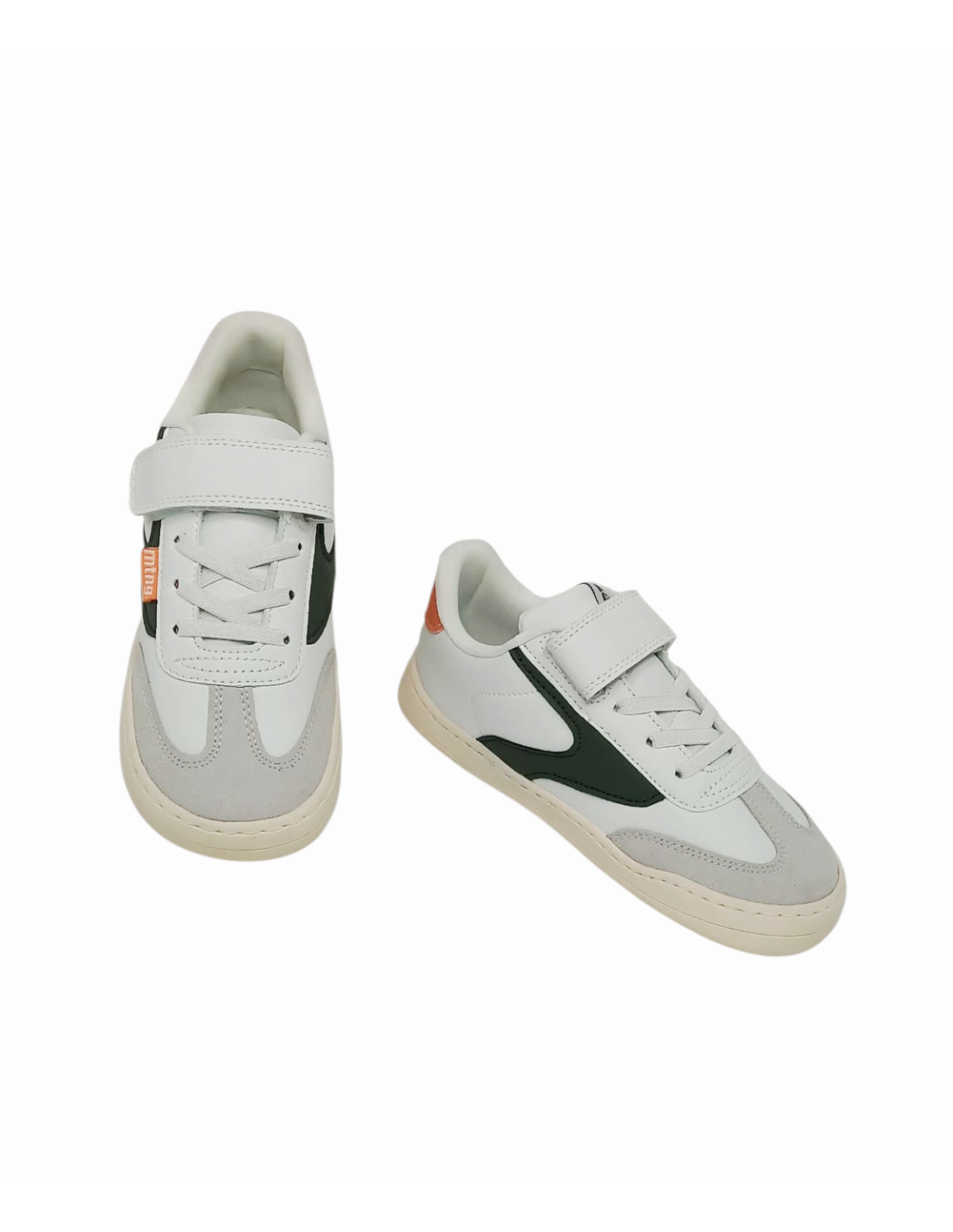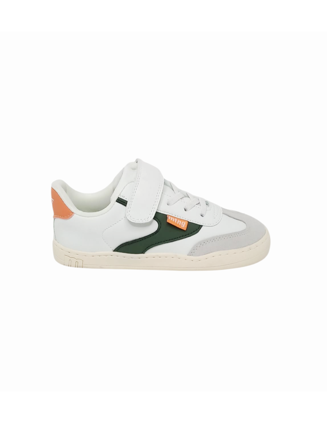 Es un diseño clásico de color blanco con detalles en verde kakhi y cuero, fabricado en piel vegana.
