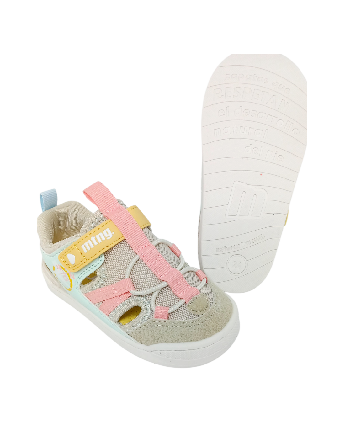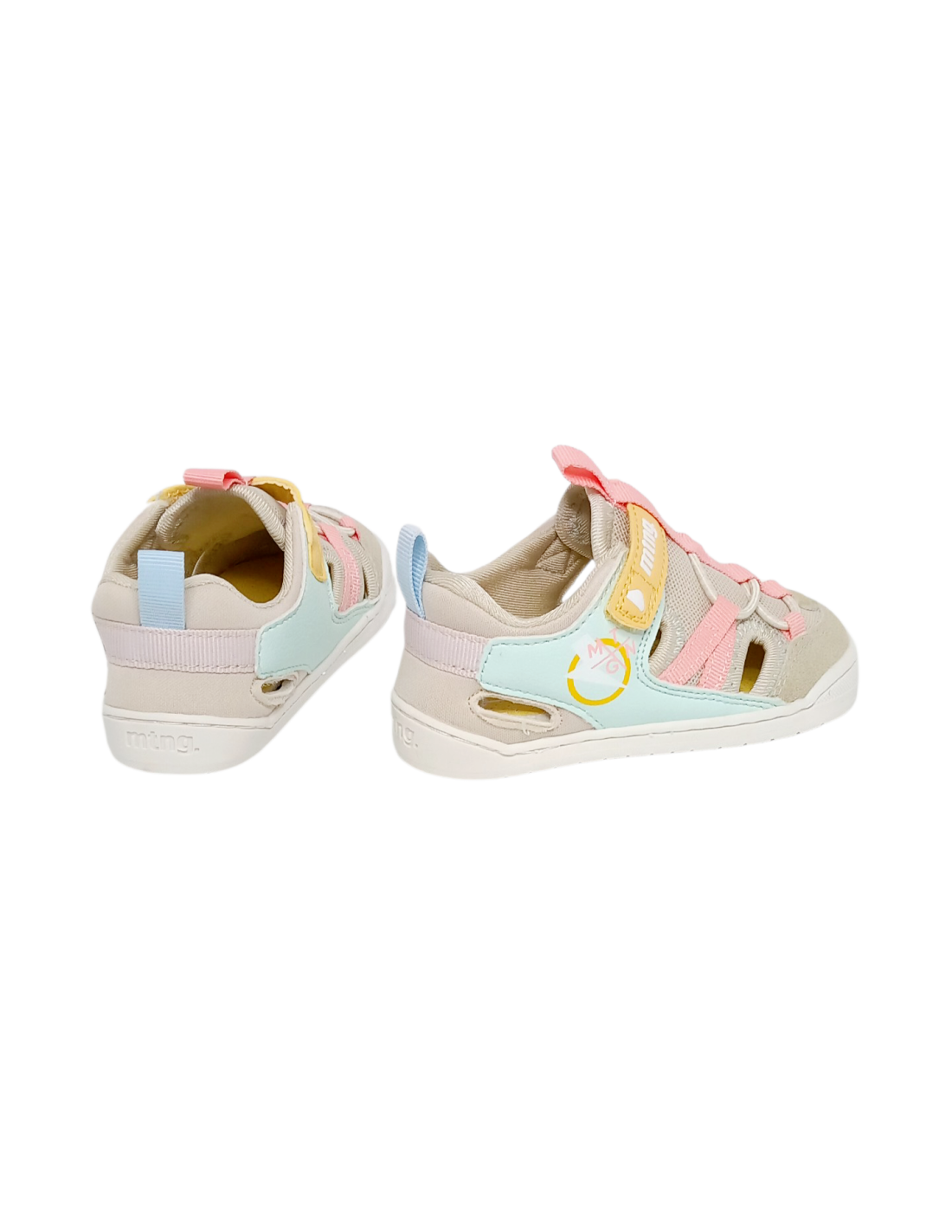 Sandalia BAREFOOT tipo cangrejera, es decir, con aberturas laterales pero cerrada tanto en la puntera como en el talón, por lo que permite que el pie vaya fresquito y protegido a la vez. Fabricada en material textil transpirable de color beige con detalles en tonos pastel: rosa, verde agua, azul y amarillo. Pertenece a la línea de calzado respetuoso, también llamado BAREFOOT, de Mustang.