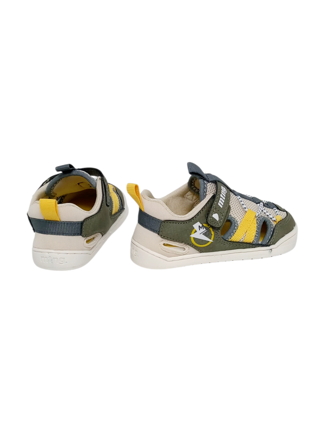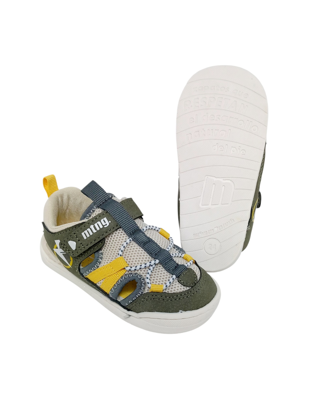 Sandalia BAREFOOT tipo cangrejera, es decir, con aberturas laterales pero cerrada tanto en la puntera como en el talón, por lo que permite que el pie vaya fresquito y protegido a la vez. Fabricada en material textil transpirable de color verde kakhi con detalles en beige y amarillo. Pertenece a la línea de calzado respetuoso, también llamado BAREFOOT, de Mustang.