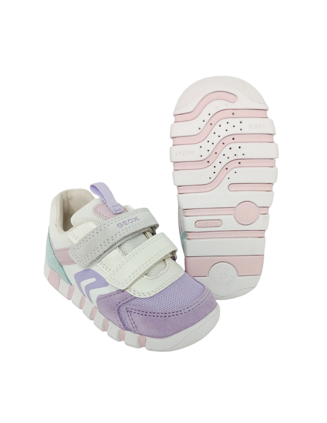 Deportivo de la marca Geox primeros pasos para bebé niña, transpirable, en tonalidad de colores blanco y lila, ligero y confortable.