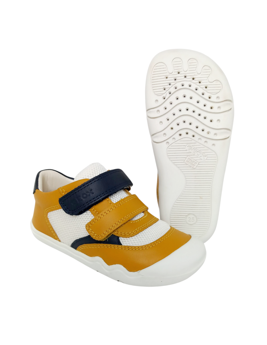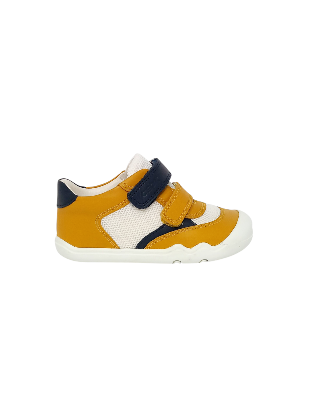 Deportivo de la marca Geox primeros pasos para bebé niño, transpirable, en combinación de colores blanco, yema y azul, ligero y confortable.