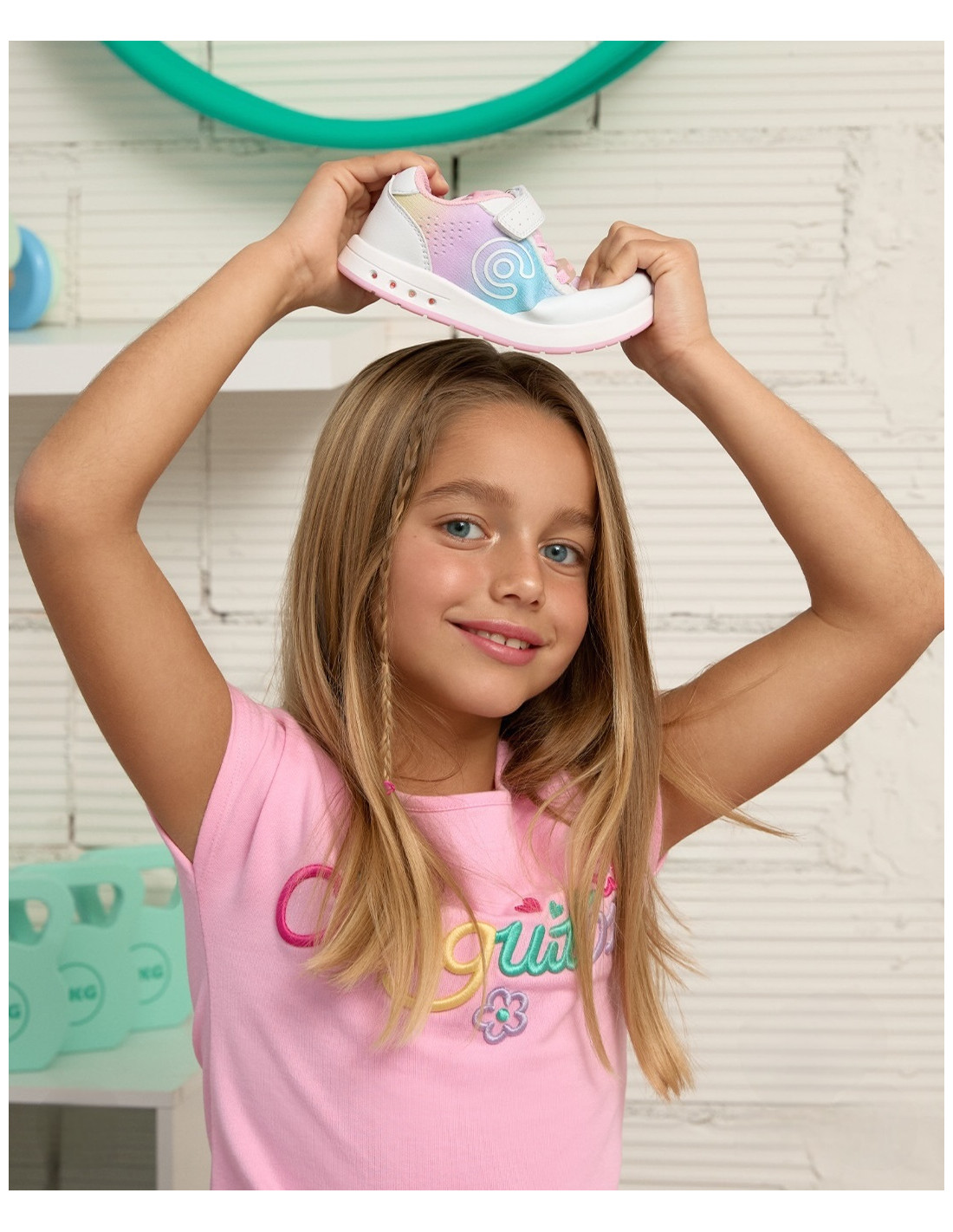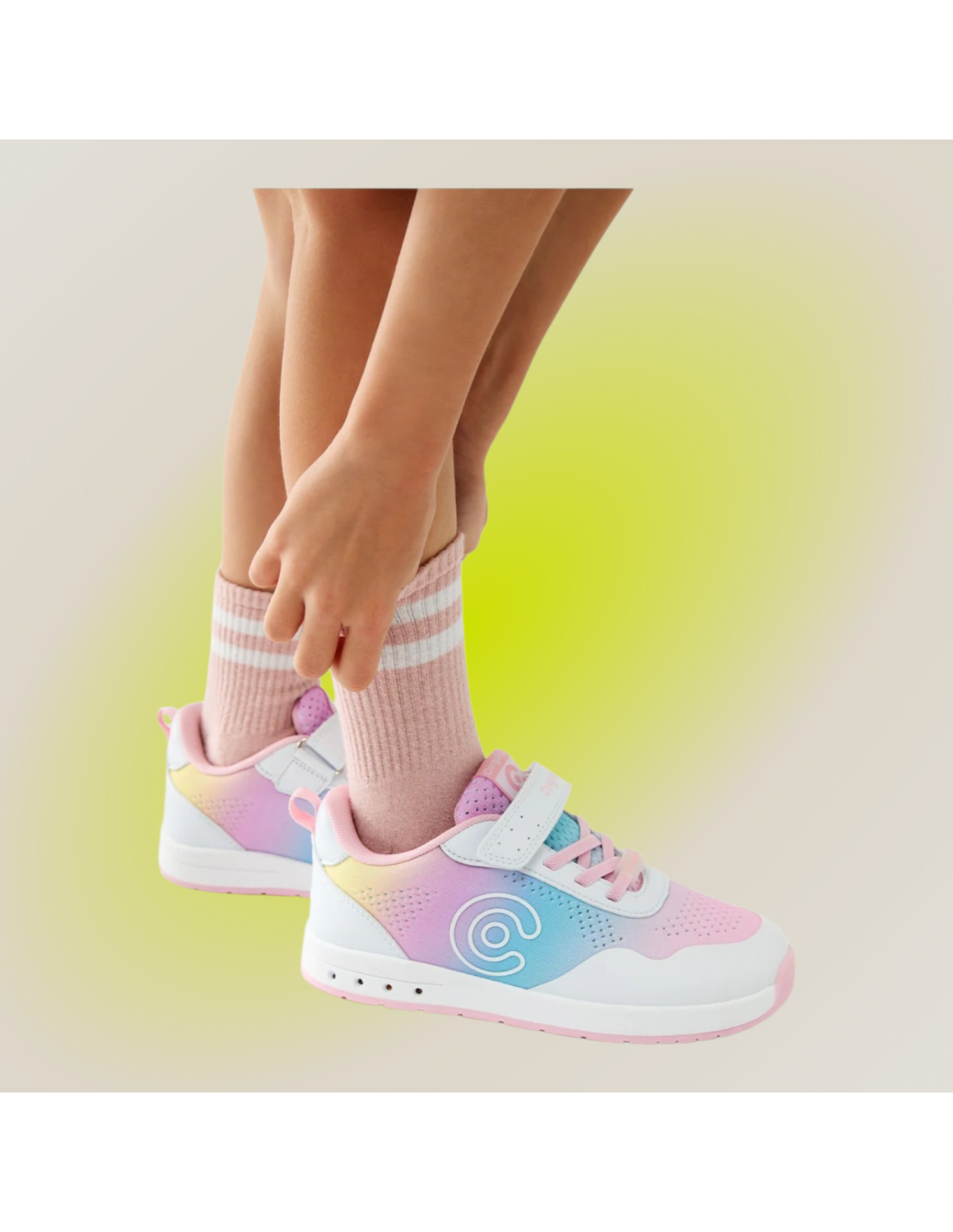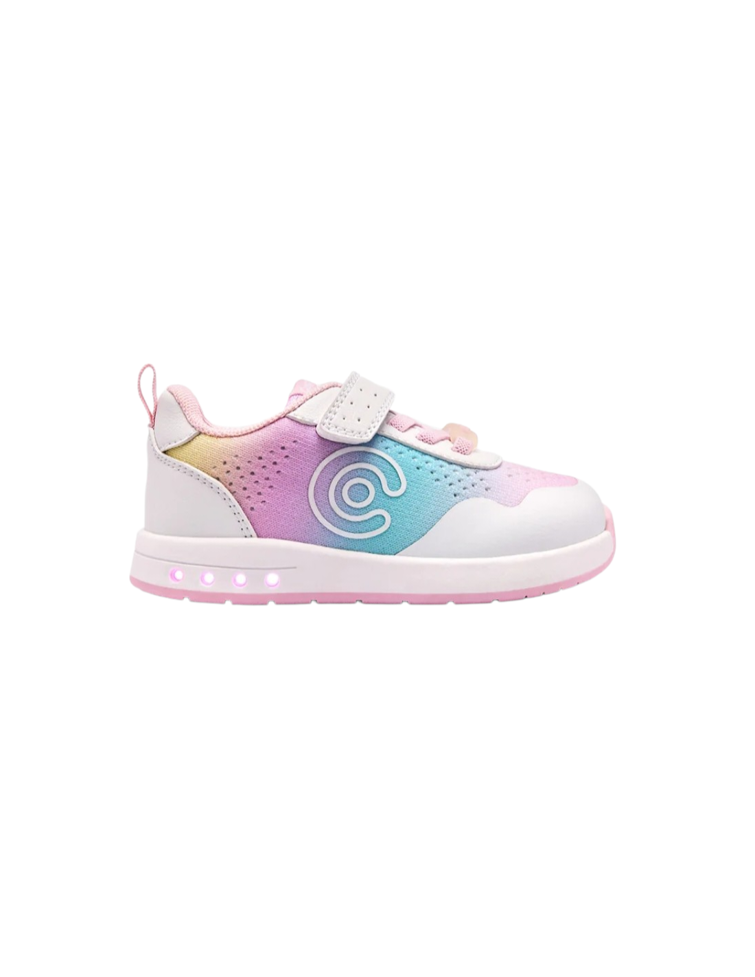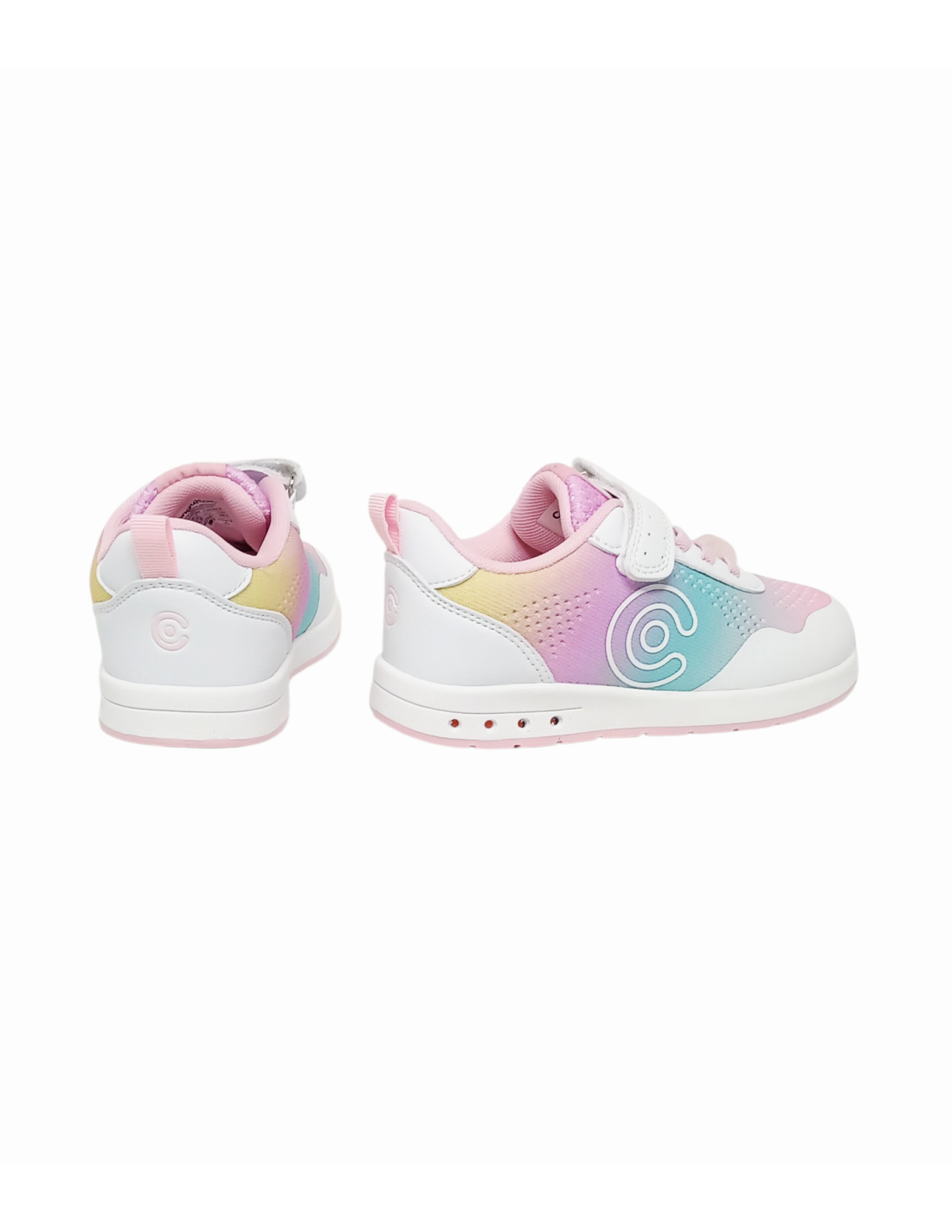 Deportivo barefoot GoFlex de colores arcoiris con luces en la suela que se activan con la pisada.