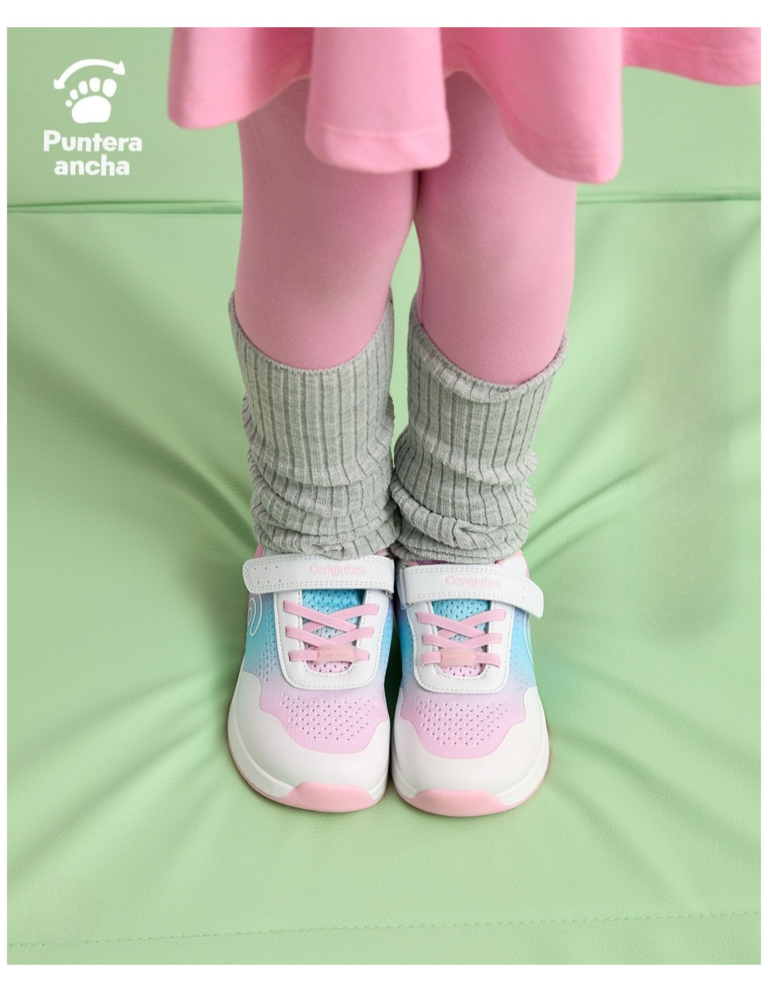 Pertenece a la línea de calzado respetuoso de la marca Conguitos, que se caracteriza por su horma amplia y neutra con puntera ancha que proporciona un gran espacio para los dedos, respetando el crecimiento natural del pie. Cuenta con plantilla extraíble y suela súper flexible con drop cero(plana), para una pisada estable.