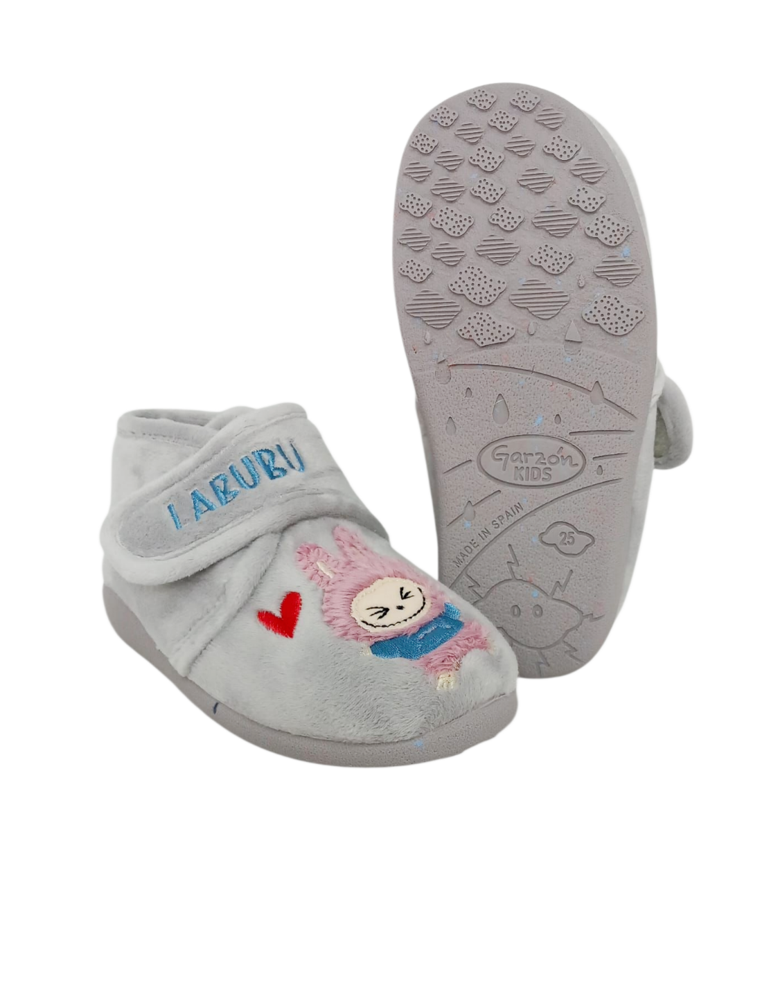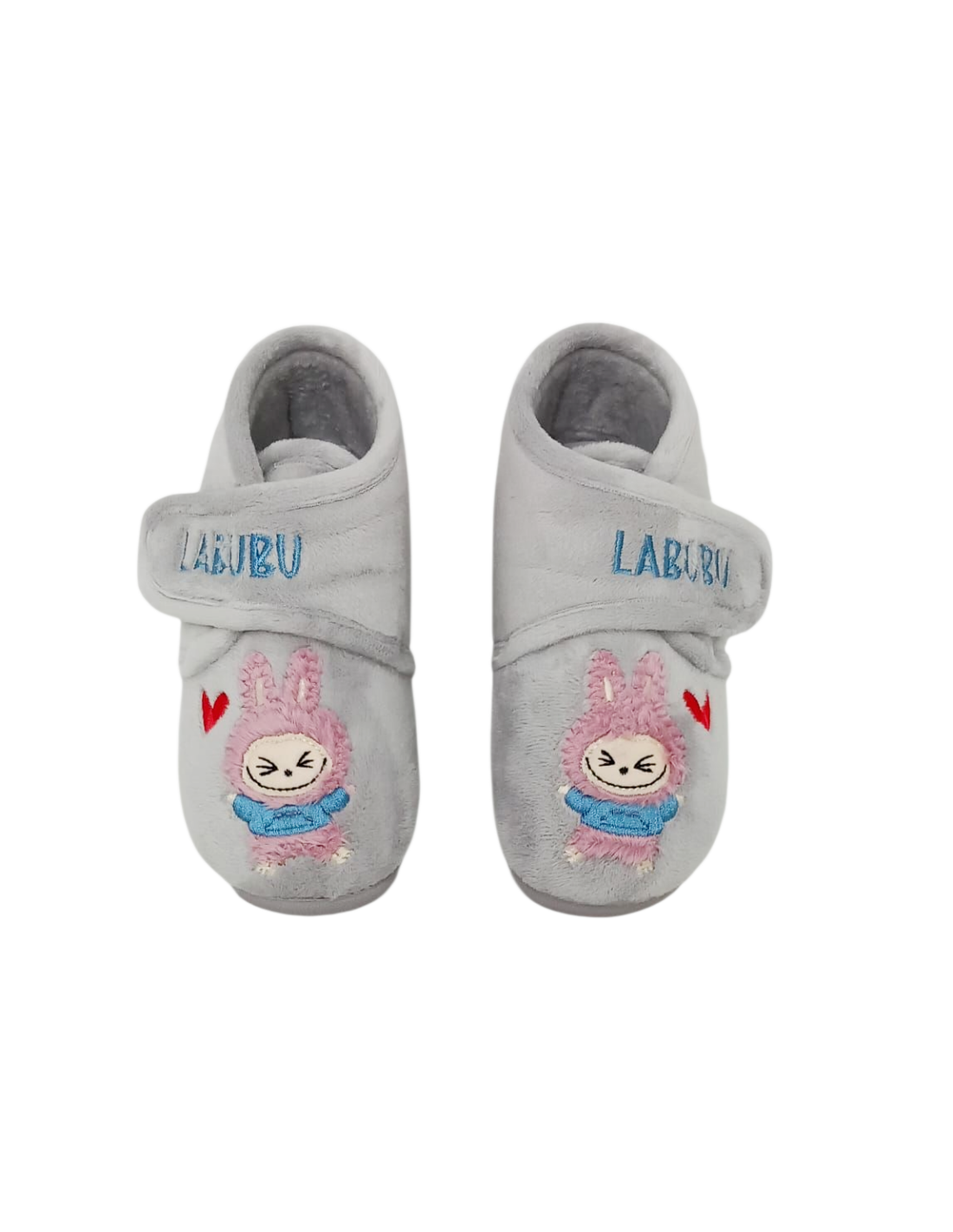 Zapatilla de casa cerrada, con cierre de velcro, fabricada en tejido suave y calentito de color gris, con dibujo en relieve de "Labubu" en ambos pies.