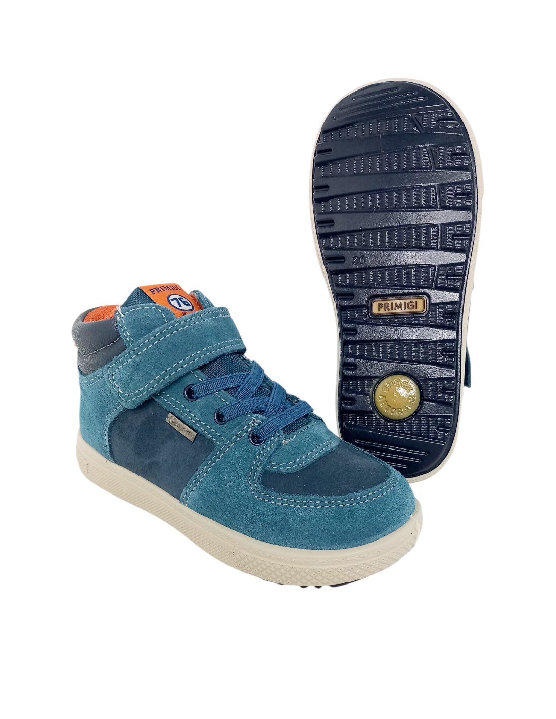 Botines línea infantil de la marca Primigi fabricados en piel serraje en combinación de dos colores, beige/cuero y jeans/marino con revestimiento de goma en talonera y puntera.