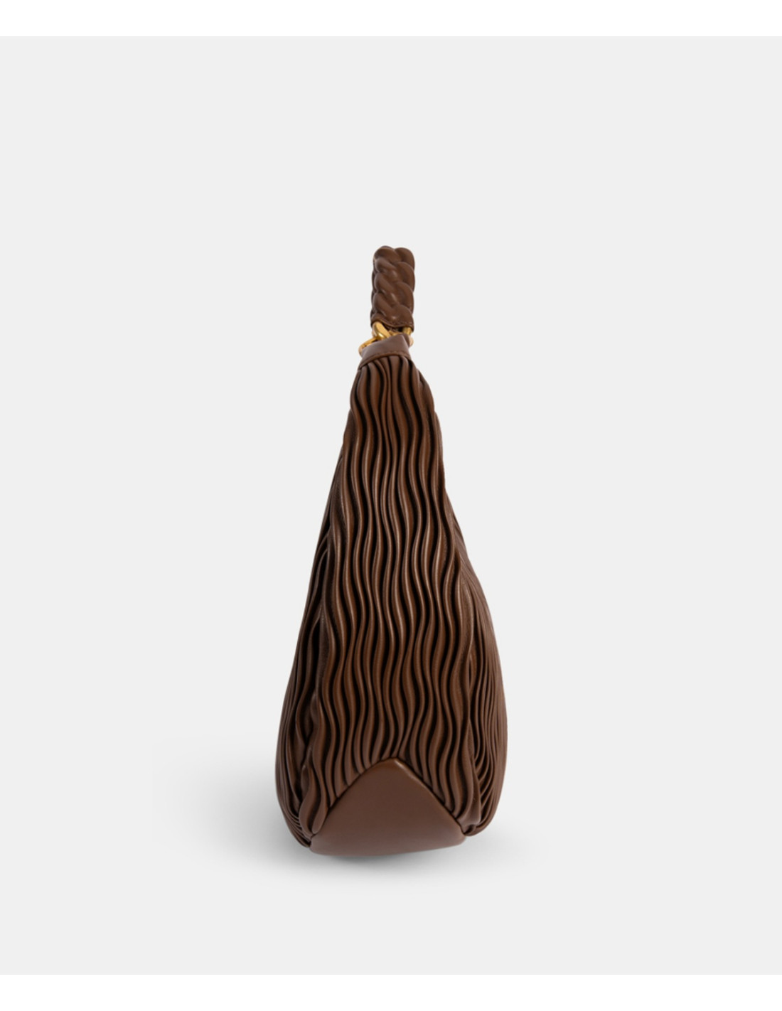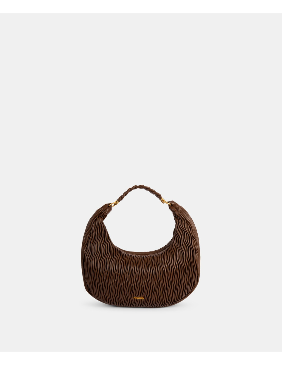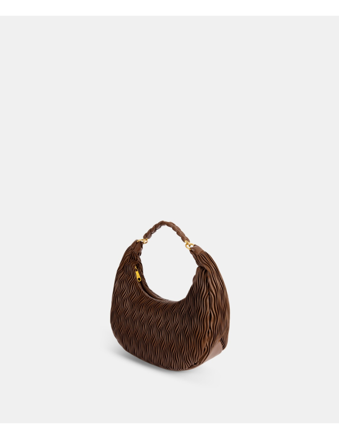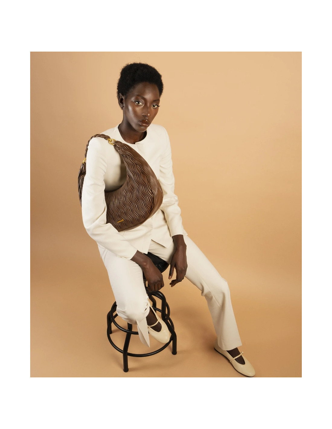 Bolso de hombro para mujer en forma de media luna de la marca Pepe Moll en dos combinaciones de color marrón chocolate y negro.