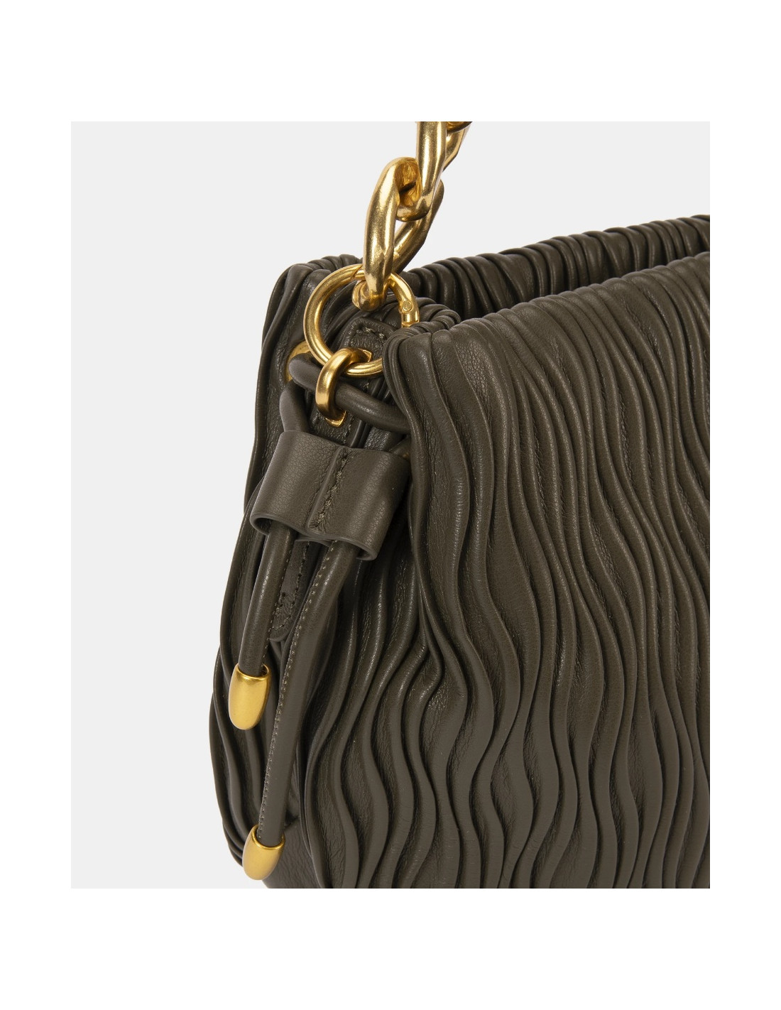 Este diseño combina una silueta suave tipo saco con detalles dorados y una textura fruncida que no pasa desapercibida.