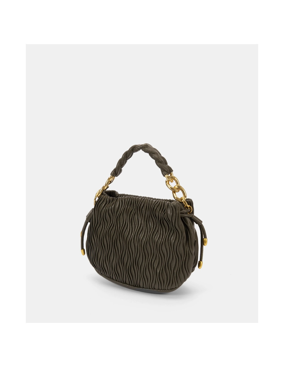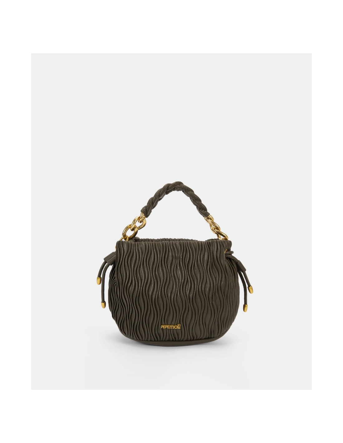 Diseño tipo cubo con cuerpo plisado y acabado suave.