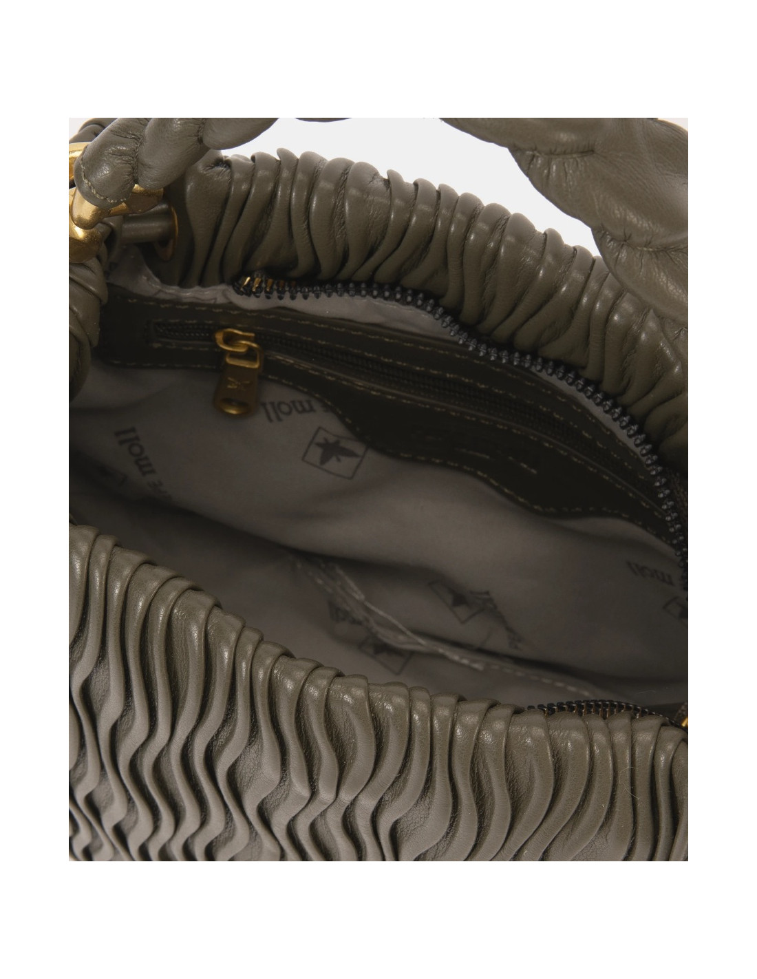 Cierre superior con cremallera dorada y cordones ajustables. Interior forrado con estampado de la marca y bolsillo con cremallera.