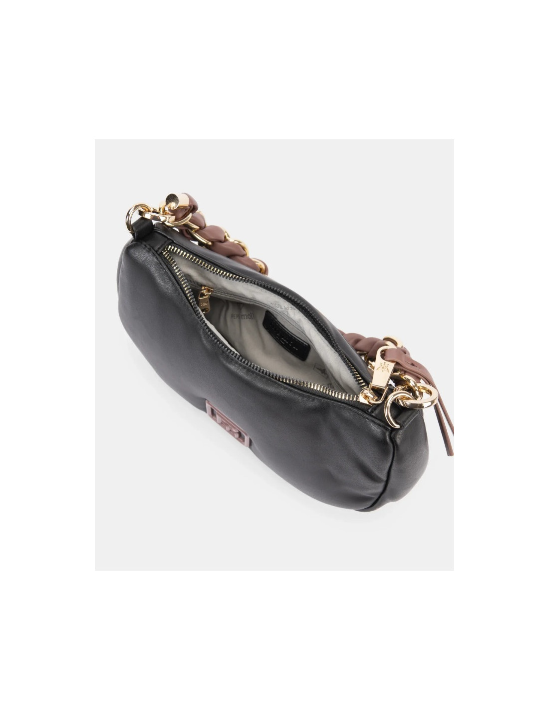 Interior forrado con bolsillo con cierre. Detalles metálicos que elevan el diseño.