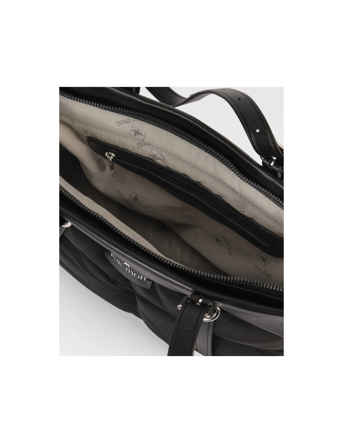 Interior forrado con compartimentos funcionales.