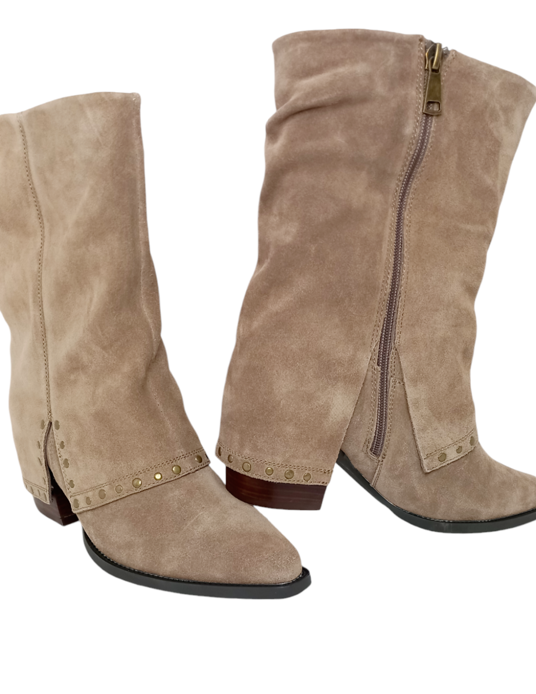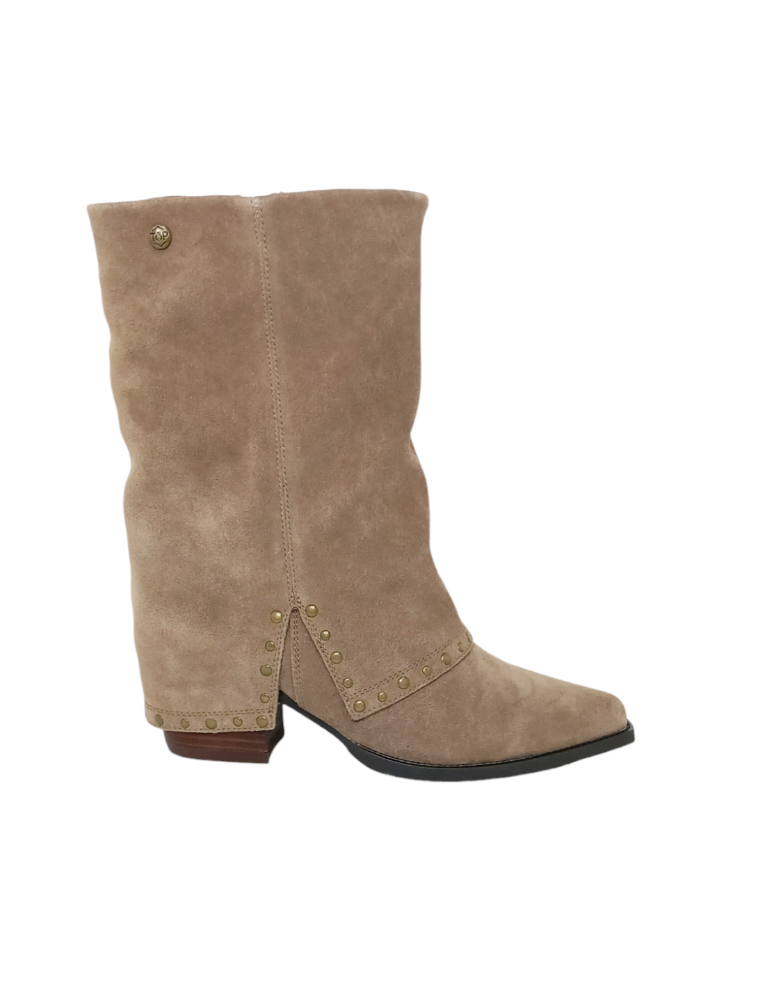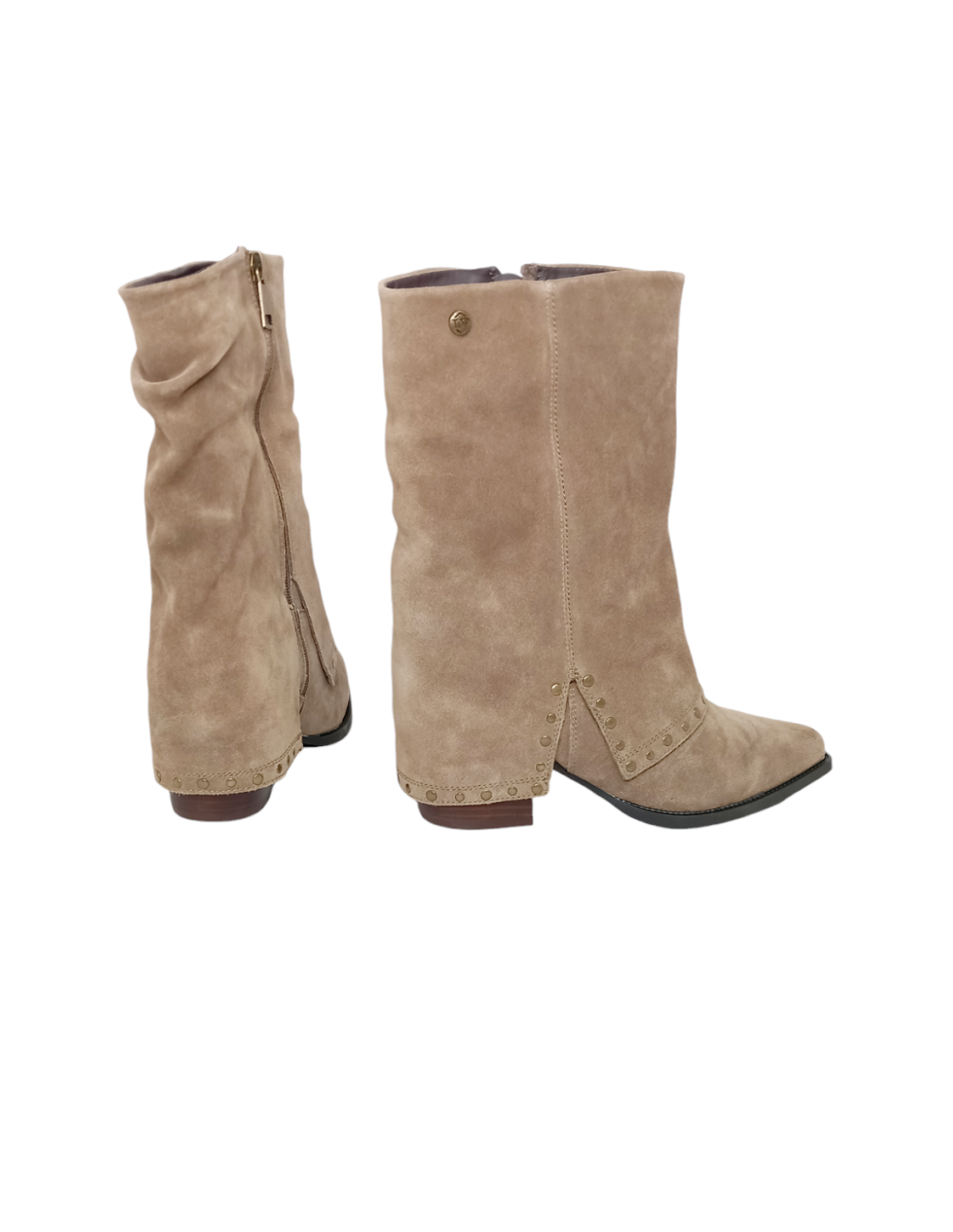 Bota campera con polaina o caña plegada fabricada en piel serraje en colores arena y negro.