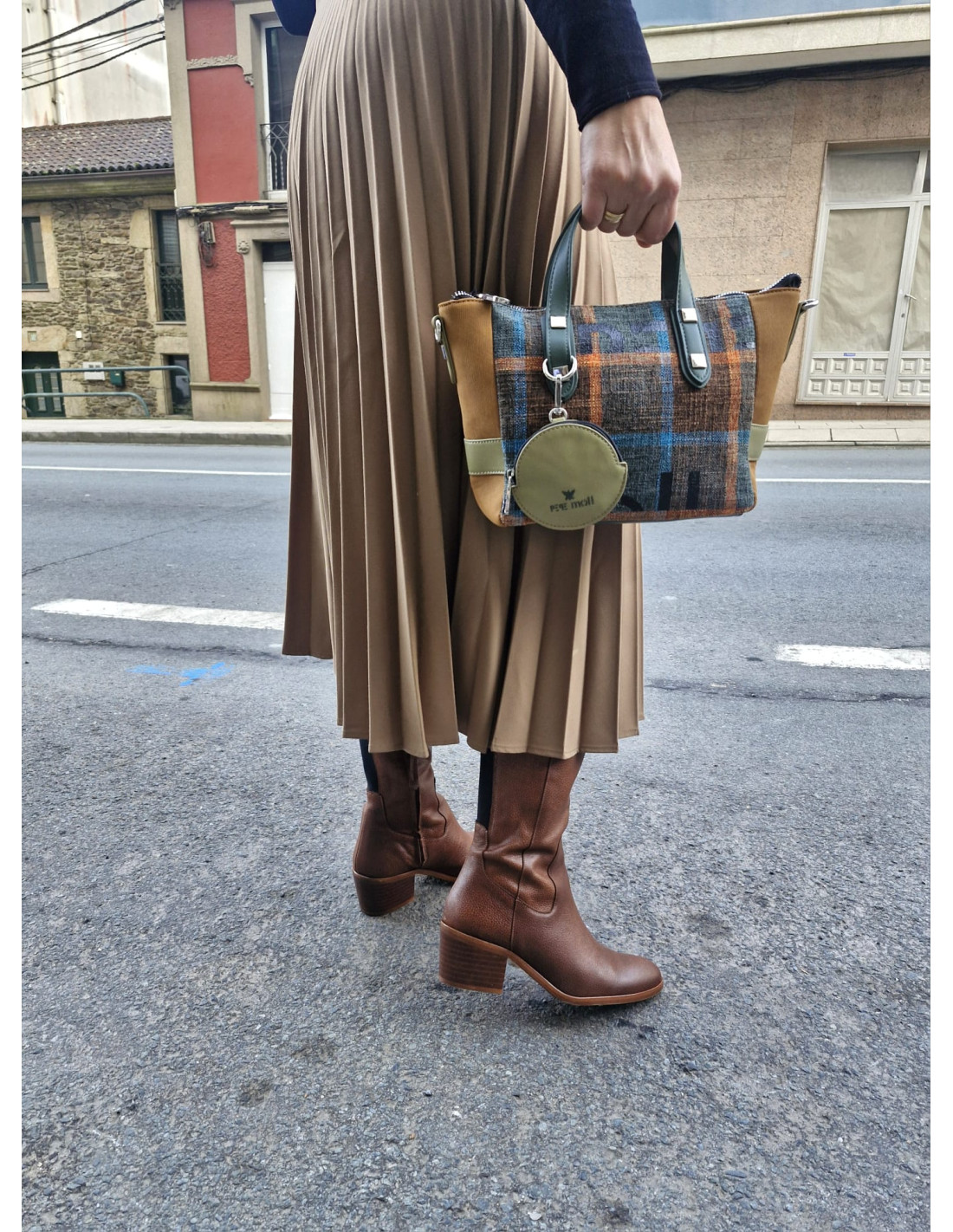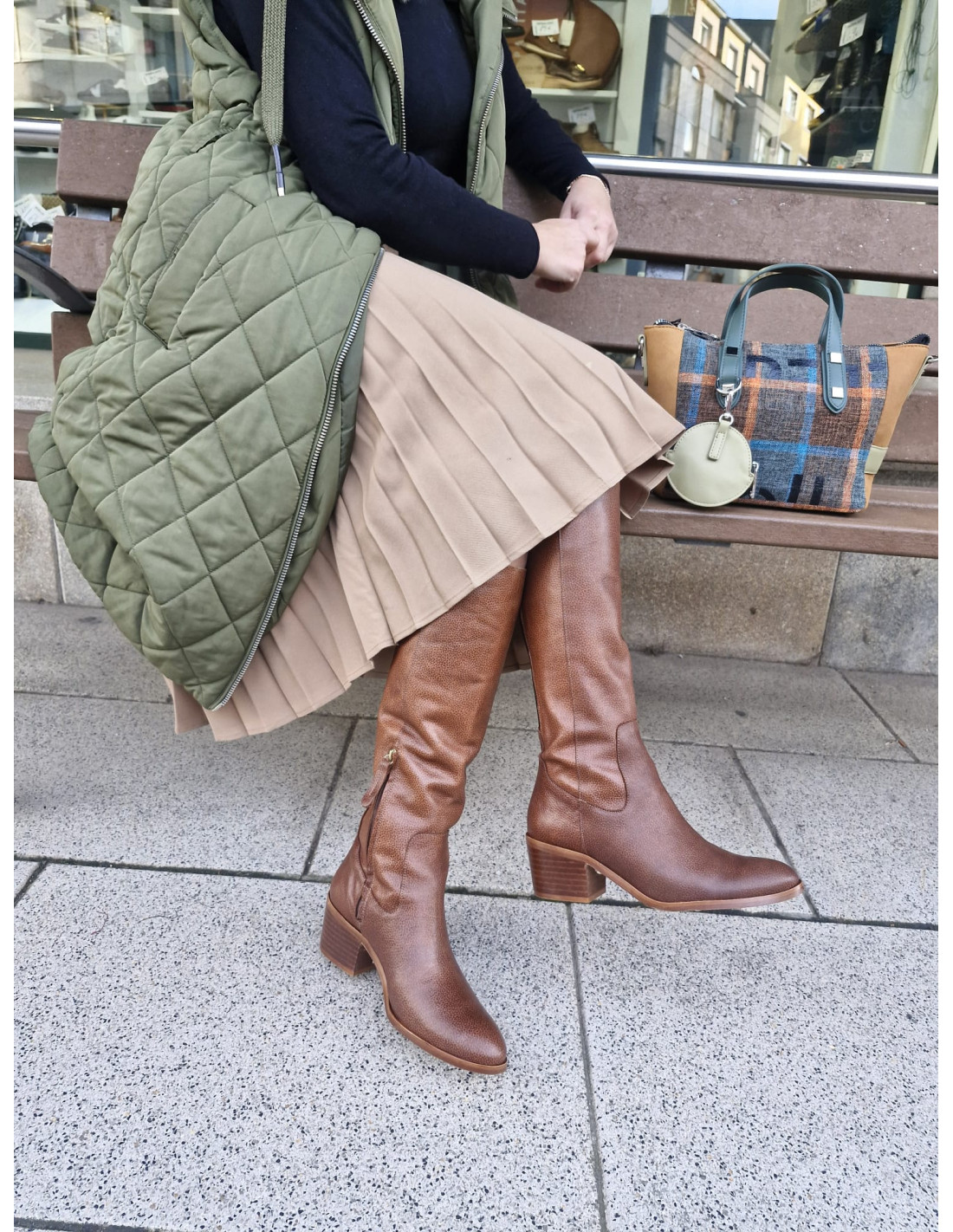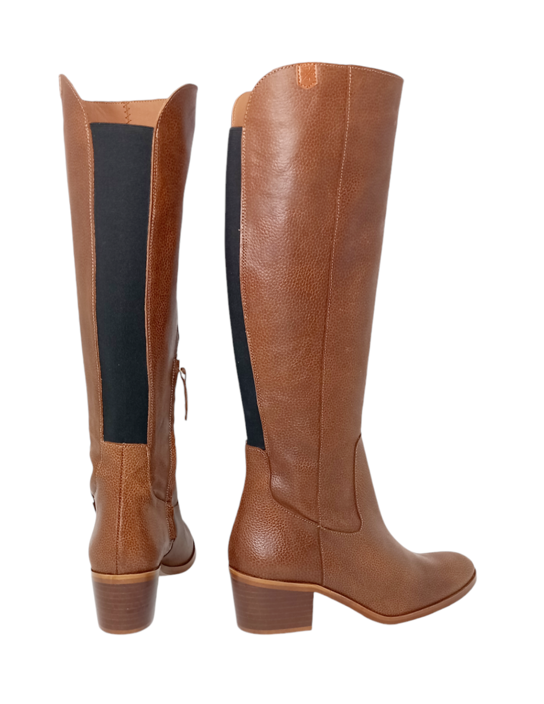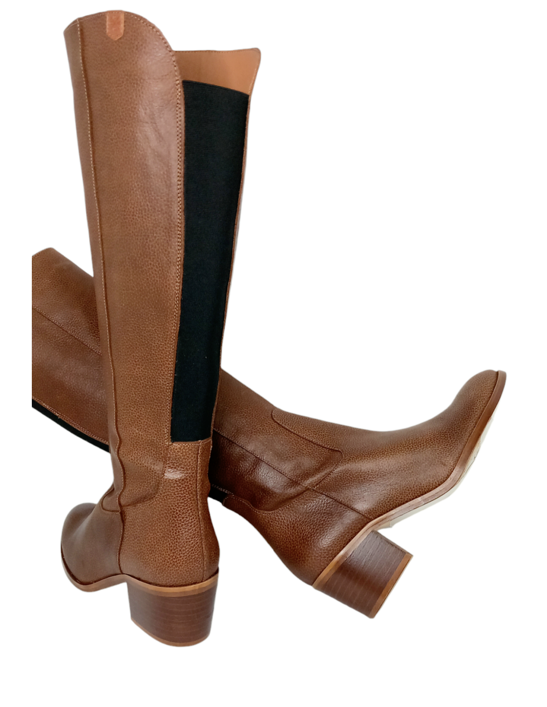 La punta es ligeramente cuadrada, con tacón ancho de 6,5 cm y caña de 38.