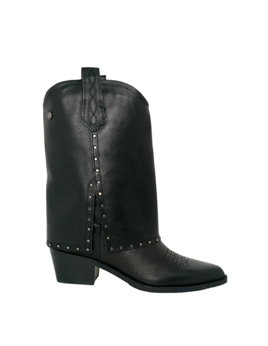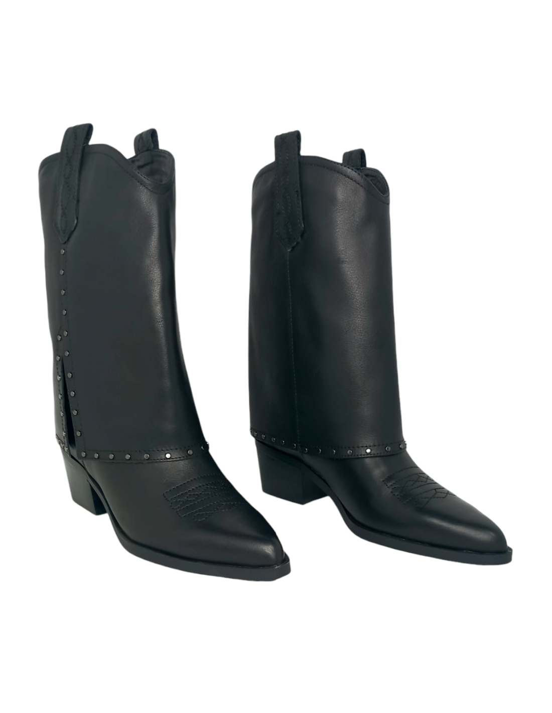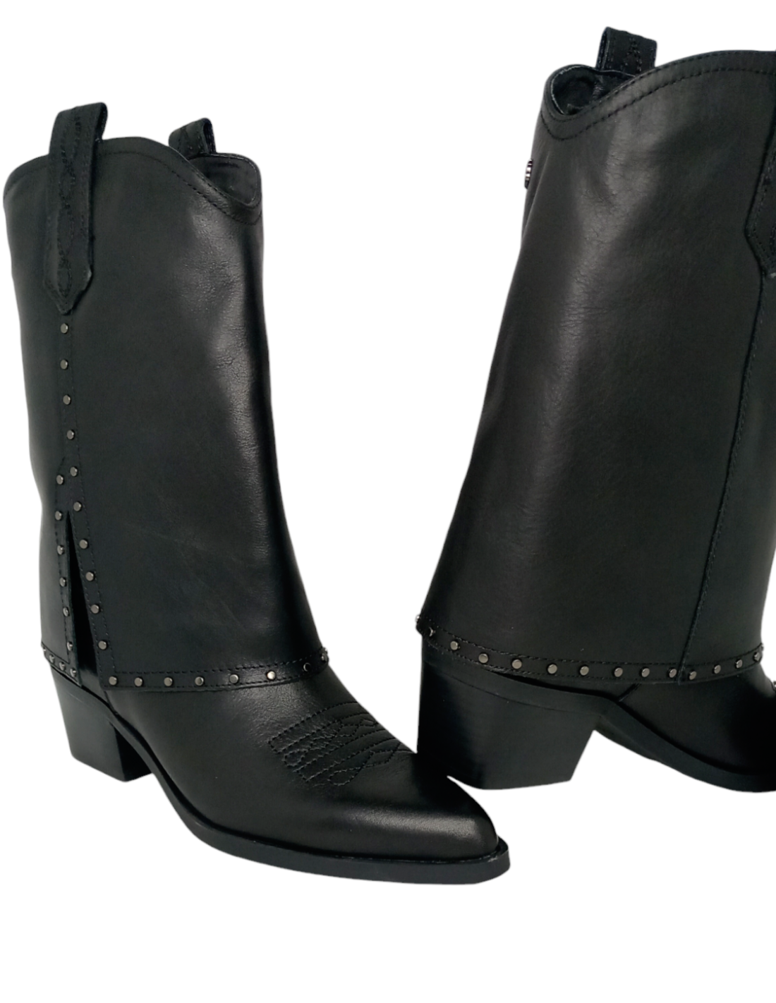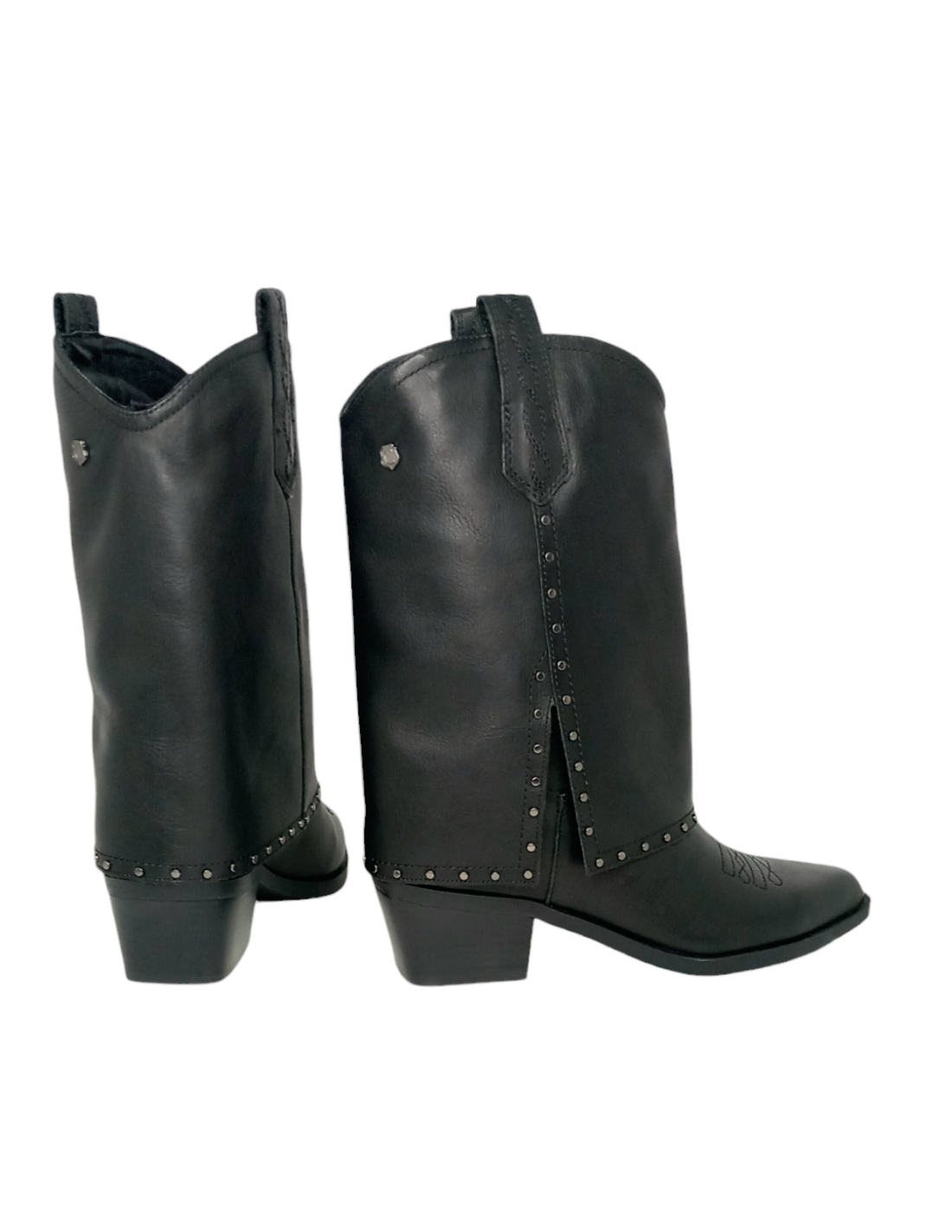 Bota campera con polaina o caña plegada fabricada en piel de primera calidad en color negro con bordados inspiración cowboy y tachuelas.
