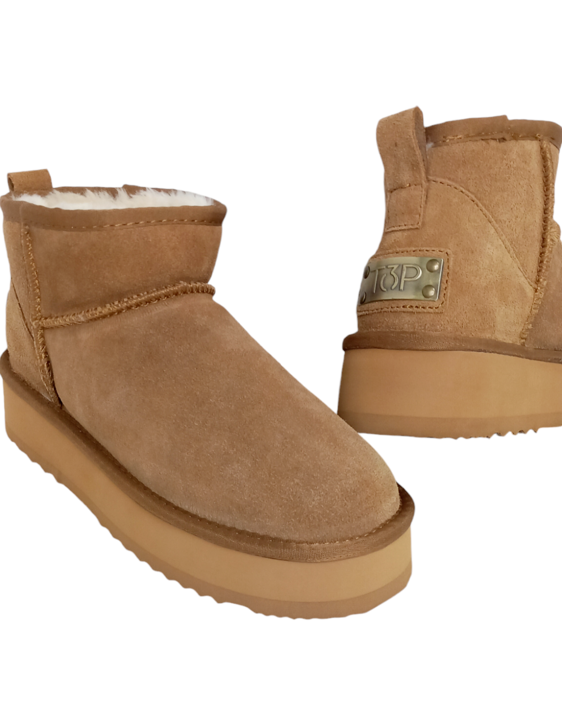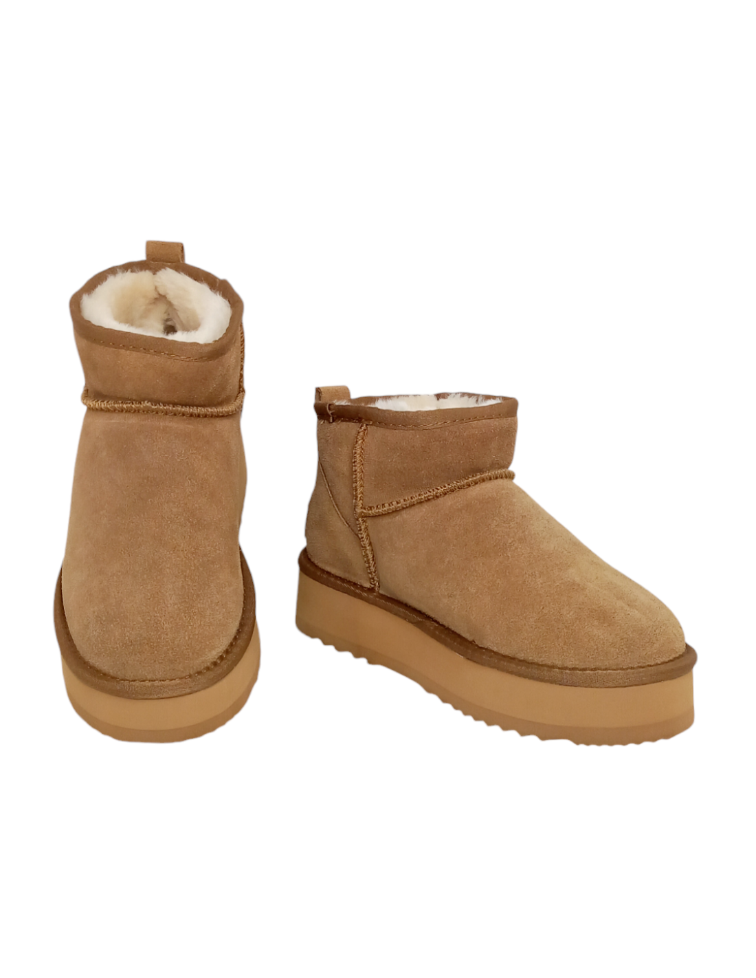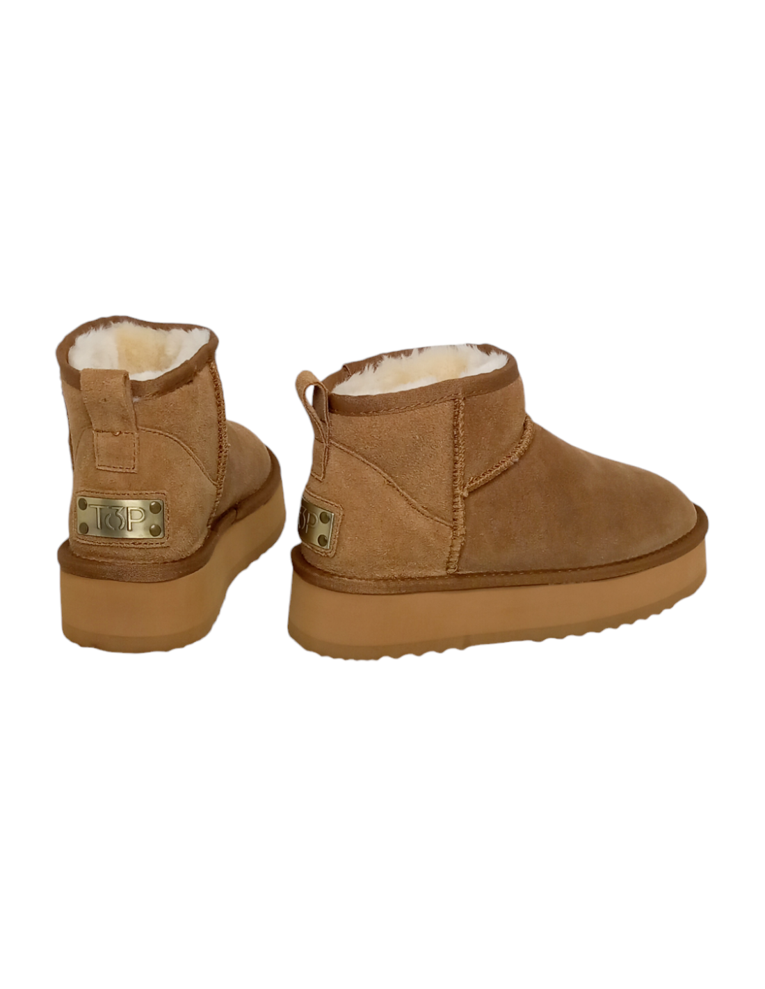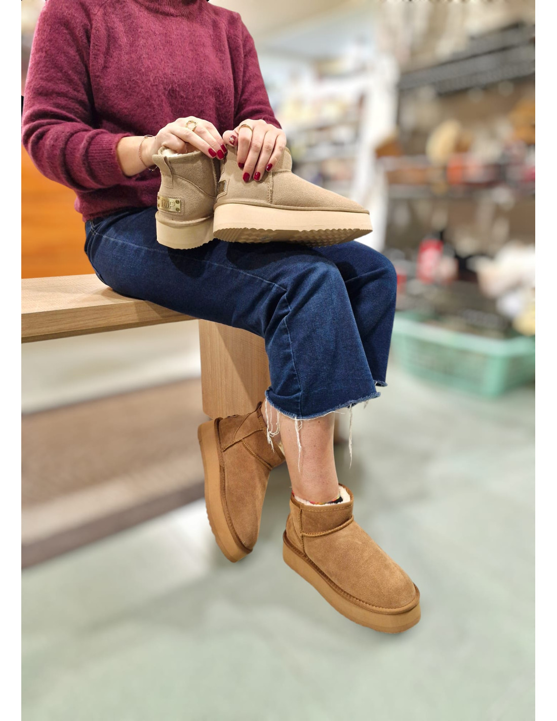 Bota australiana de caña baja, fabricada en piel serraje de colores cuero y beige, adornada en el talón con una chapa metálica en color bronce con el logotipo de la marca.
