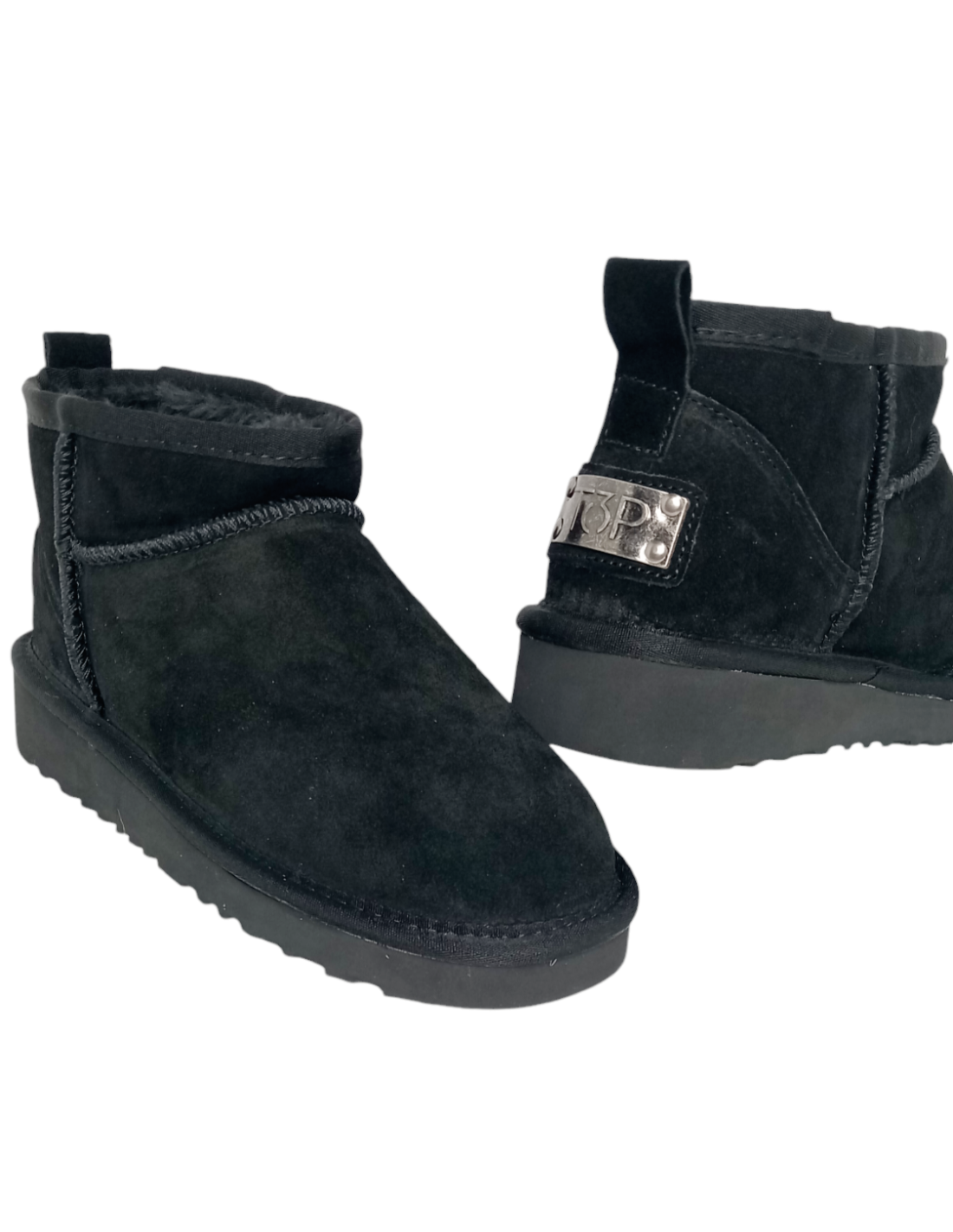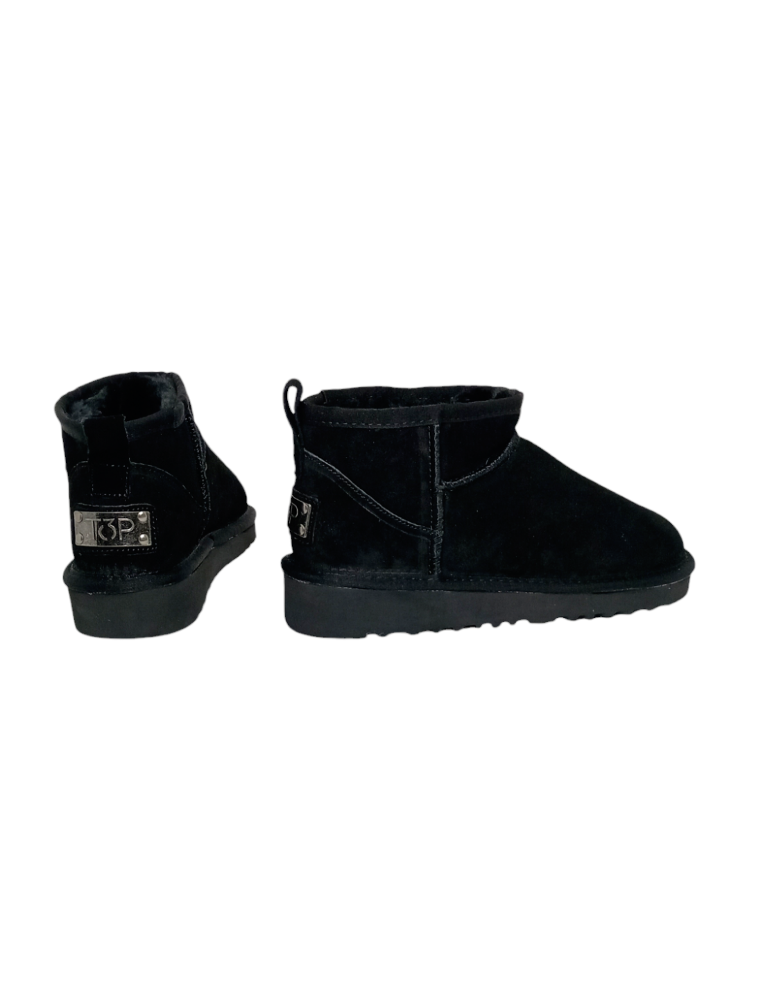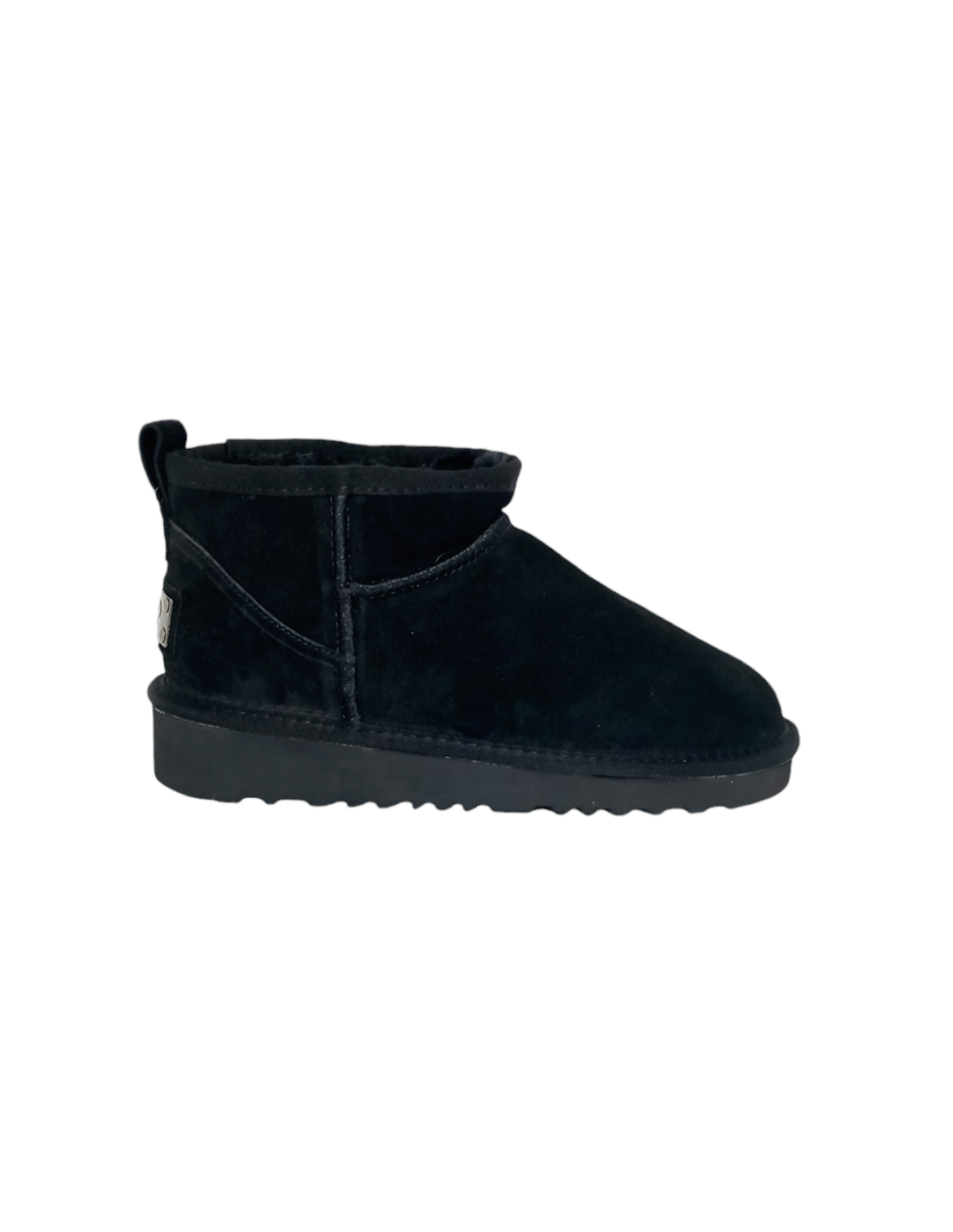 Bota australiana de caña baja, fabricada en piel serraje de colores cuero y negro, adornada en el talón con una chapa metálica en color bronce con el logotipo de la marca.