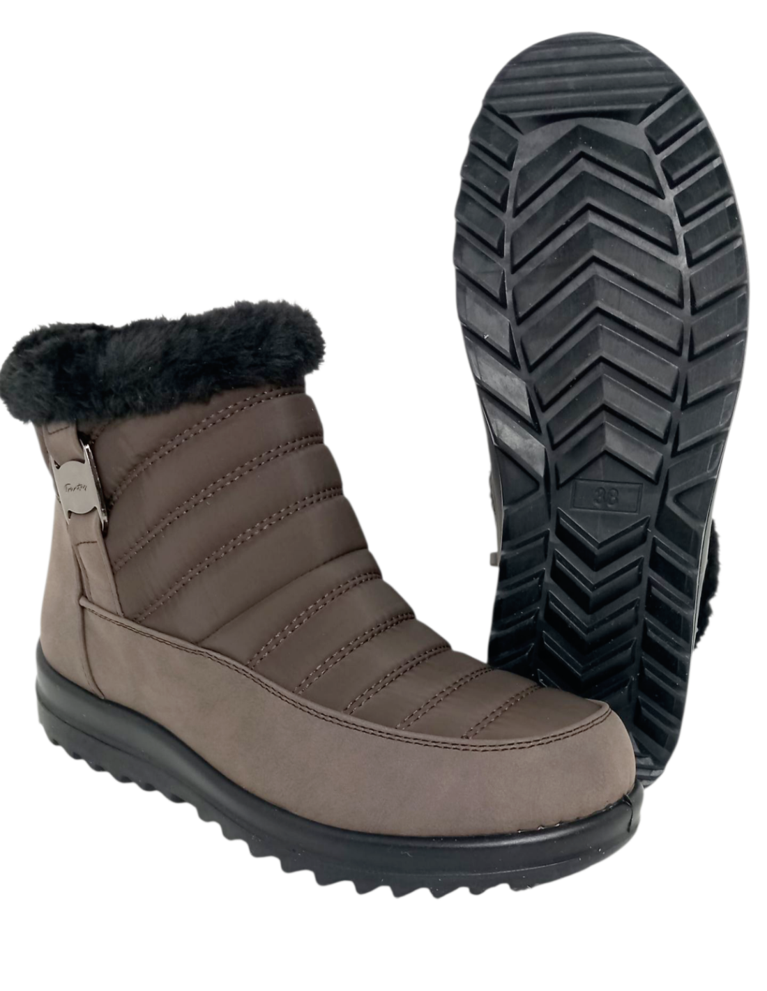 Bota corta fabricada en nylon acolchado en colores negro y marrón, forrada de pelo sintético, lo que la hace calentita y confortable.