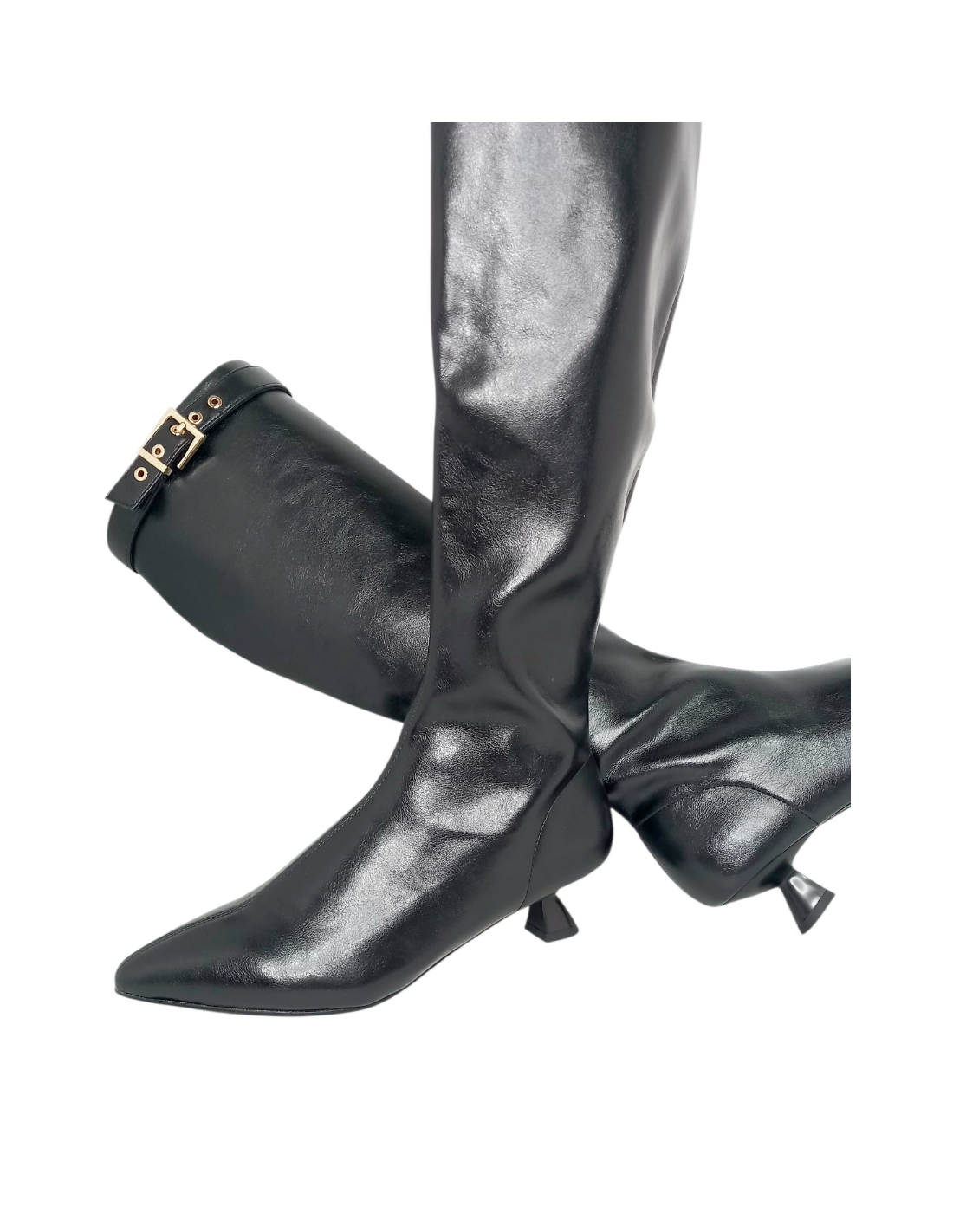 Esta bota con efecto piel elástica se adaptará a tu pierna al 100%. Detalle de adorno de correa con hebilla dorada. Interior forrado en piel.