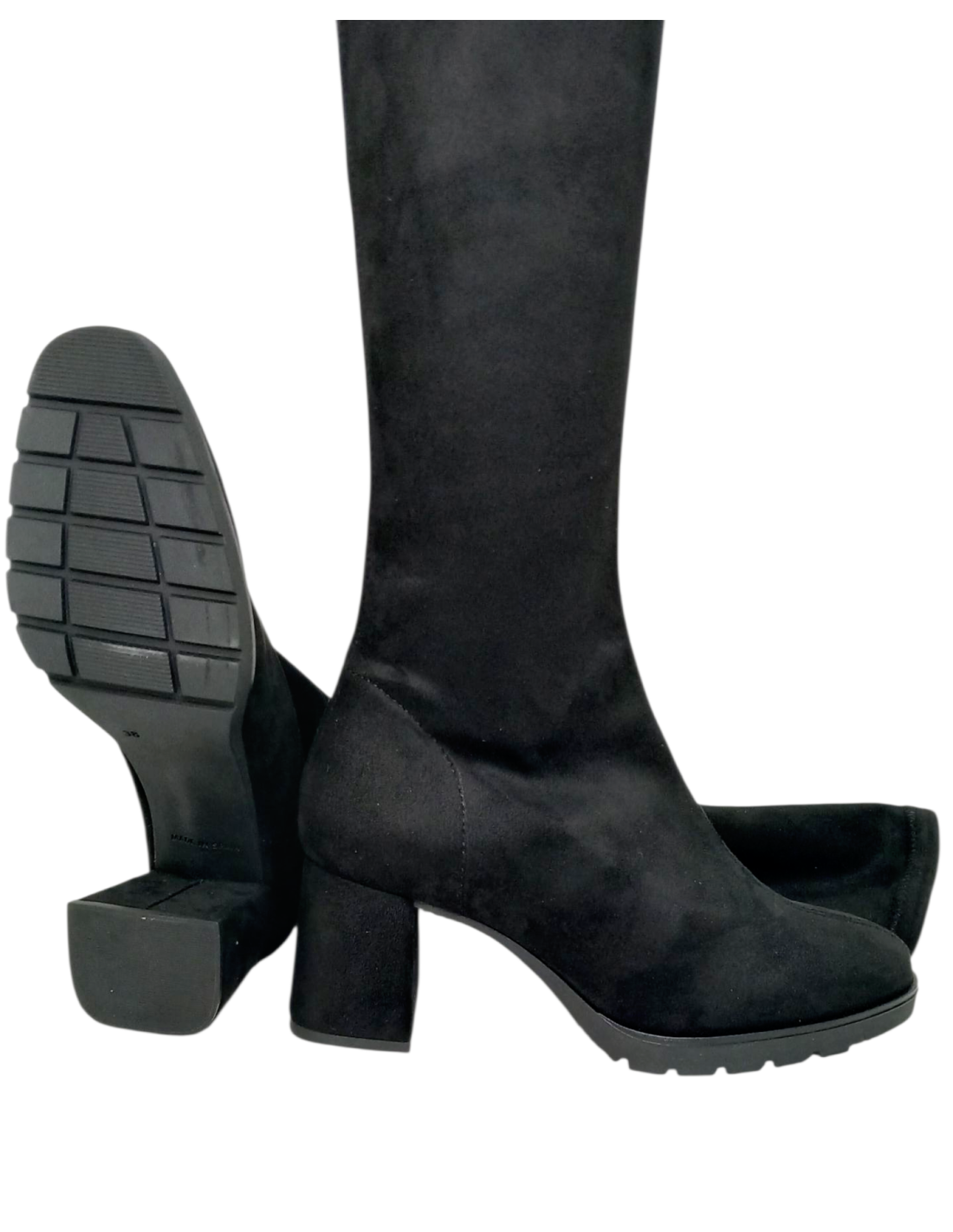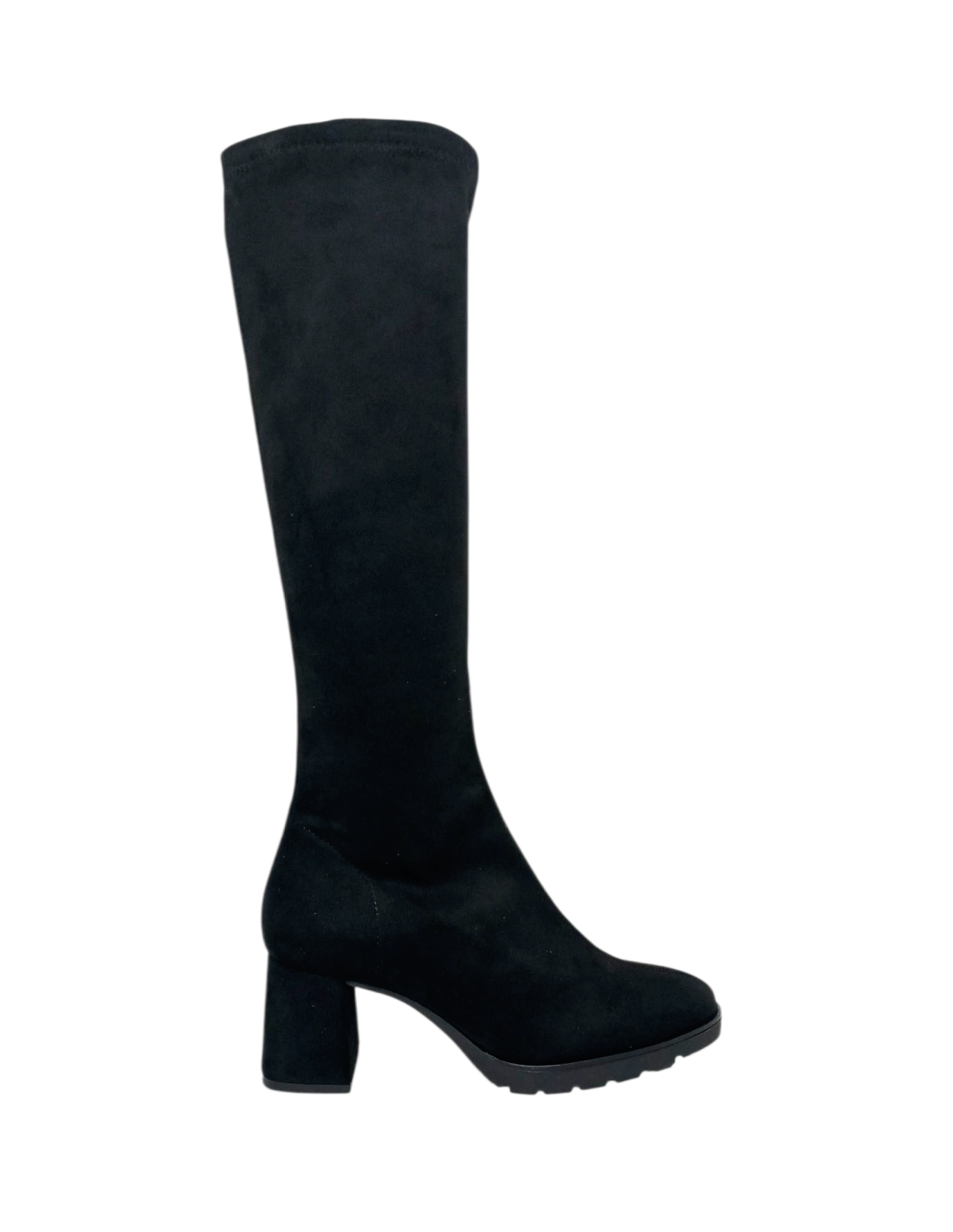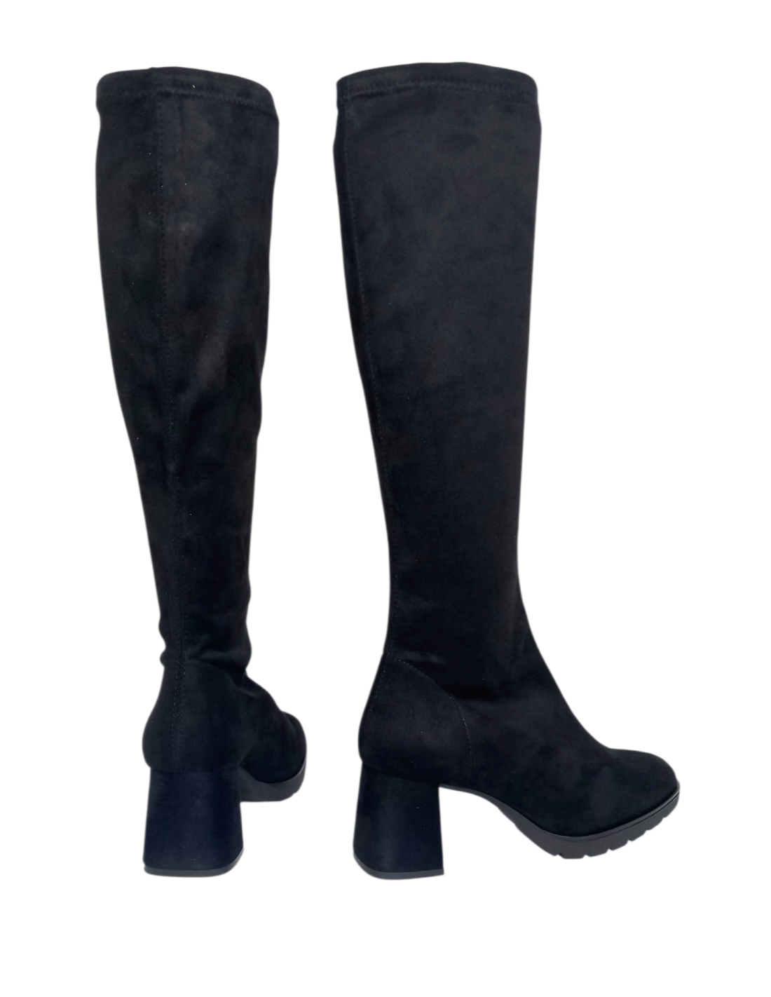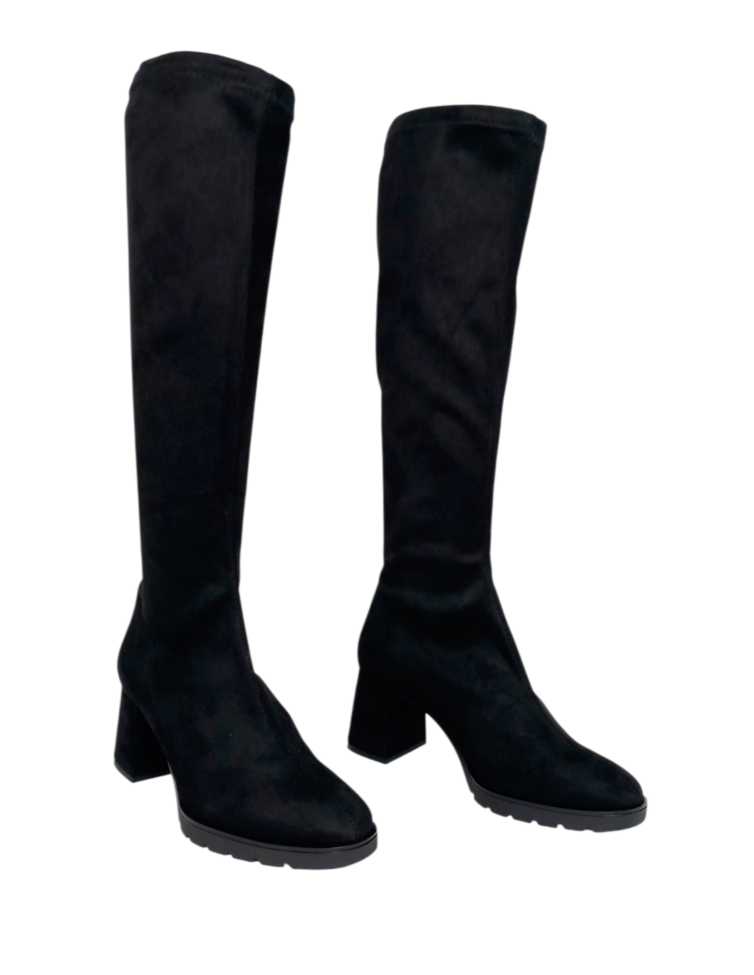 Bota fina para mujer de la marca Daniela Vega fabricado en textil tipo antelina para una perfecta adaptación a cada pierna, en color negro.