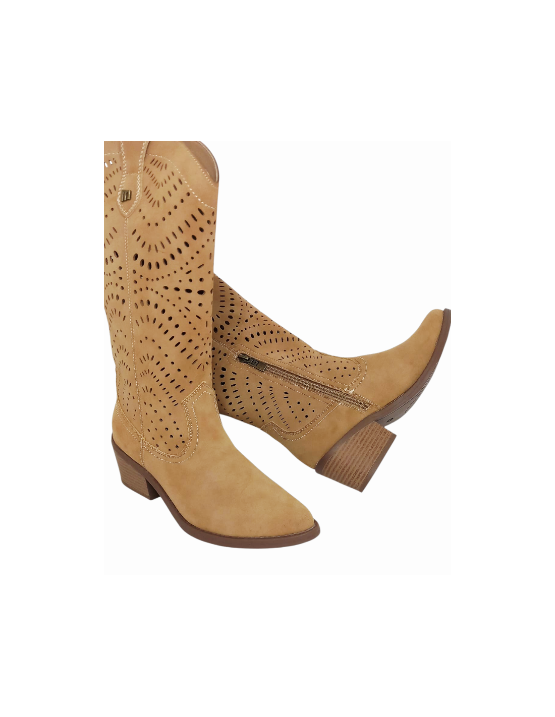 Bota campera fabricada en material sintético de color camel, con diseño brocado en la caña.