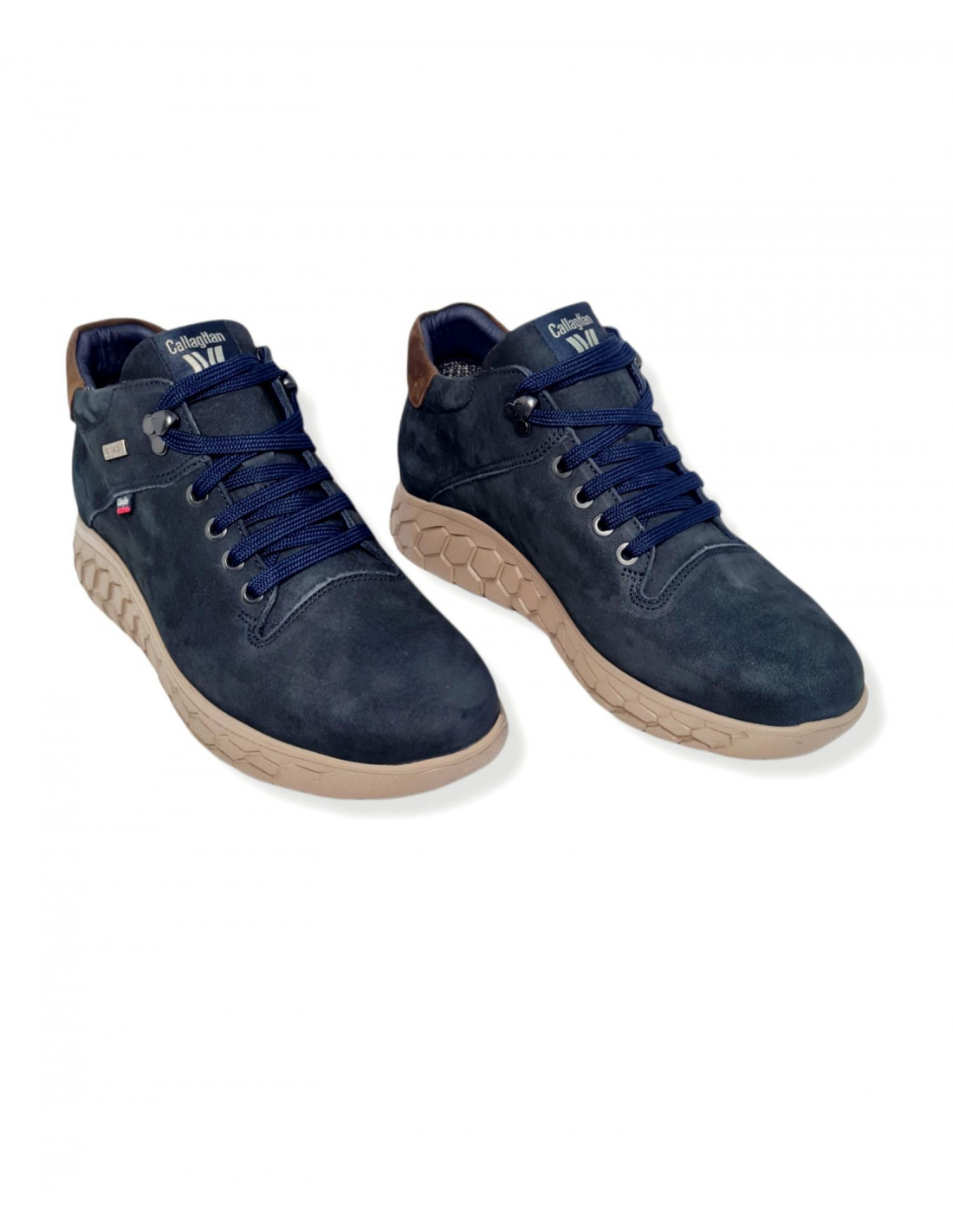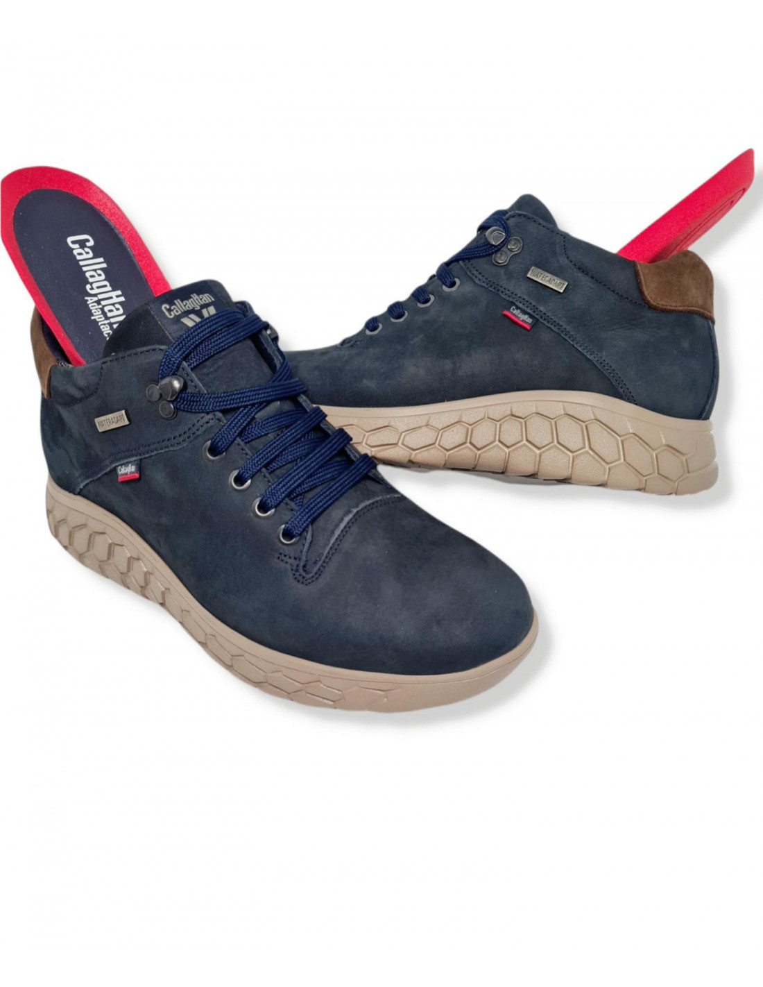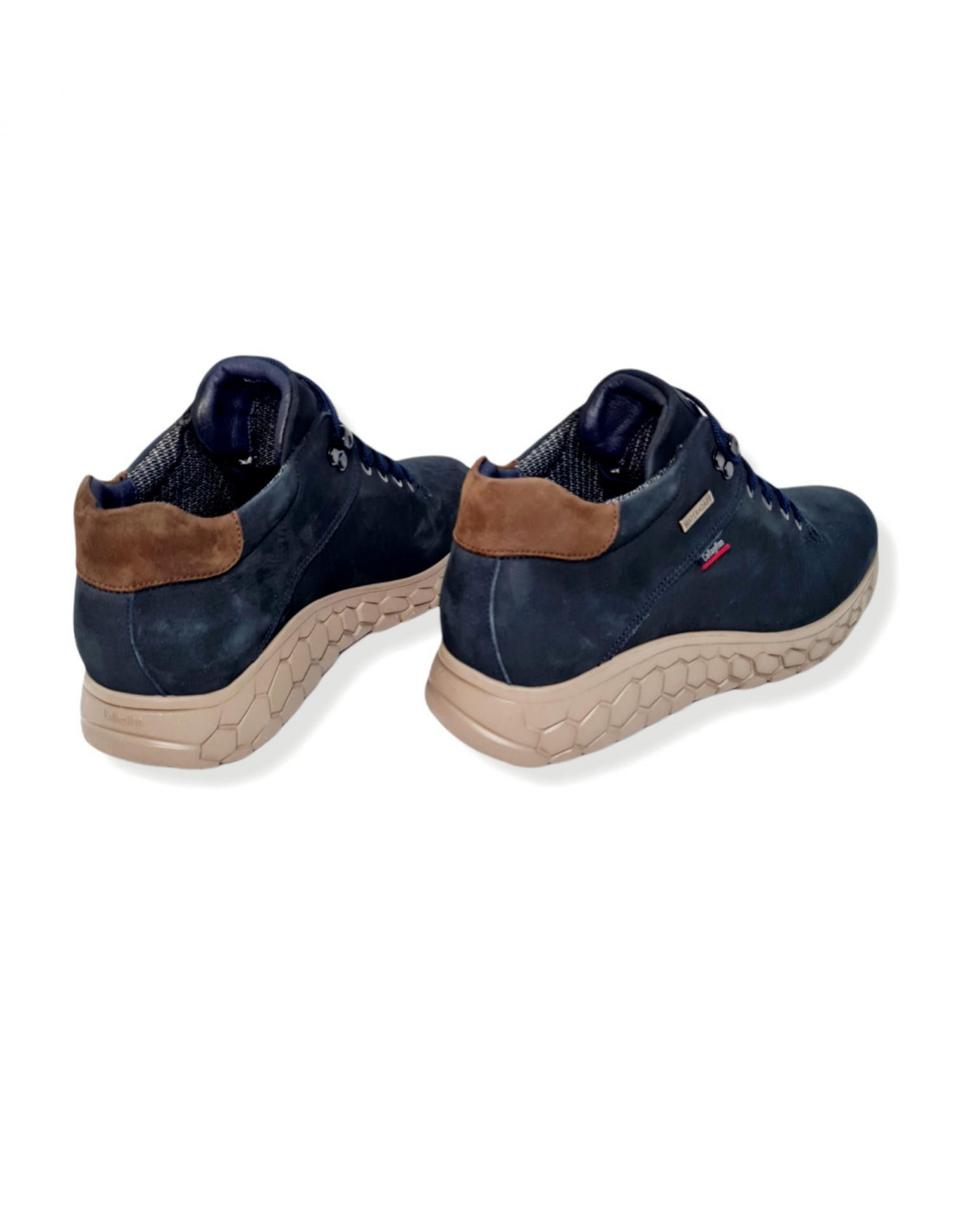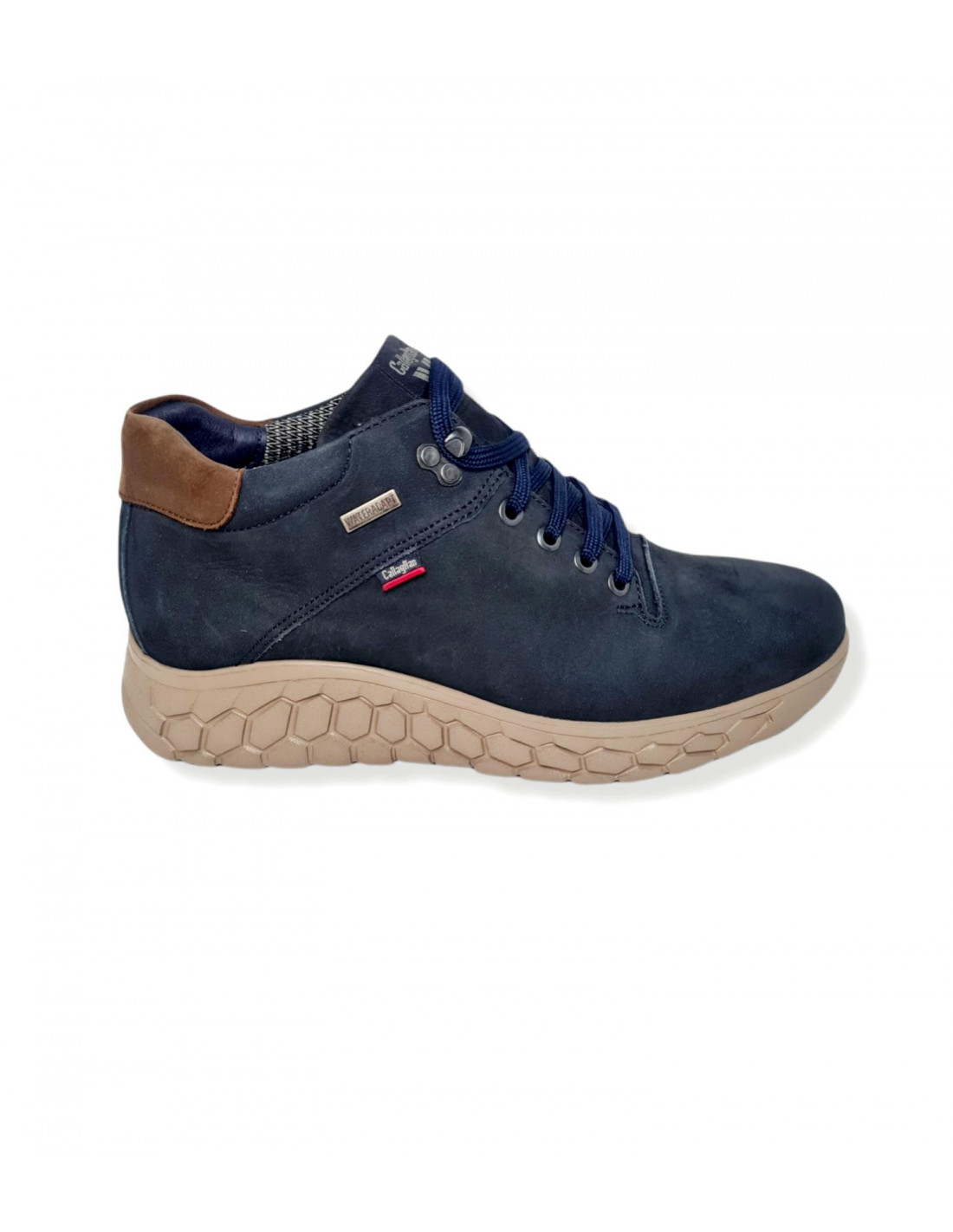 Botín fabricado en piel nobuk hidrofugada, que repele el agua, en color azul marino, además de estar dotado de la tecnología Water Adapt, que evita que penetre el agua en el interior del zapato aportando protección total contra la lluvia. Cierre mediante cordones para una correcta sujeción del pie. Se adapta al aumento de anchura que experimenta el pie al caminar.