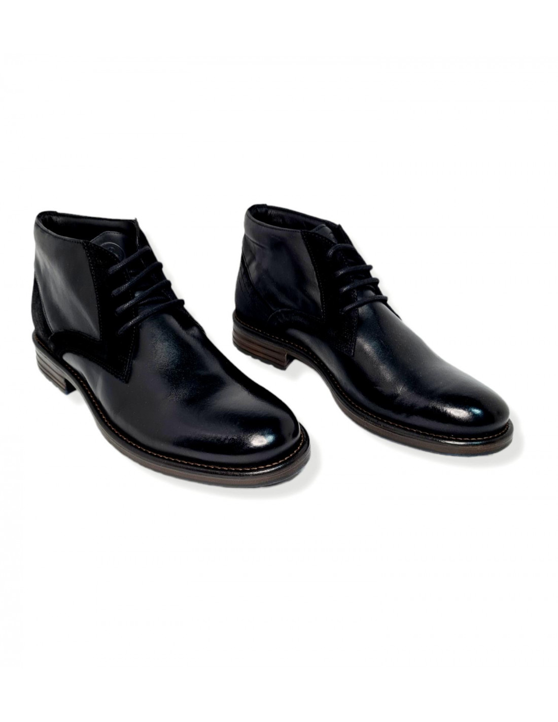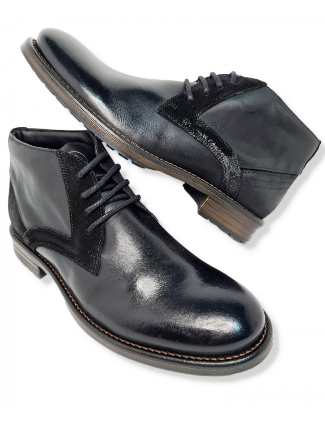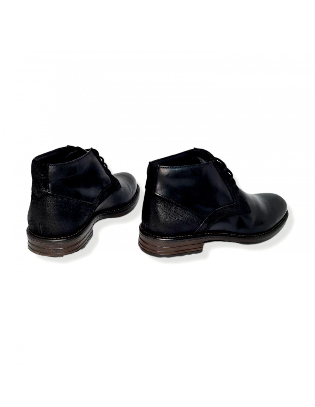 Botín en piel color negro, con cierre de cordonera central, para un buen calce. Diseño con parte trasera en color negro en serraje engrasado y zona de cierre de cordones, cuello acolchado para una mayor comodidad .