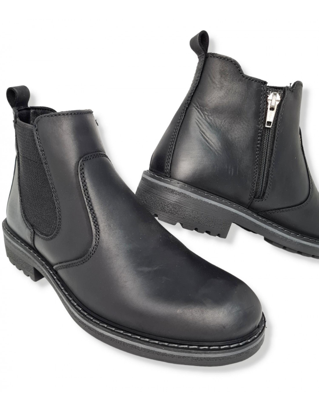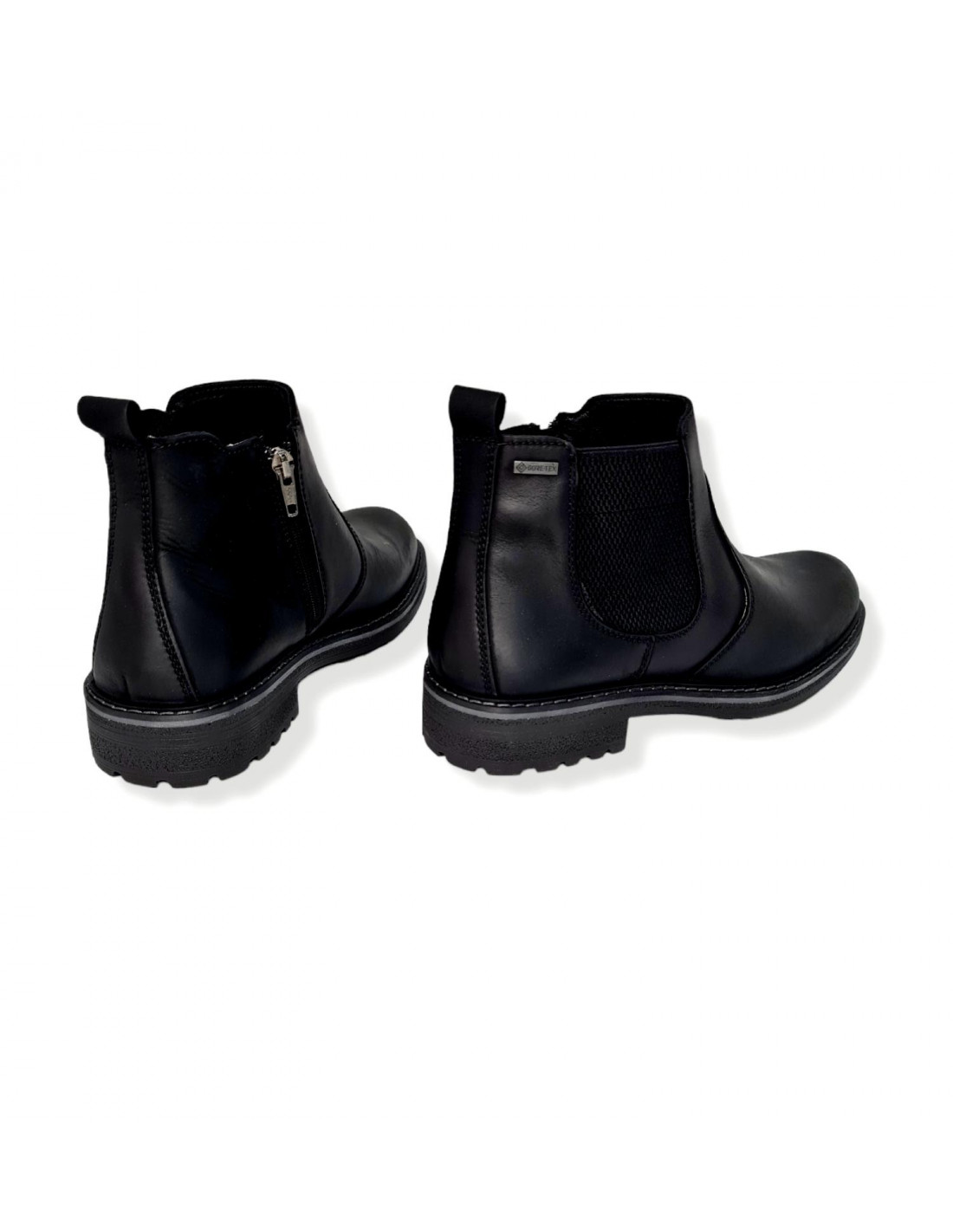 Botín de piel engrasada de primera calidad, en color negro. Cierre mediante cremallera interior, con fuelle en la parte externa del botín, tiene plantilla extraíble acolchada, dispone de Memory Foam, para que el caminar sea mucho más cómodo y confortable, está diseñado con GORE-TEX, que te ayuda a mantener los pies secos y calientes todo el invierno.