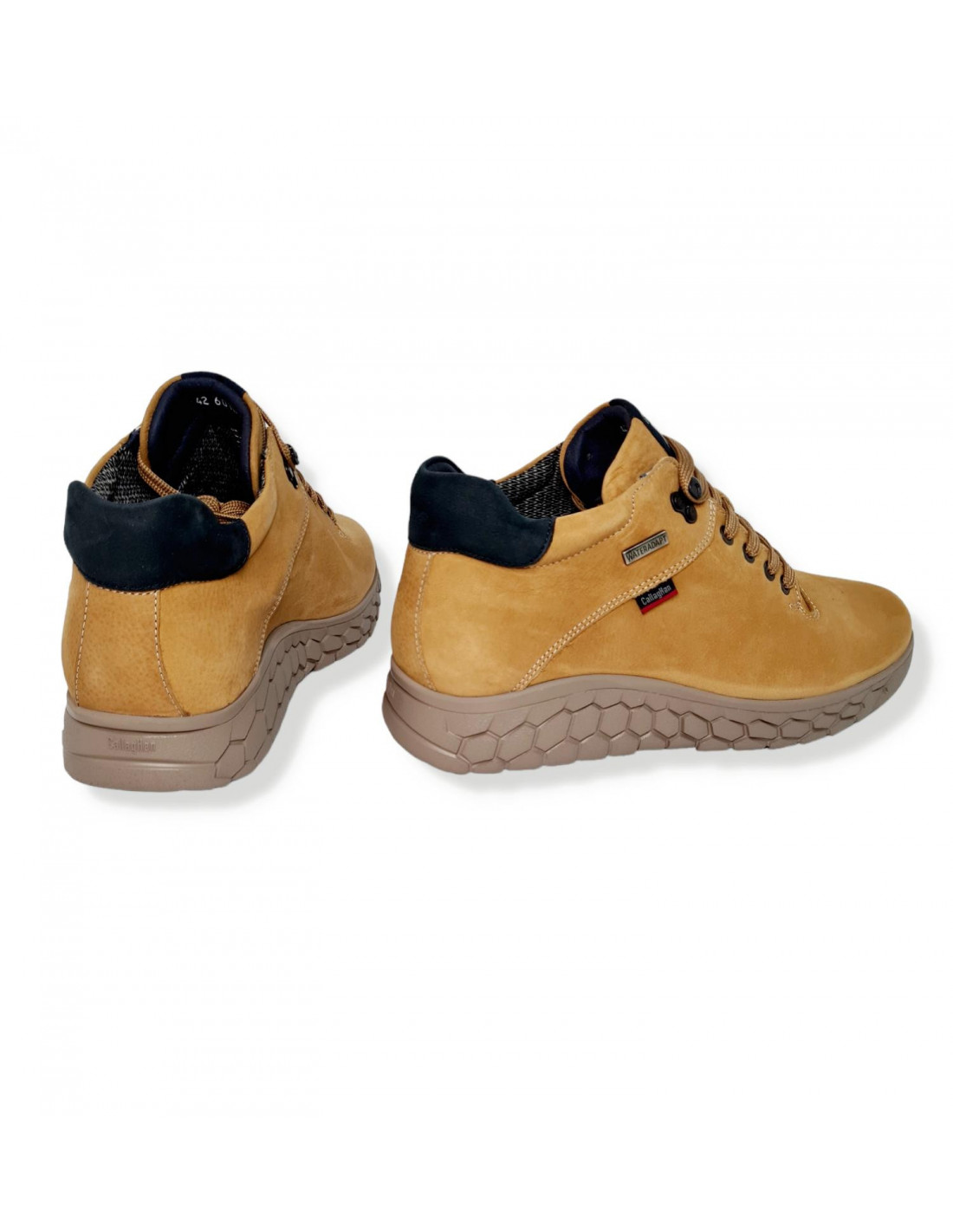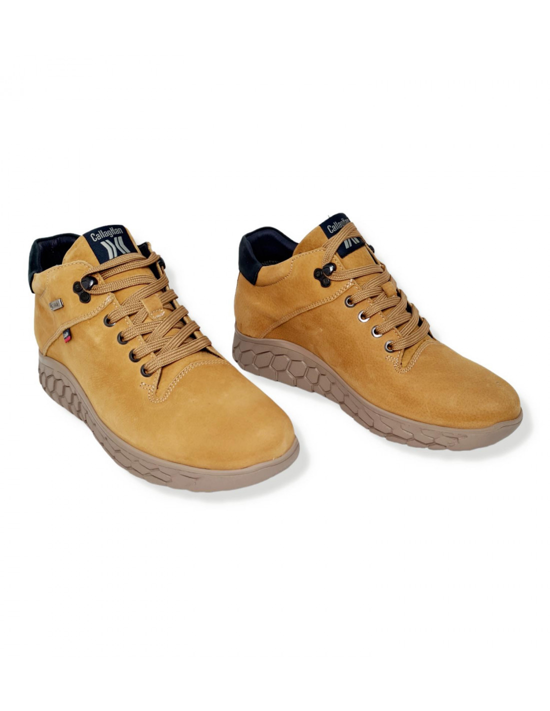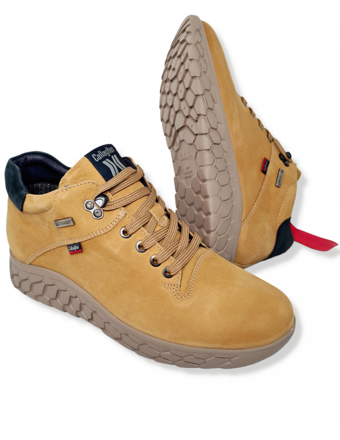 Botín fabricado en piel nobuk hidrofugada, que repele el agua, en color yema, además de estar dotado de la tecnología Water Adapt, que evita que penetre el agua en el interior del zapato aportando protección total contra la lluvia. Cierre mediante cordones para una correcta sujeción del pie. Se adapta al aumento de anchura que experimenta el pie al caminar.