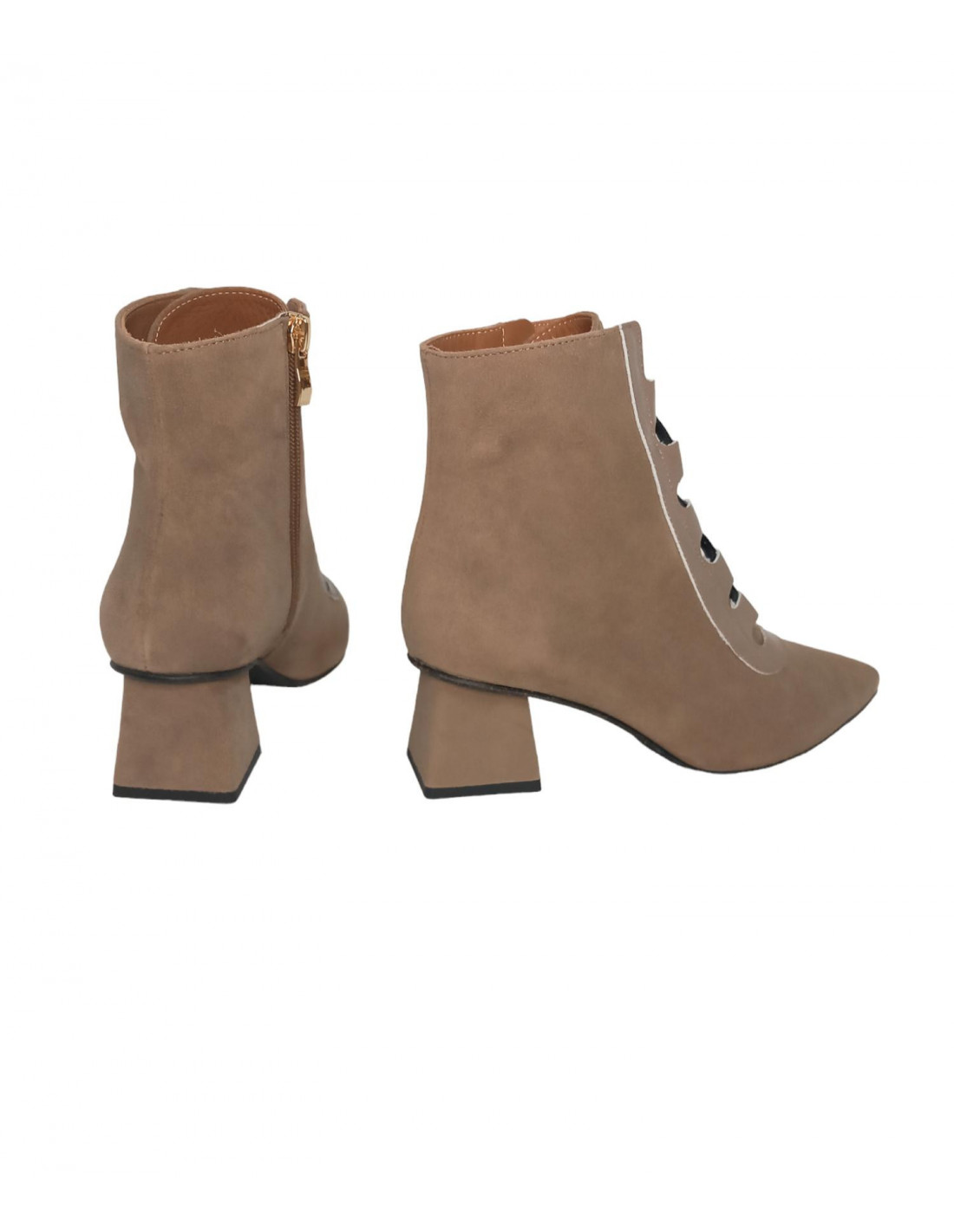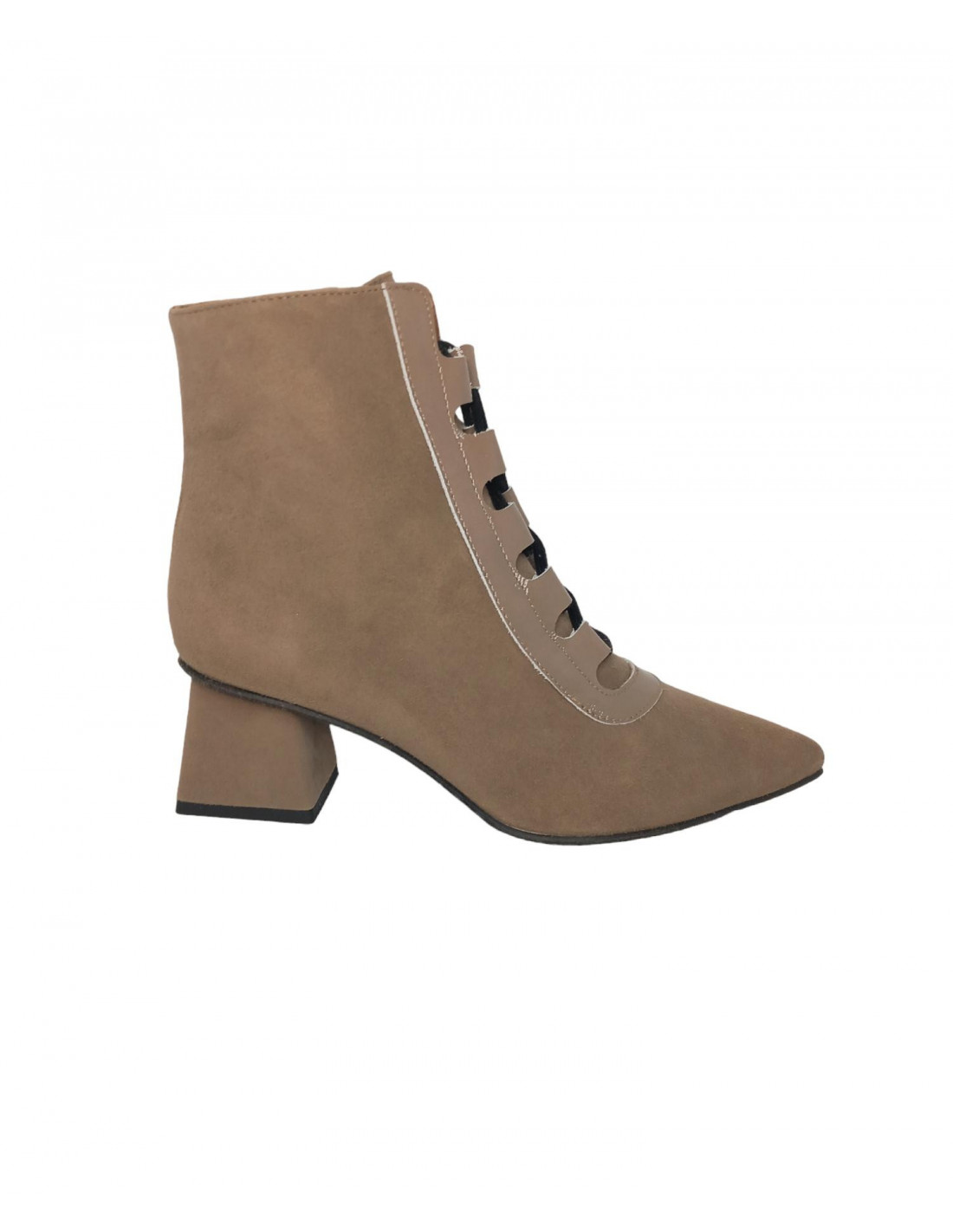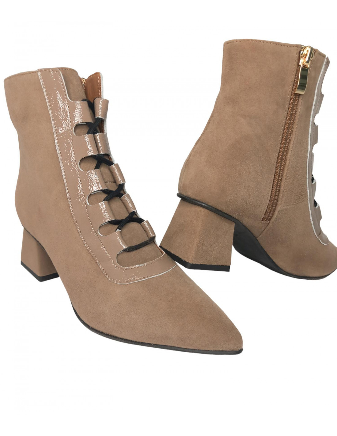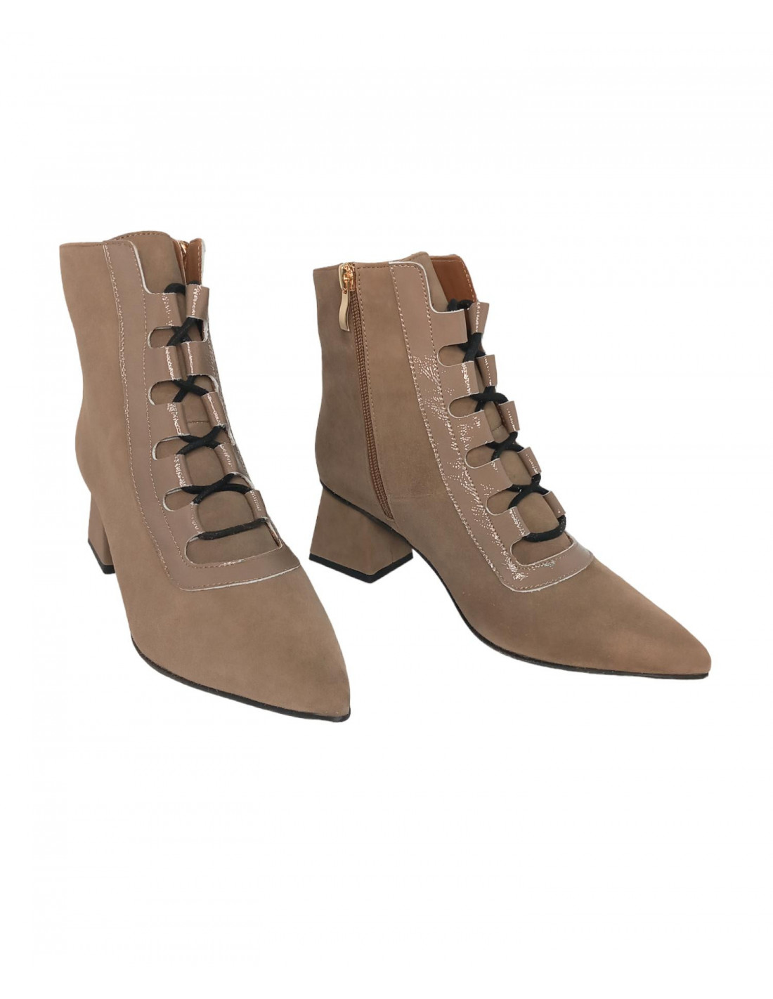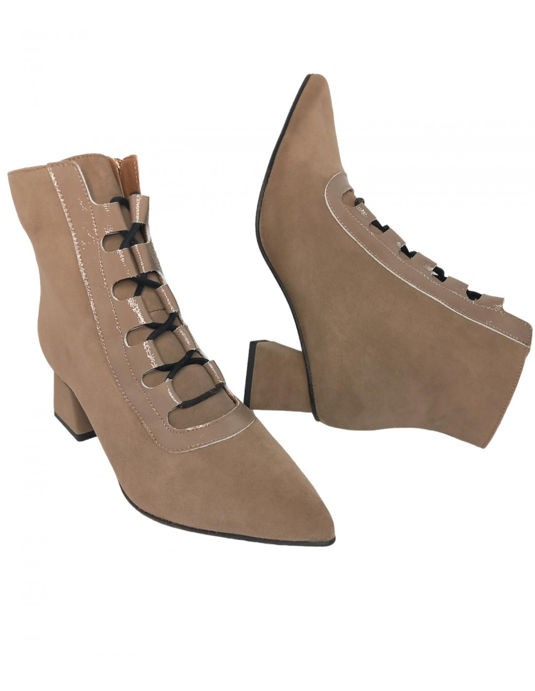Botín fino de ante en tono taupe, diseño en charol parte frontal y cordonera, super estiloso con acabado en punta, cierre de cremallera en parte interior.