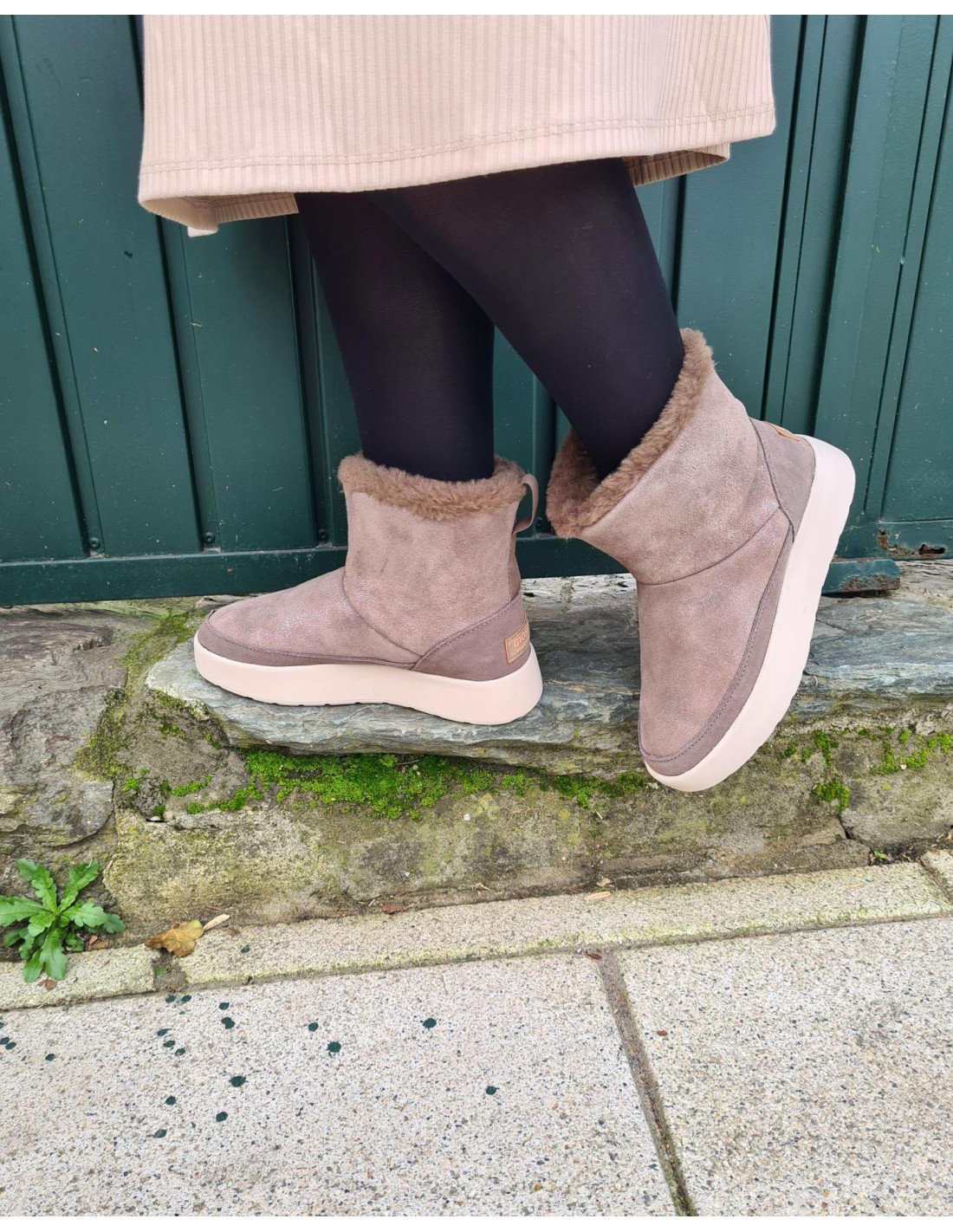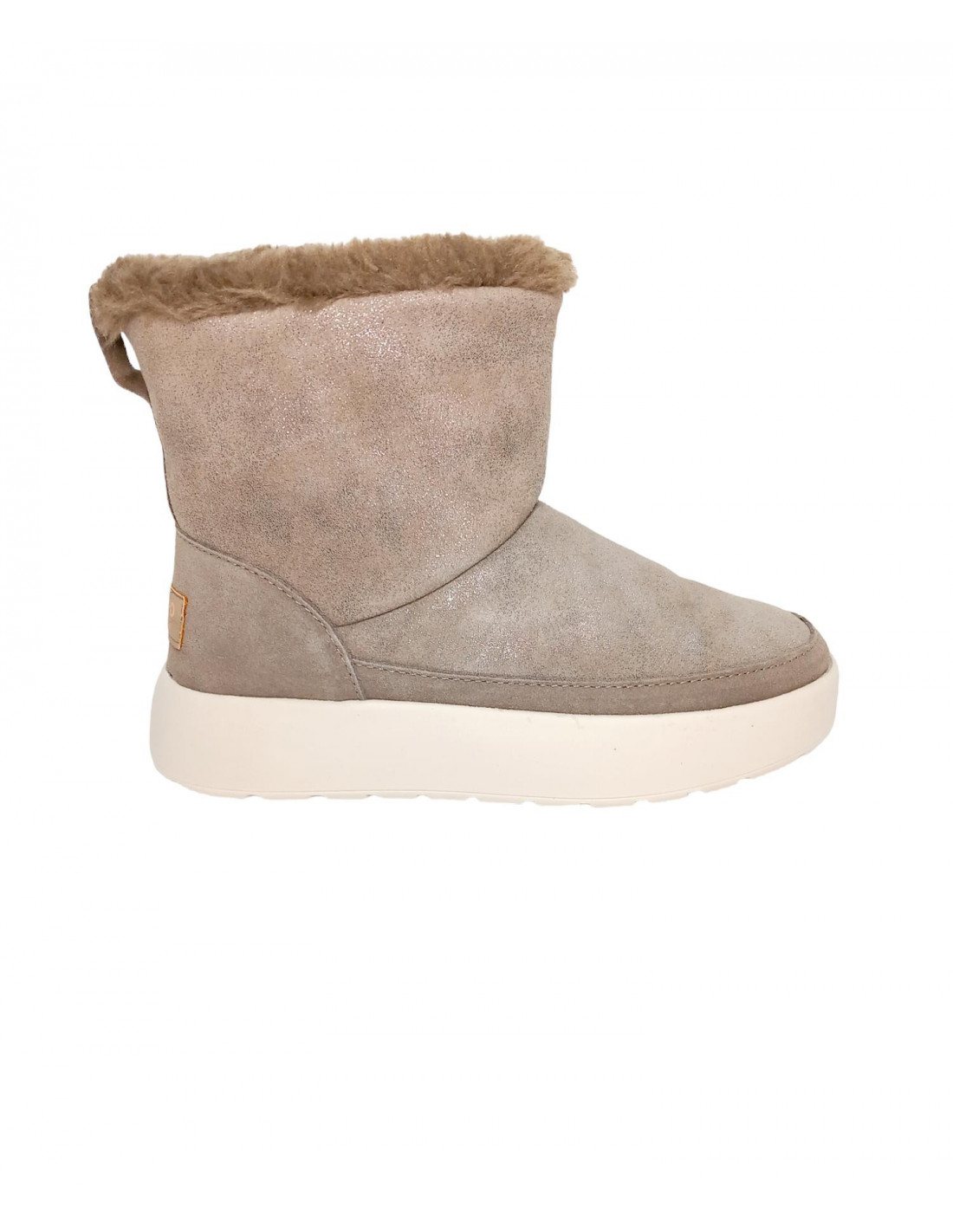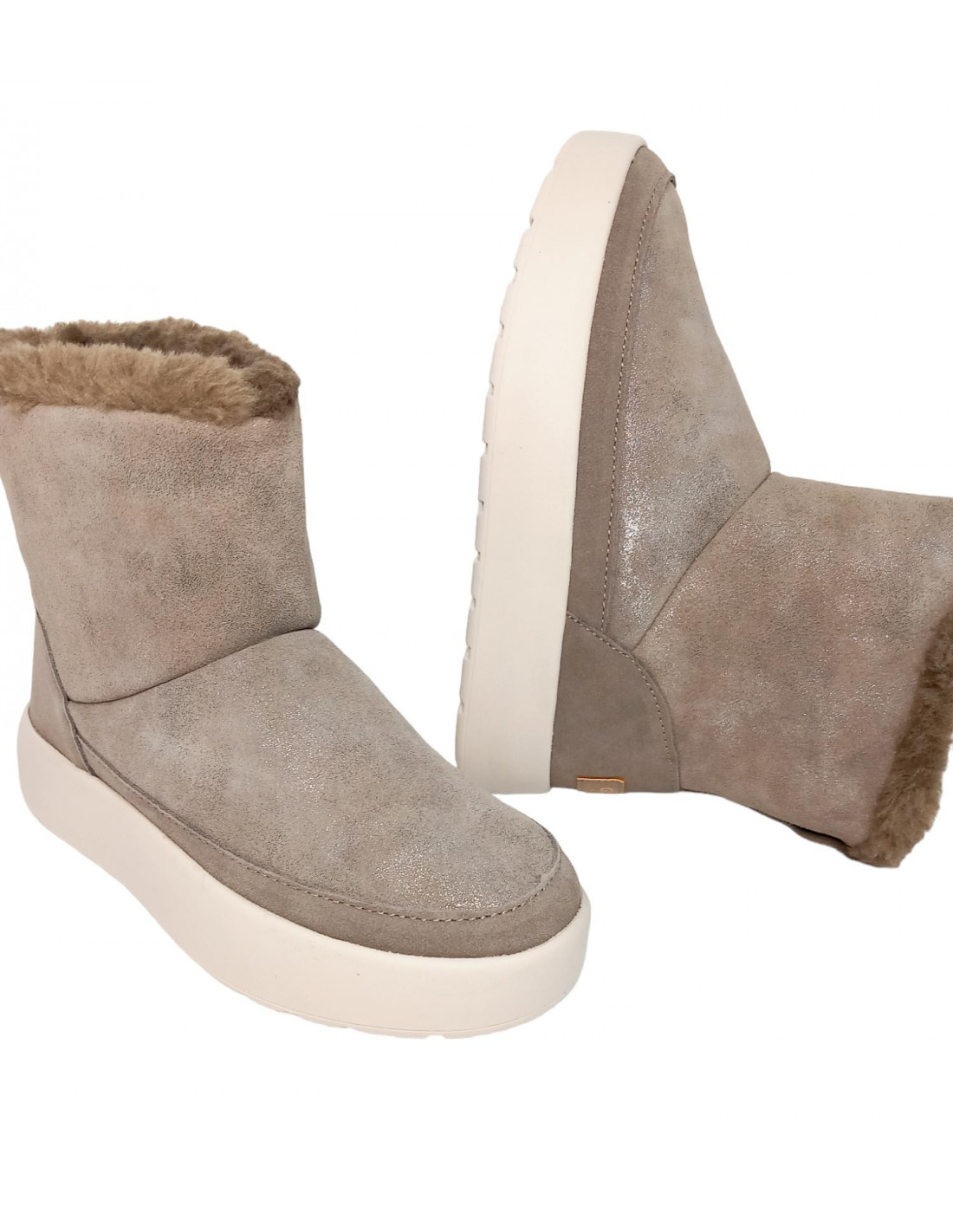 Botín tipo australiano de serraje color taupe metalizado, dispone de tirador trasero para ayudar con su calce. Forro interior de pelo suave con plantilla extraíble. Suela de goma de una altura de 4 cm. y plataforma delantera de 3 cm. aprox.