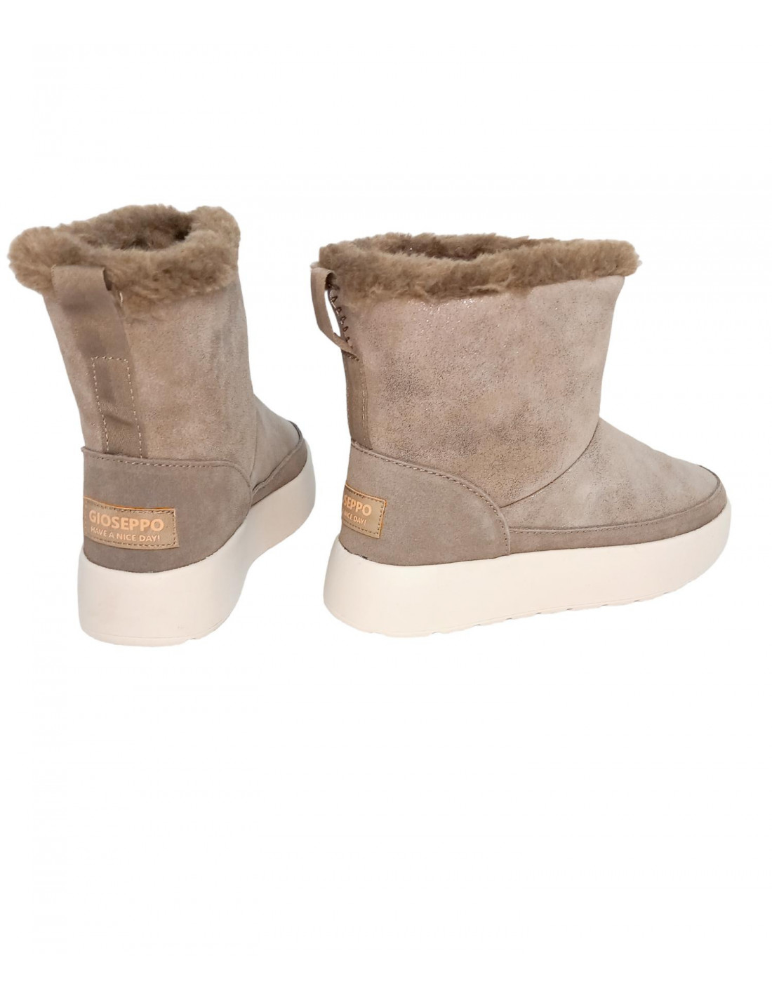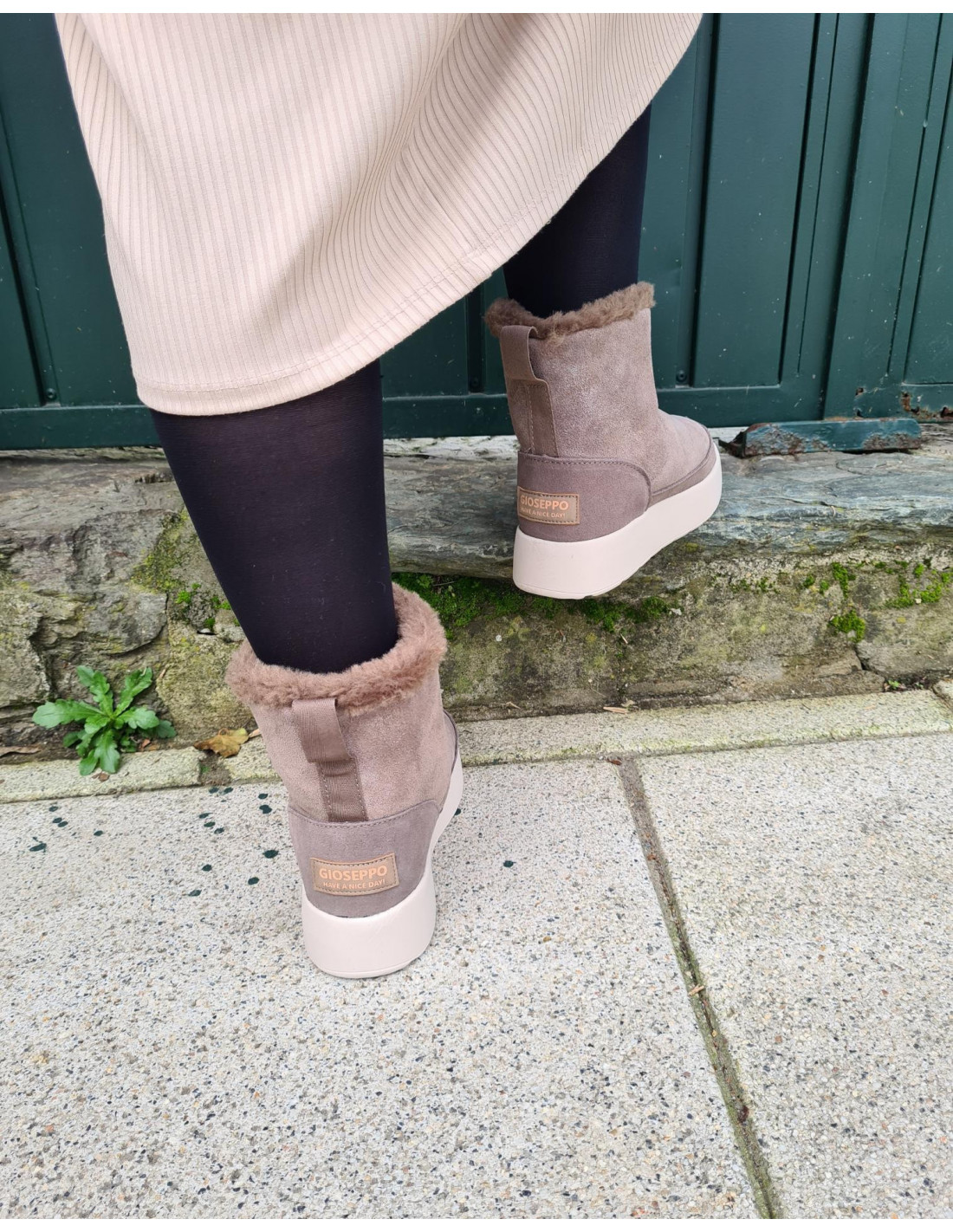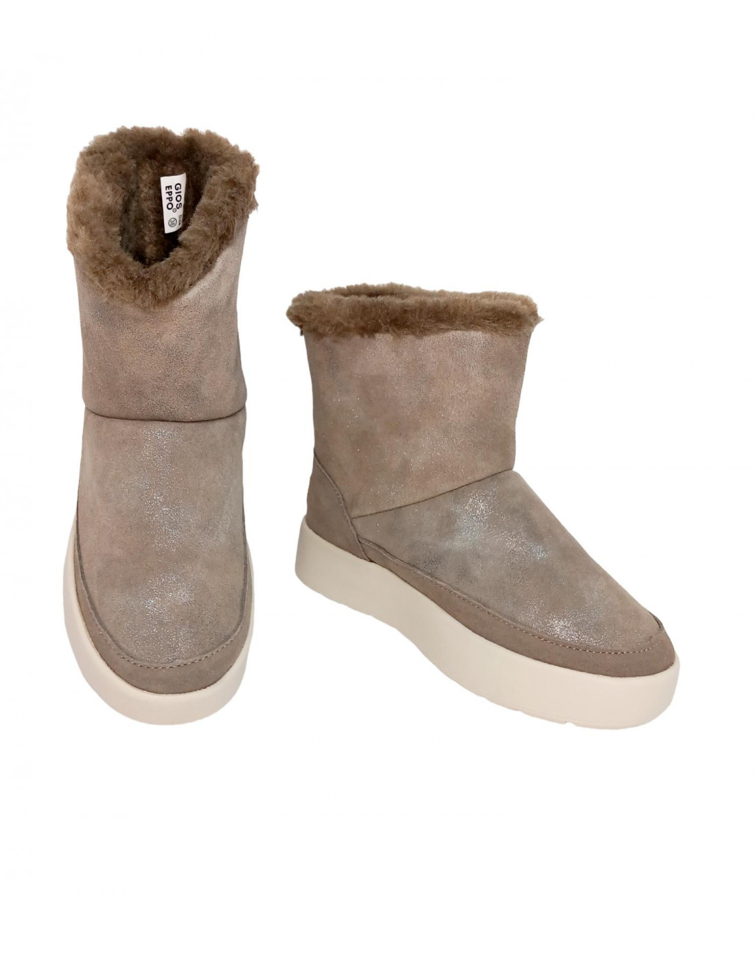 Botín tipo australiano de serraje color taupe metalizado, dispone de tirador trasero para ayudar con su calce. Forro interior de pelo suave con plantilla extraíble. Suela de goma de una altura de 4 cm. y plataforma delantera de 3 cm. aprox.