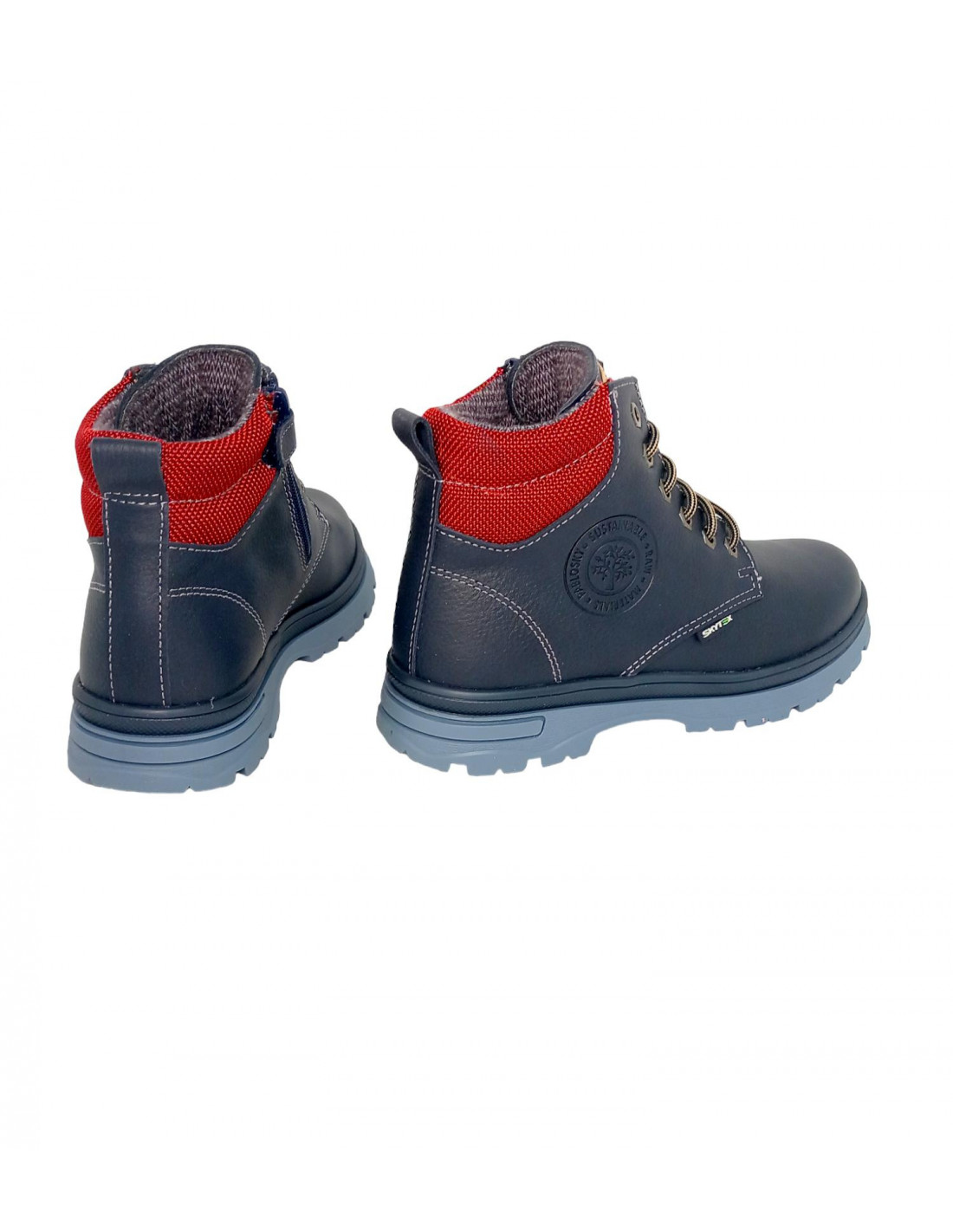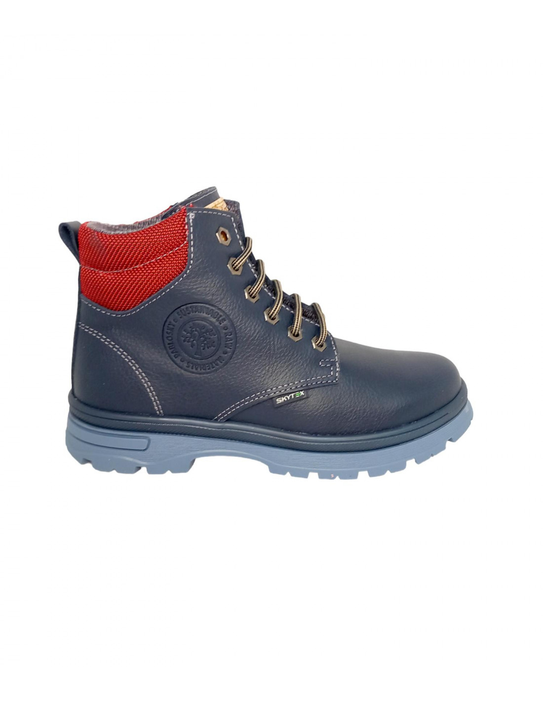 Botín en piel hidrofugada que repele el agua, garantiza la correcta transpiración del pie y cuenta con el certificado ambiental LWG, calzado con la tecnología SKYTEX, pies secos y cómodos en un una gran variedad de condiciones climáticas, en color azul marino con cuello acolchado en rojo y cierre de cordones y cremallera en la parte interna del botín.