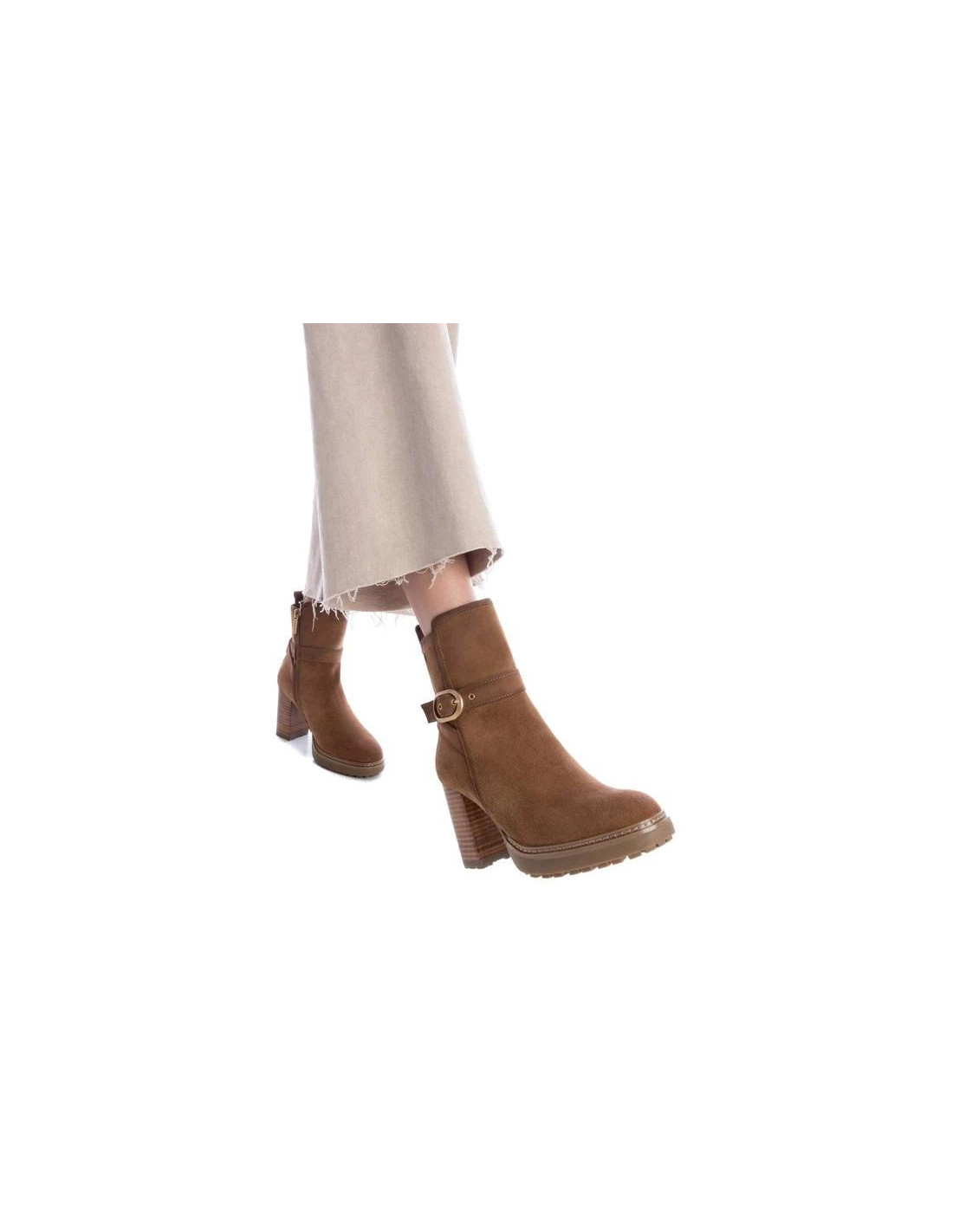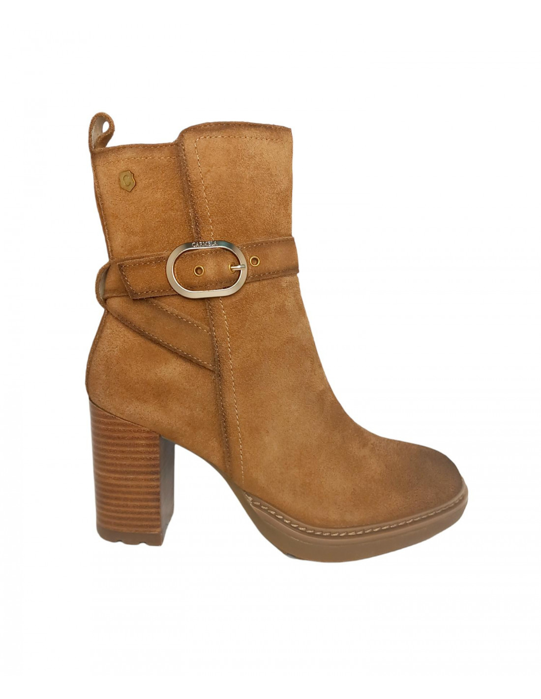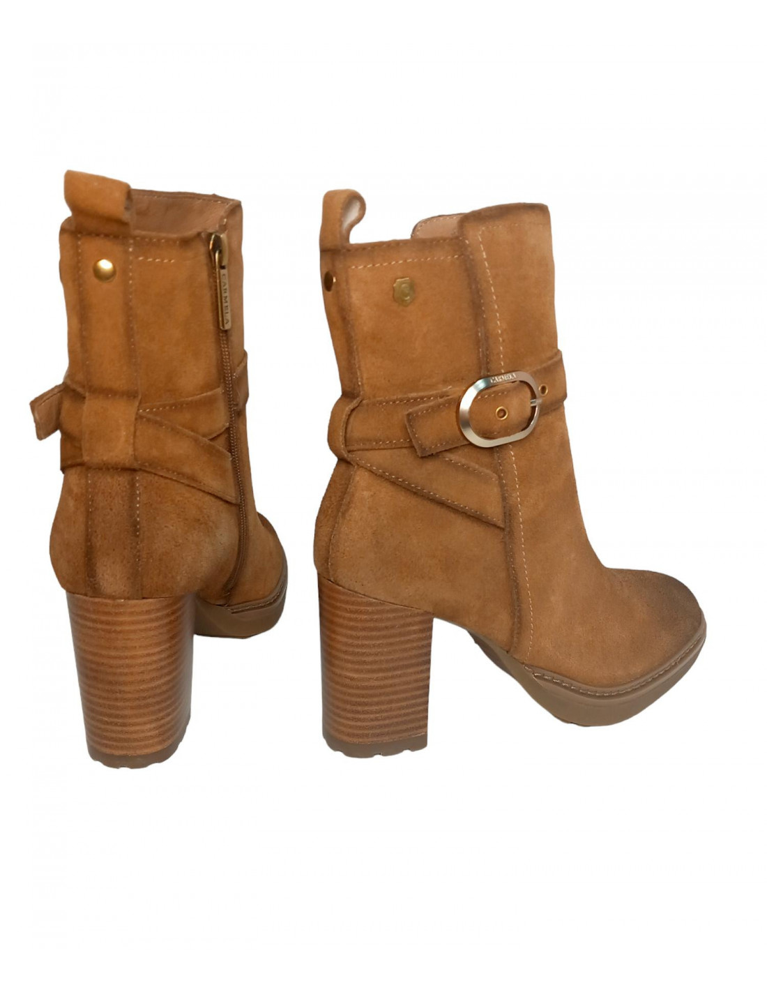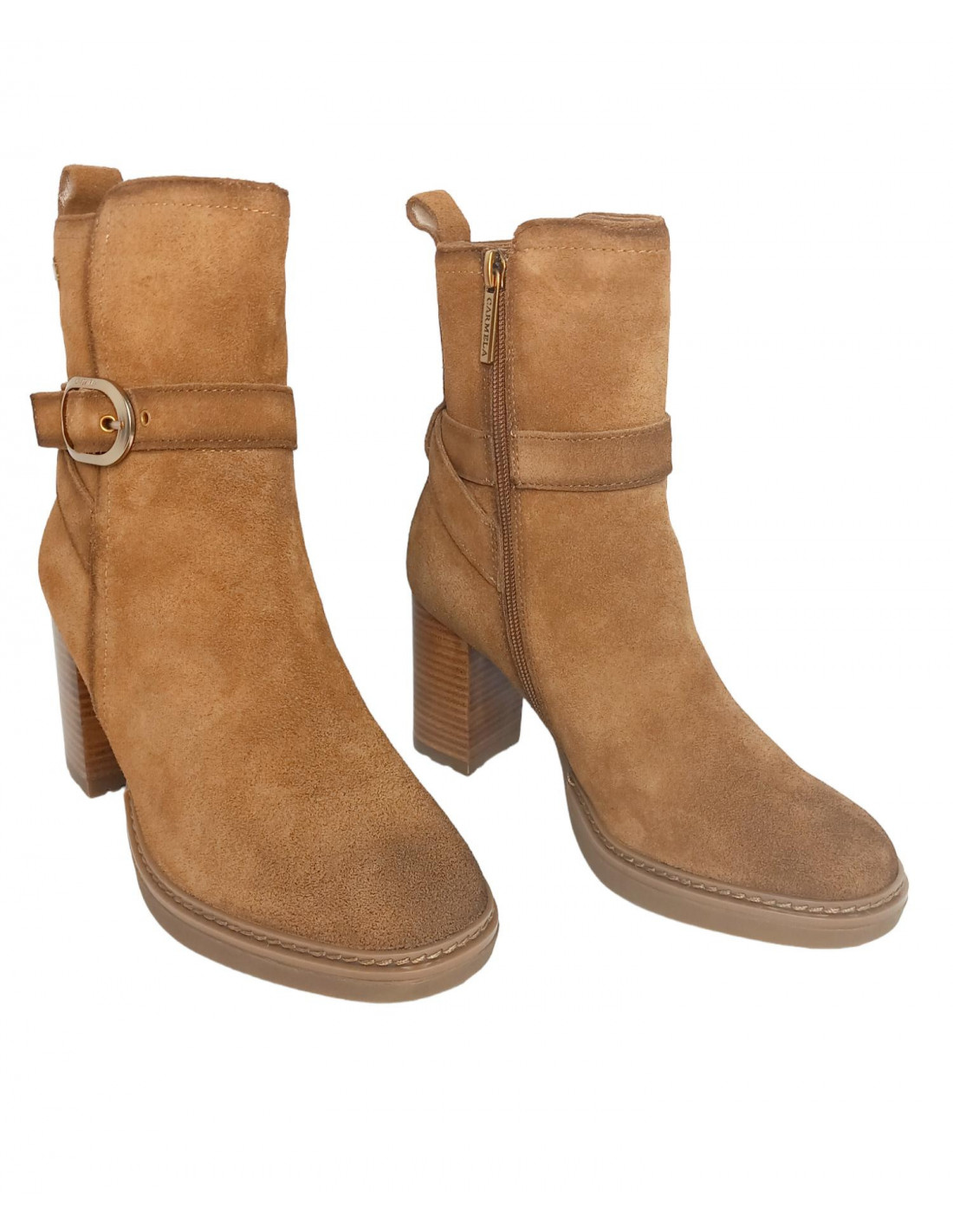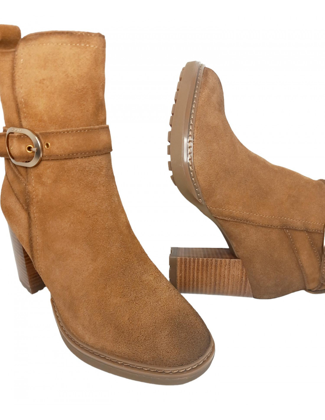 Botín fabricado en serraje de alta calidad en color camel. Cierre mediante cremallera en la parte interior del botín, tirador trasero para un mejor calce y con diseño de correa decorativa con hebilla metálica.