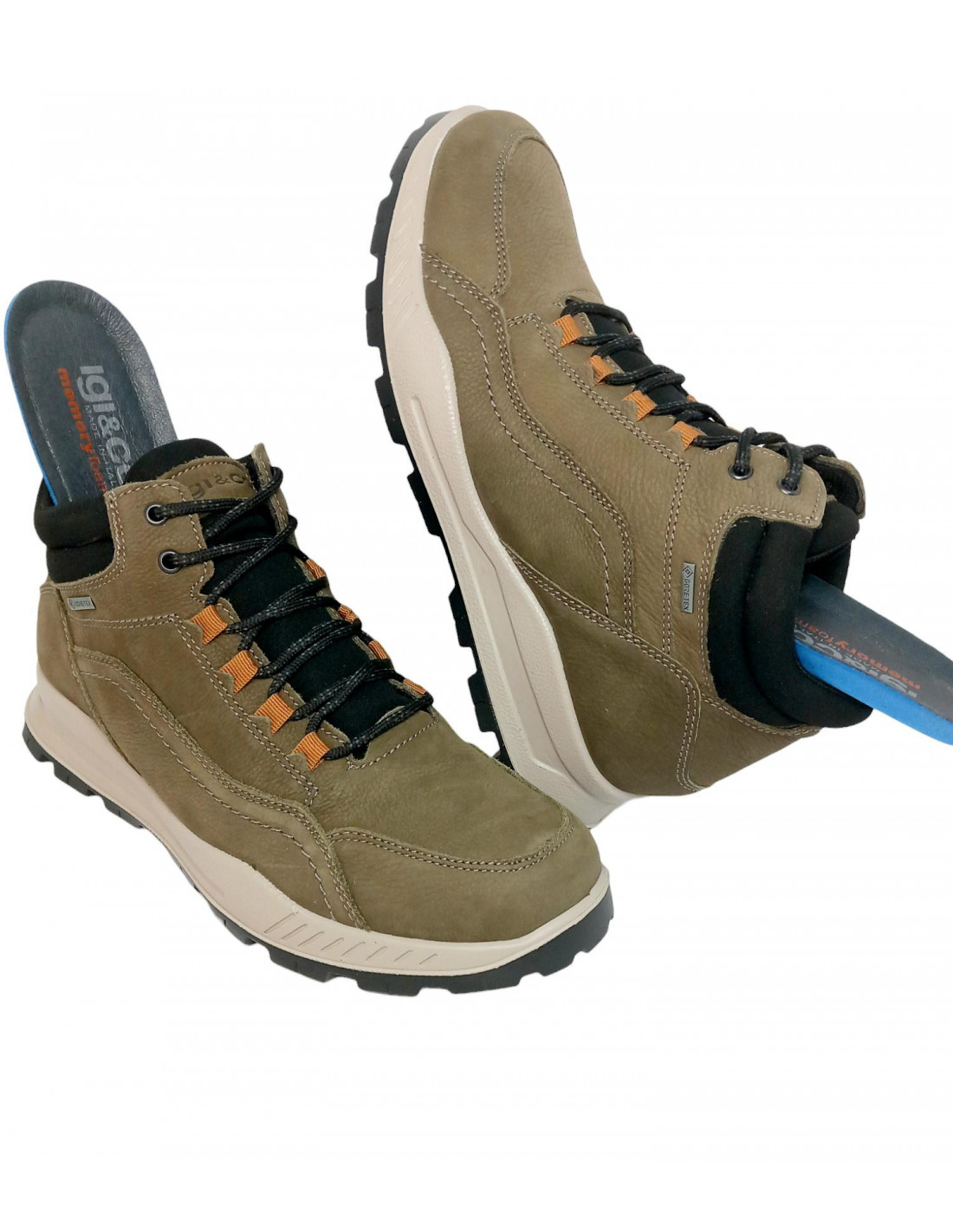 Botín sport de piel en color kaki. Cierre mediante cordones jaspeados, talonera acolchada para una mayor comodidad, plantilla extraíble anatómica y acolchada, dispone de Memory Foam, para que el caminar sea mucho más cómodo y confortable, dispone de forro GORE-TEX, que garantiza impermeabilidad y transpiración.