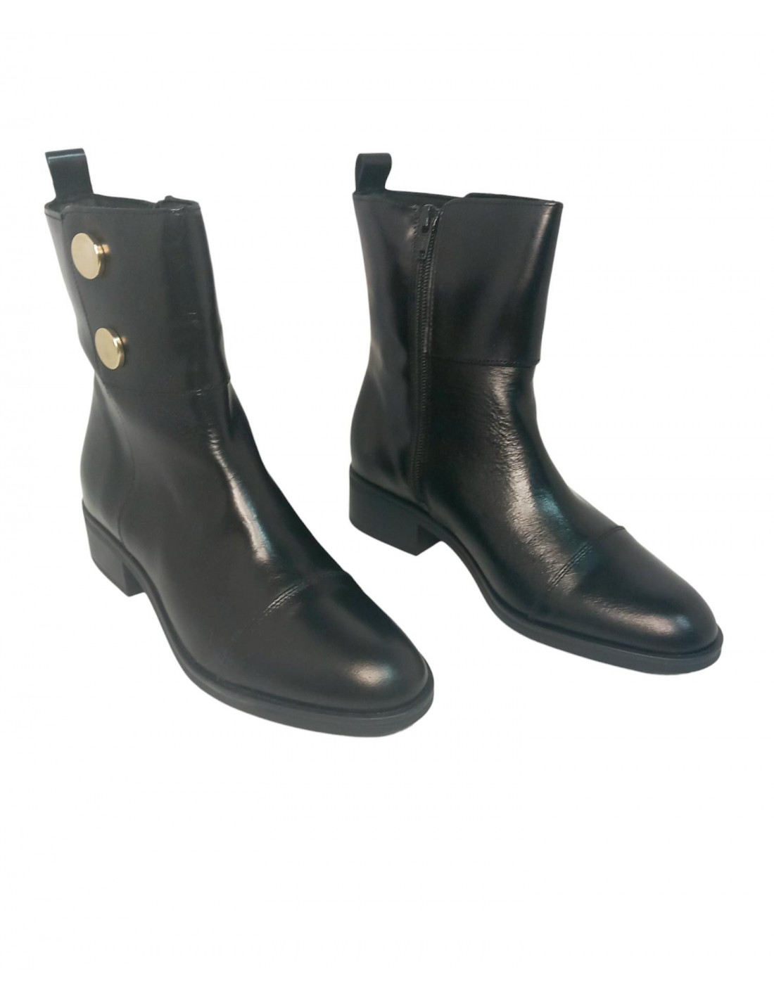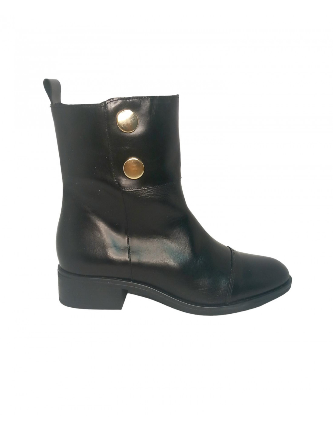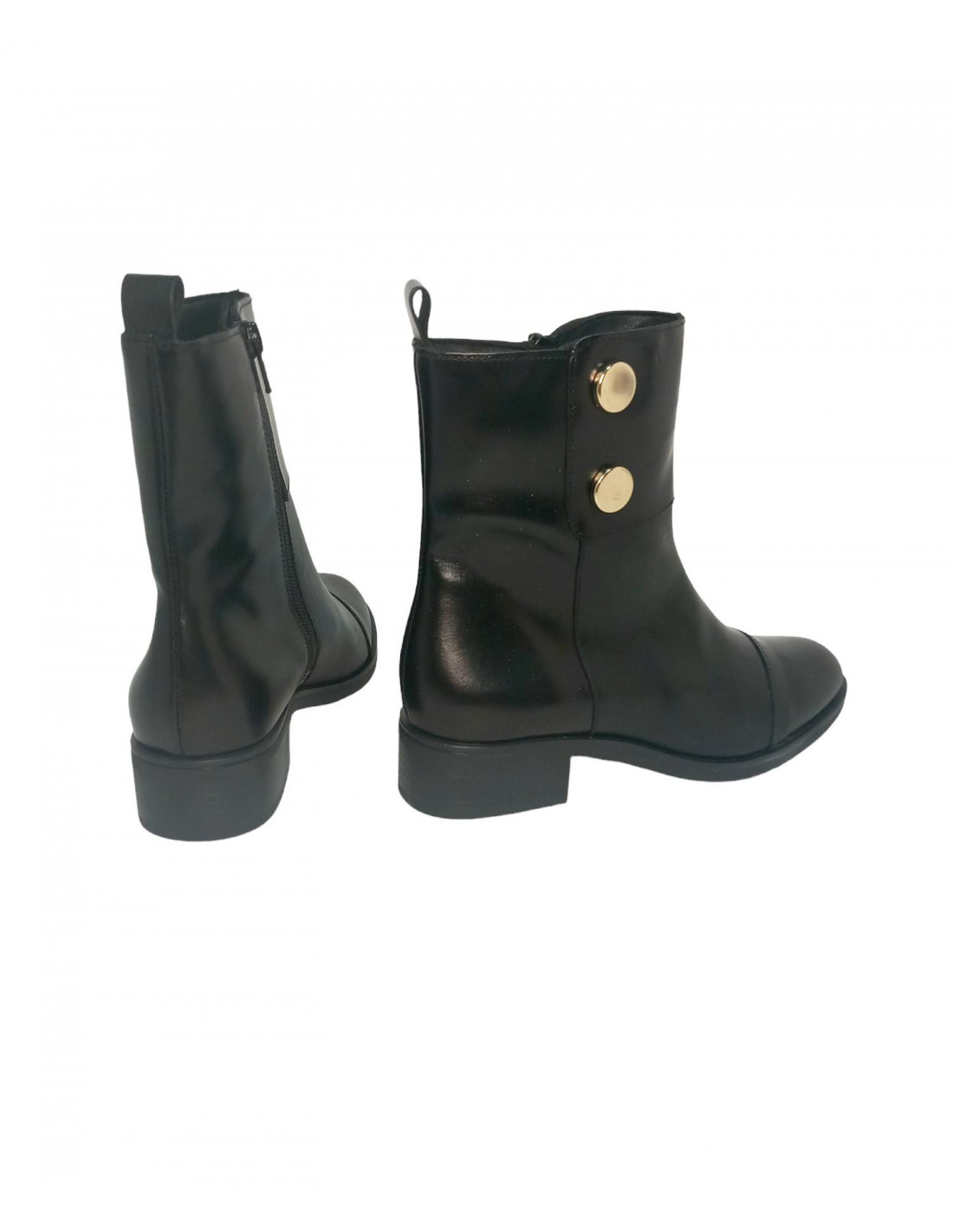 Botín en piel de primera calidad 100%, en color negro, forro interior en textil y plantilla en piel. Este modelo dispone de tirador trasero, viene con cierre de cremallera por la parte interna, además cuenta con adorno de broches dorados en la parte exterior que lo hace super elegante y original, con tacón ancho de 3,5 cm y caña de 15,5 cm.