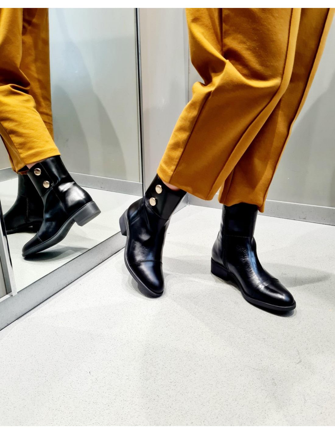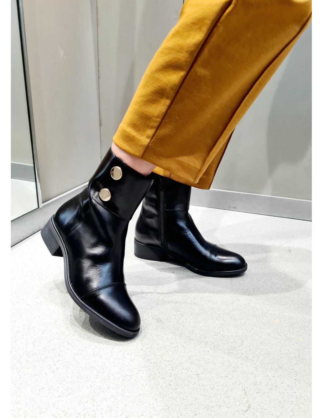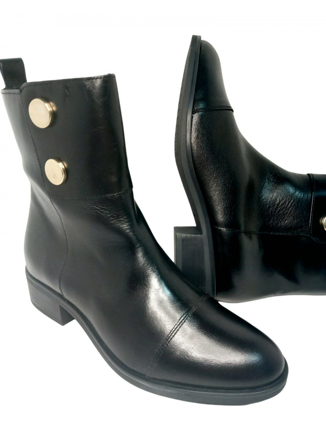Botín en piel de primera calidad 100%, en color negro, forro interior en textil y plantilla en piel. Este modelo dispone de tirador trasero, viene con cierre de cremallera por la parte interna, además cuenta con adorno de broches dorados en la parte exterior que lo hace super elegante y original, con tacón ancho de 3,5 cm y caña de 15,5 cm.