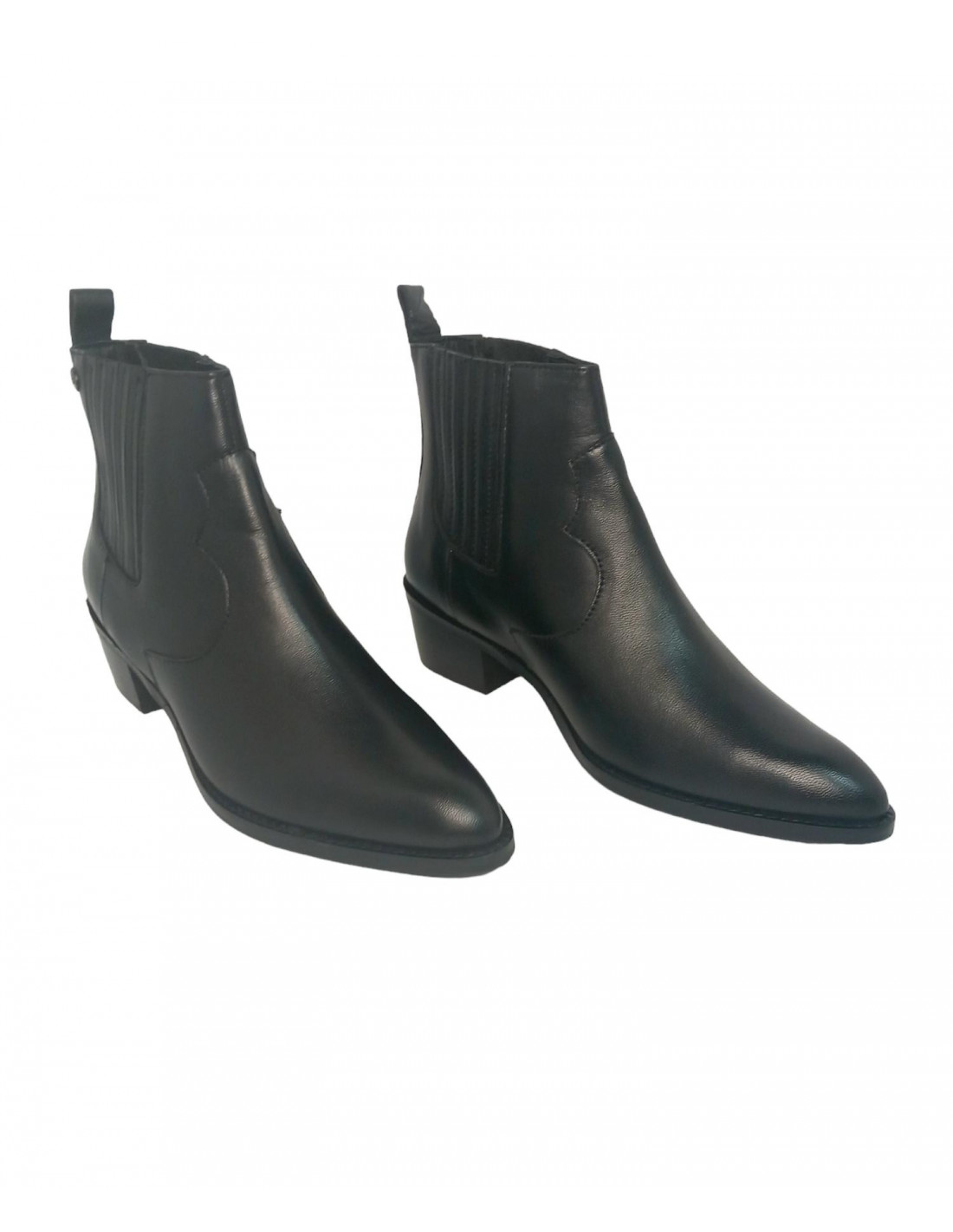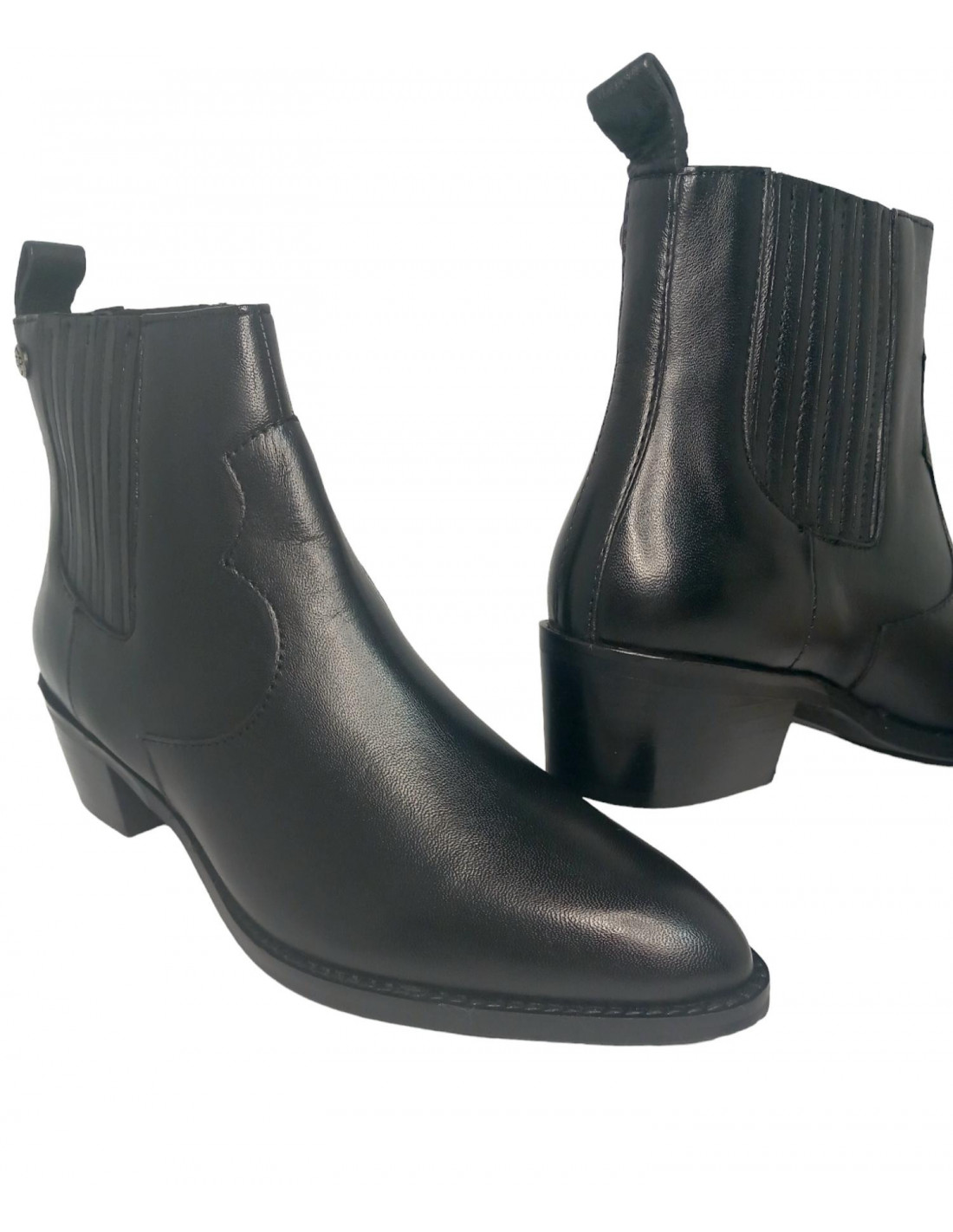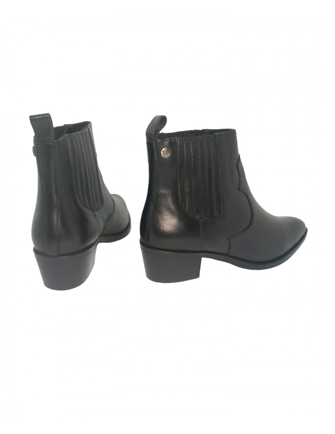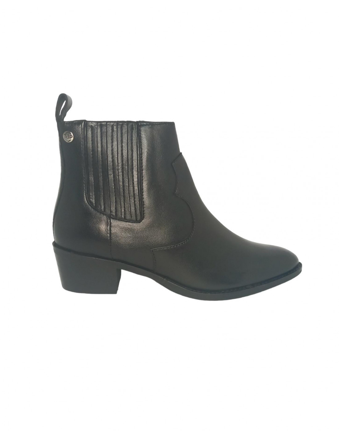 Botín tipo campero en piel de primera calidad 100%, en color negro, forro interior en textil y plantilla en piel. Este modelo viene con fuelles laterales y tirador trasero para un buen calce, un top esta temporada, cómodo y super combinable, con tacón ancho de 4,5 cm y caña de 11,5 cm.