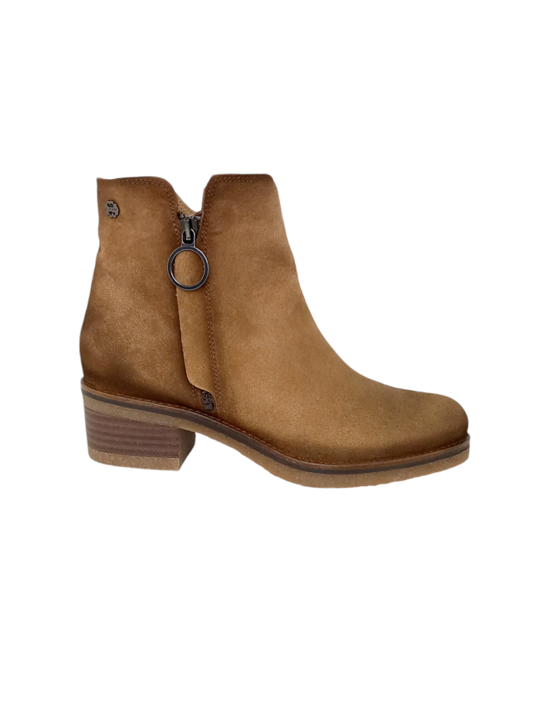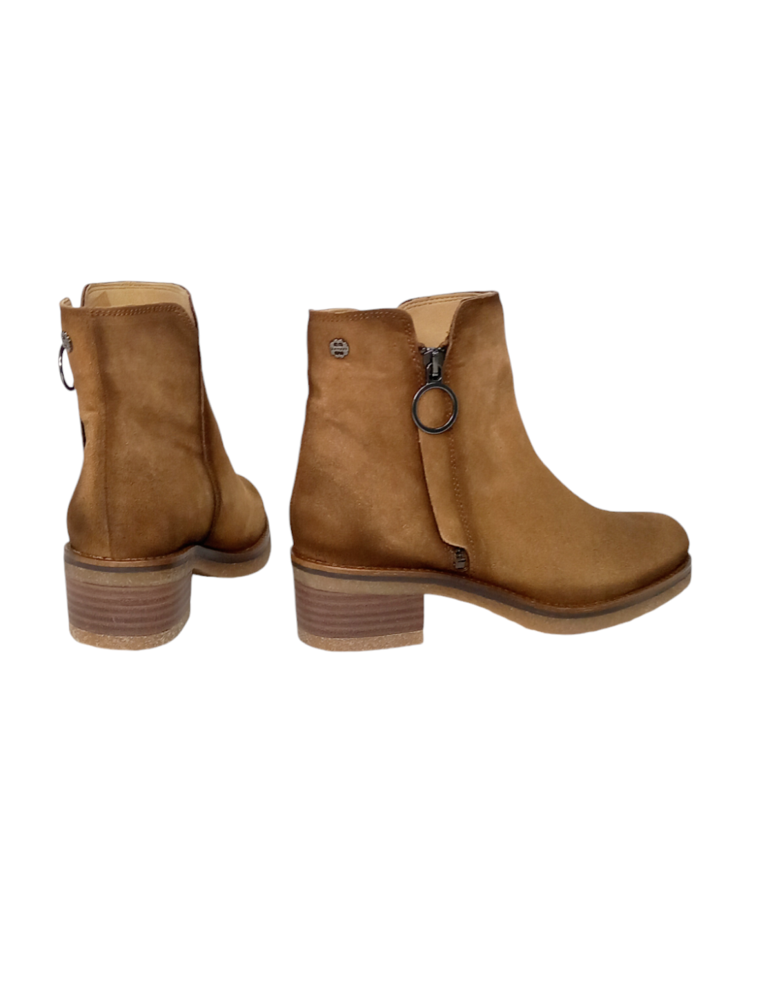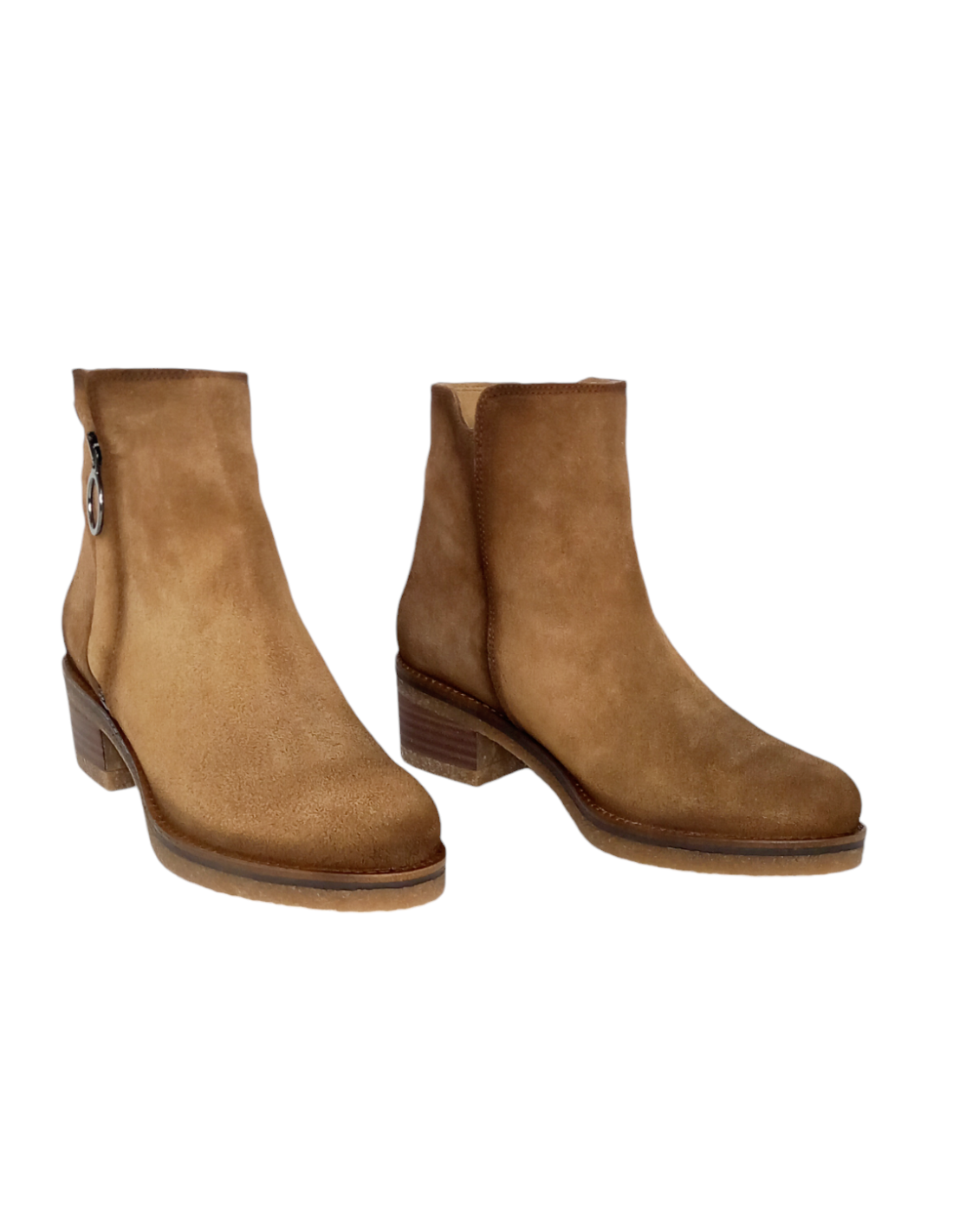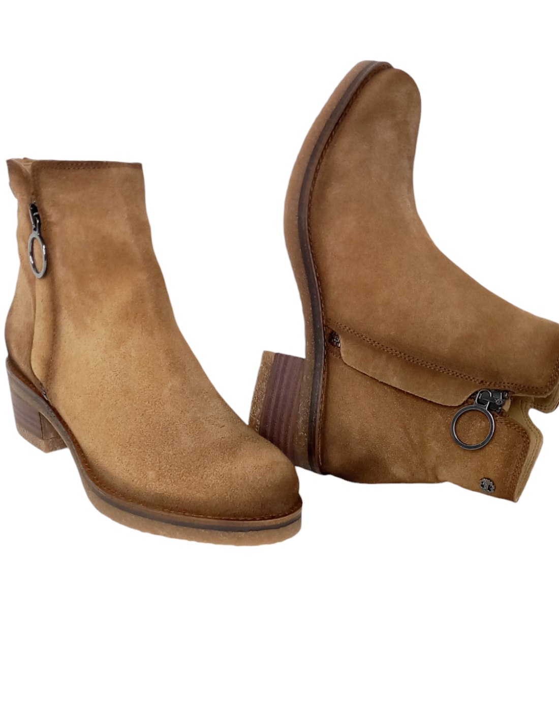 Botín en serraje de colores cuero y burdeos, con cierre de cremallera por la parte exterior.