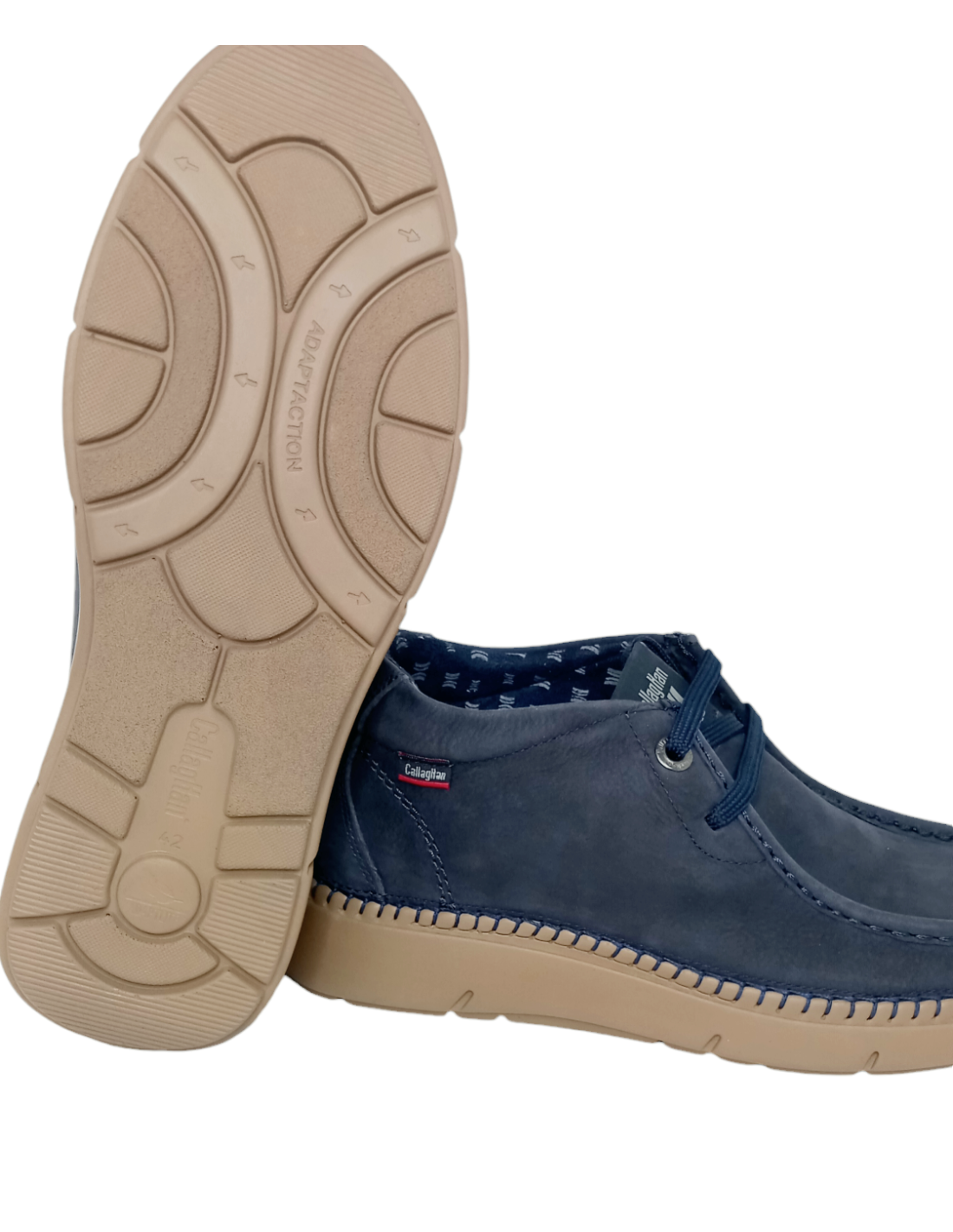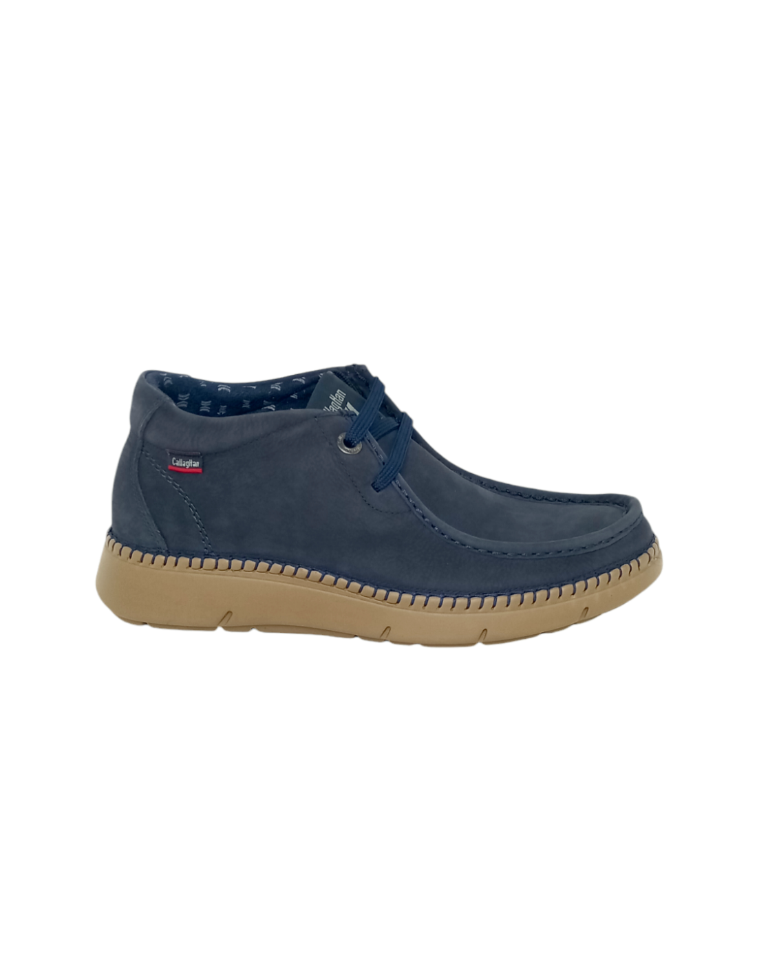 Zapato abotinado fabricado en piel nobuck de máxima calidad con aspecto aterciopelado en color azul marino. Este diseño cuenta un original pespunte a la vista en la unión con la suela, ambos de color tostado.