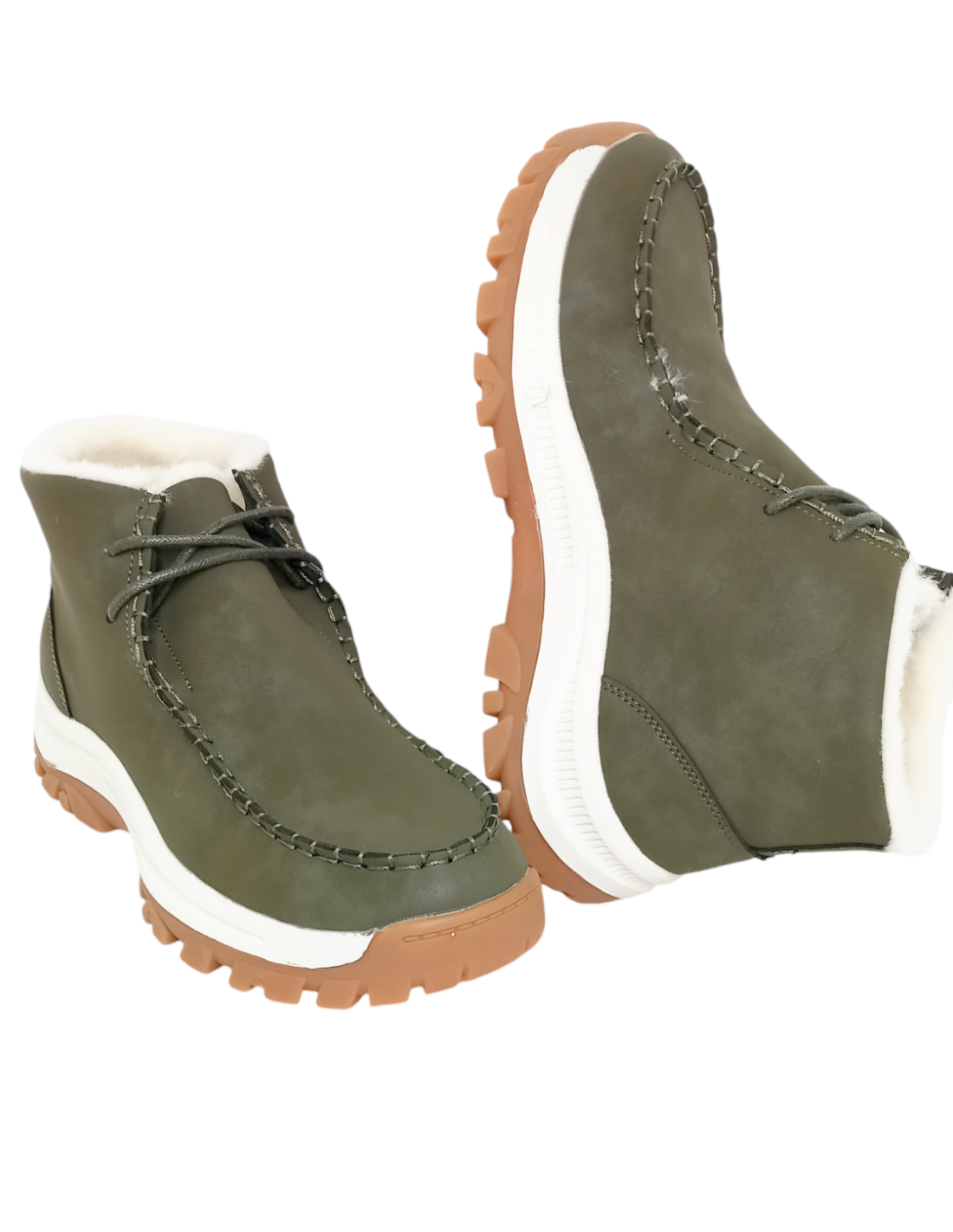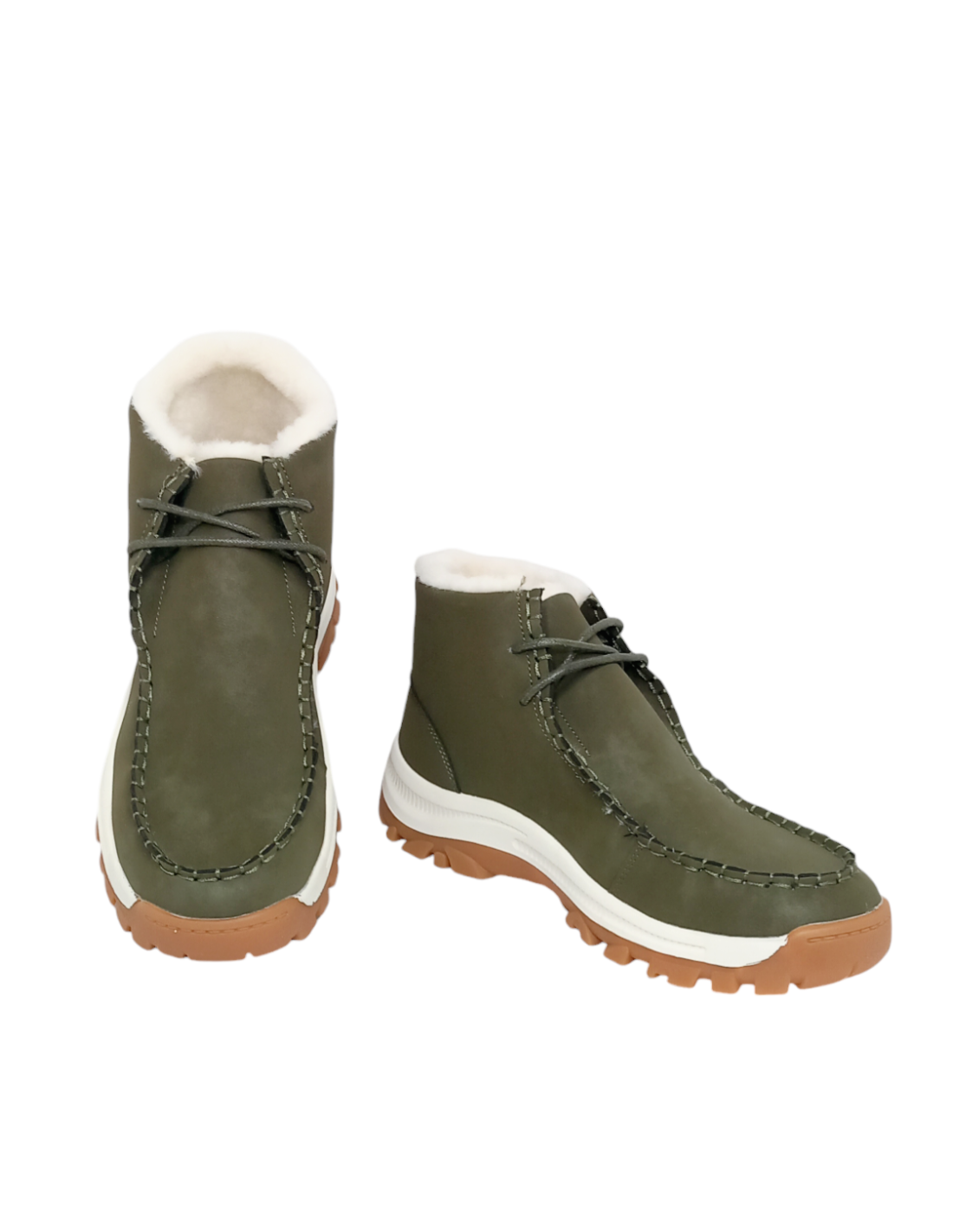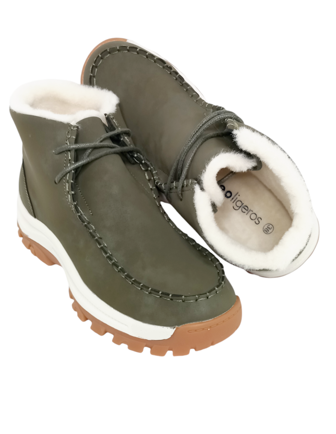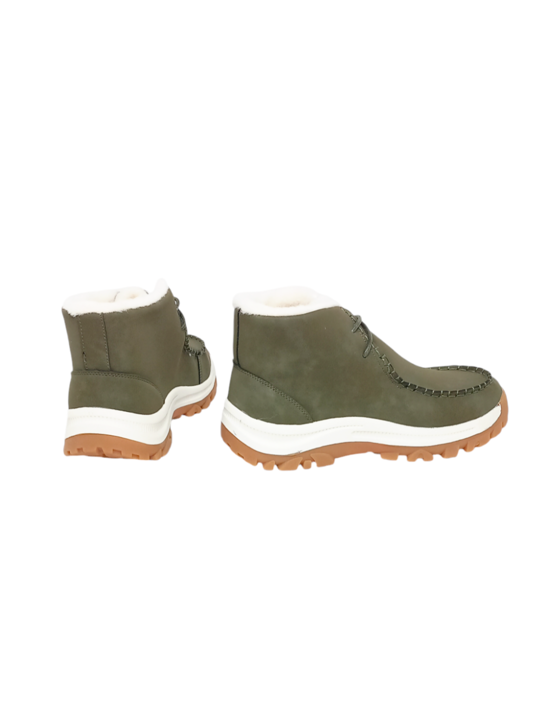 Zapato abotinado de estilo sport fabricado en símil piel efecto nobuck en colores verde kakhi y blanco.