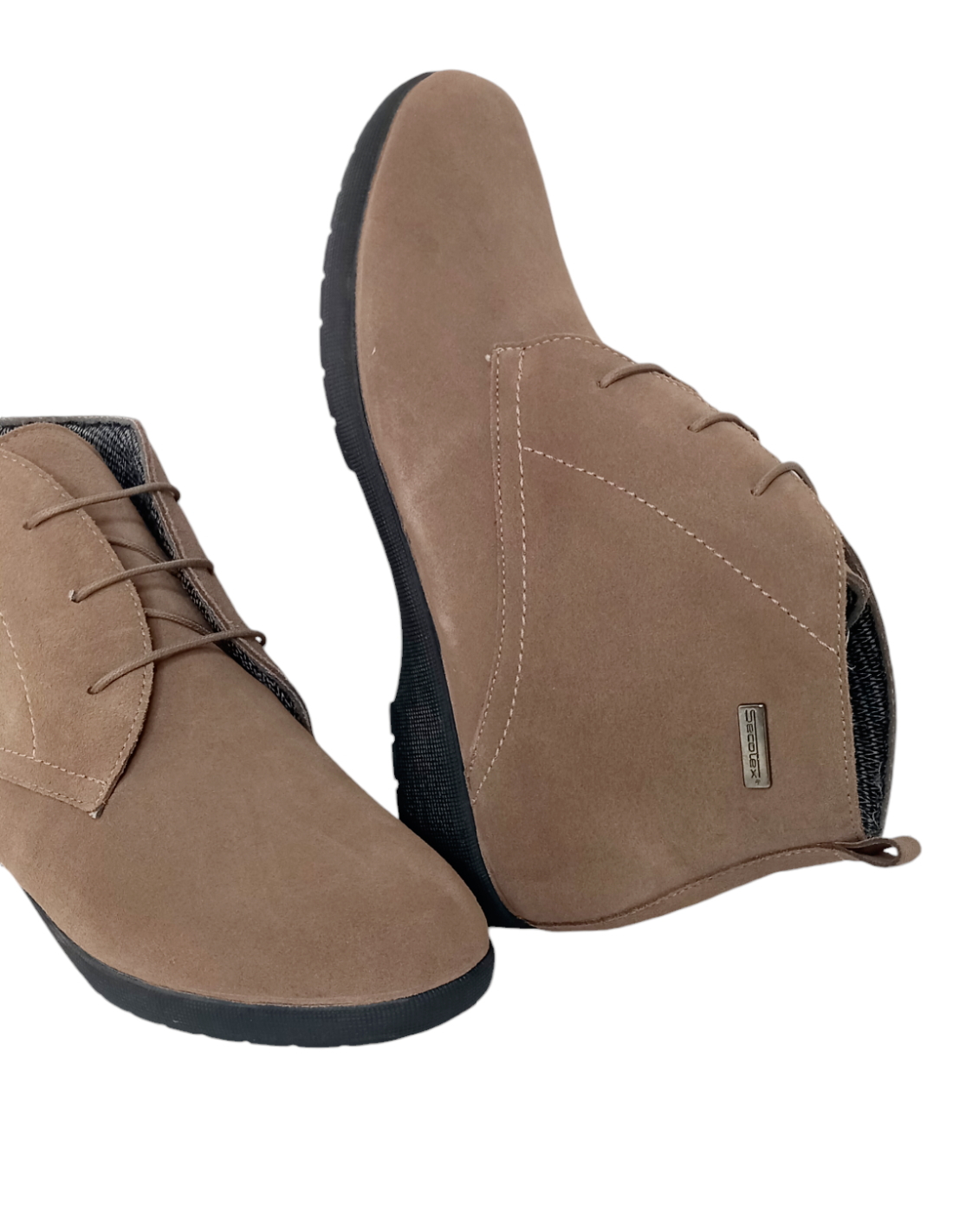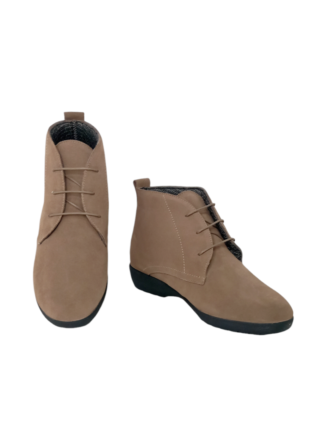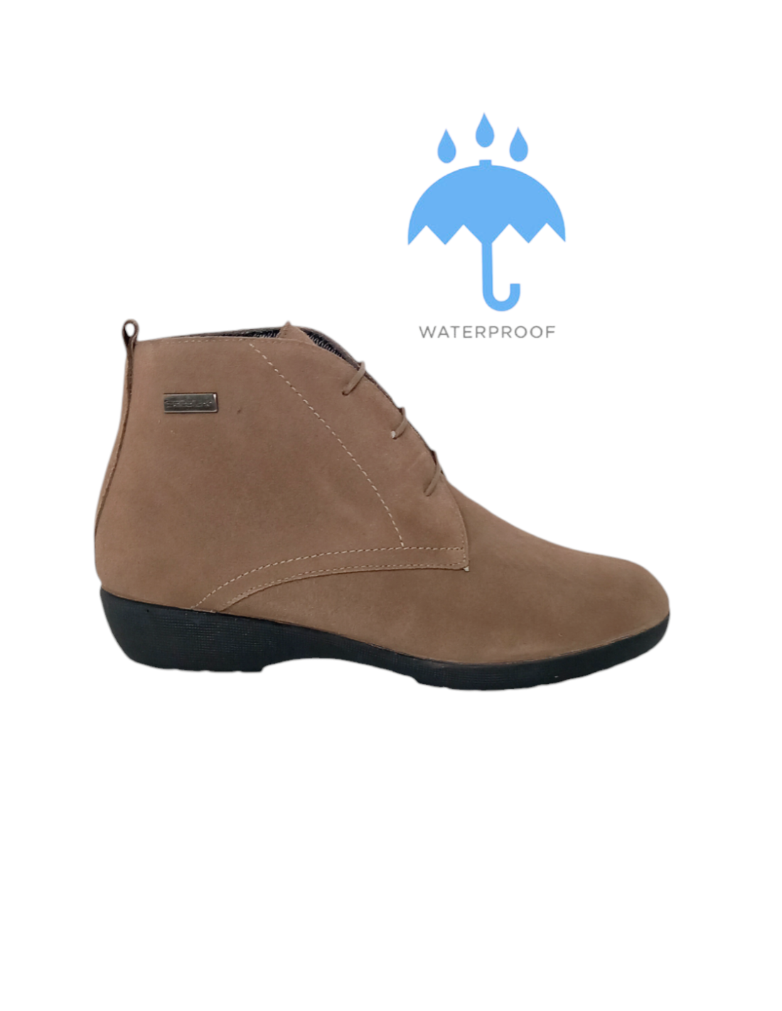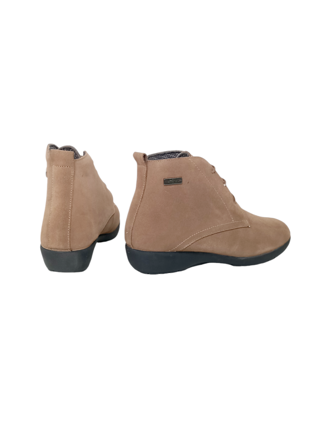Botín de horma ancha, fabricado en piel serraje hidrofugada en colores gris topo y negro.